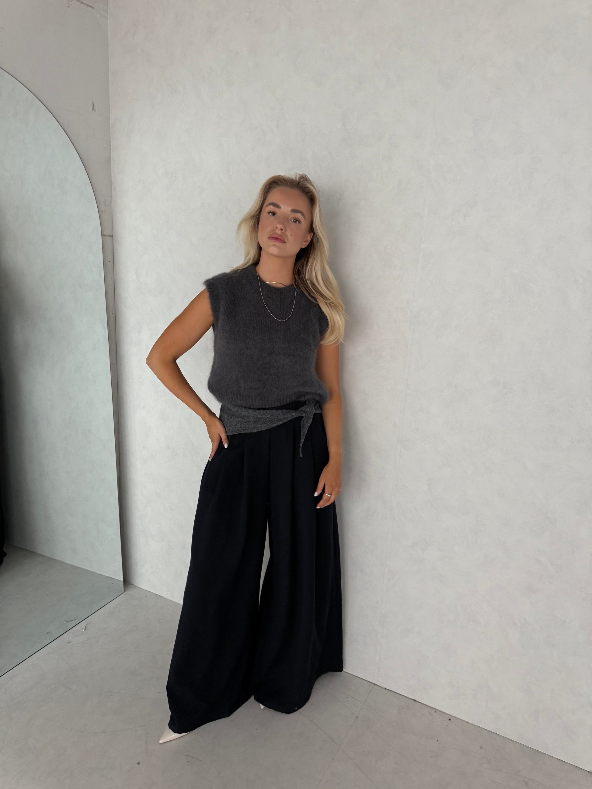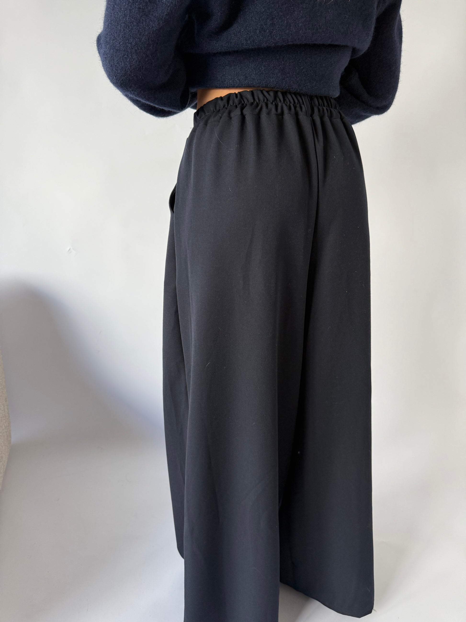 Deze lange, wijde pantalon in diep donkerblauwe kleur combineert elegantie met ultiem draagcomfort. De vloeiende pasvorm creëert een sierlijk silhouet, terwijl de elastische band aan de achterzijde zorgt voor een perfecte aansluiting en extra gemak.