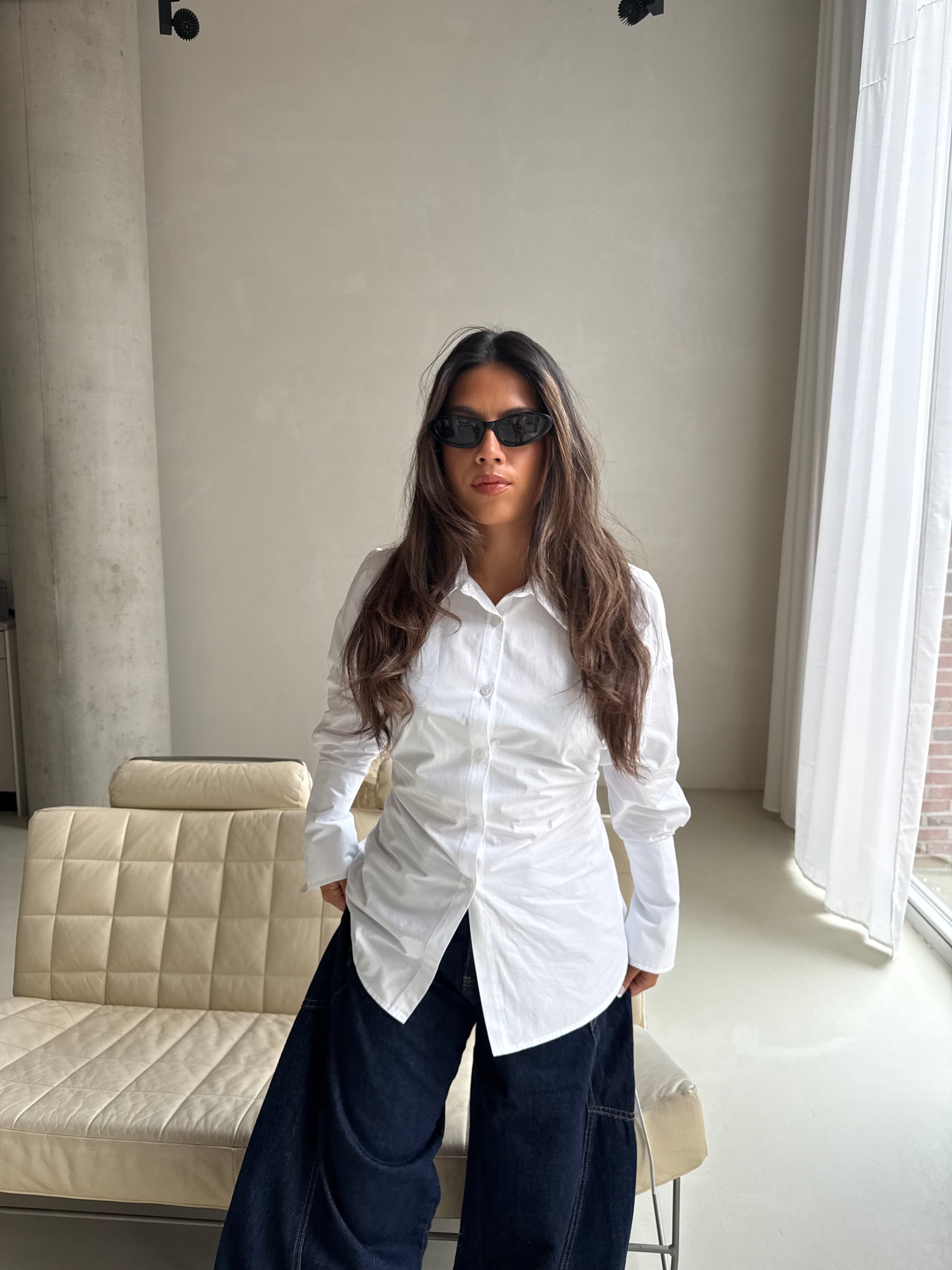 Witte blouse met een verrassend detail op de rug. Minimalistisch van voren, uniek van achteren.