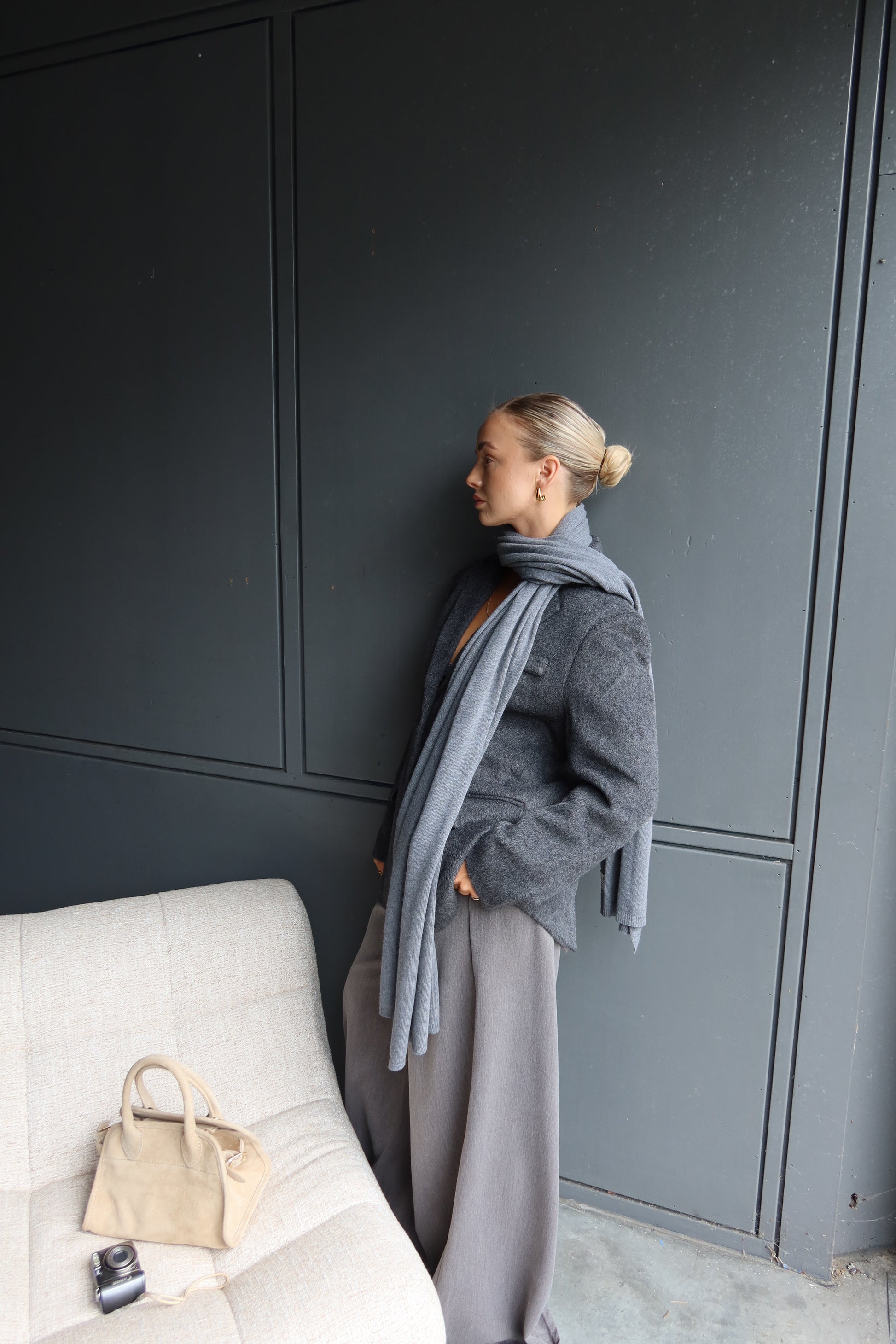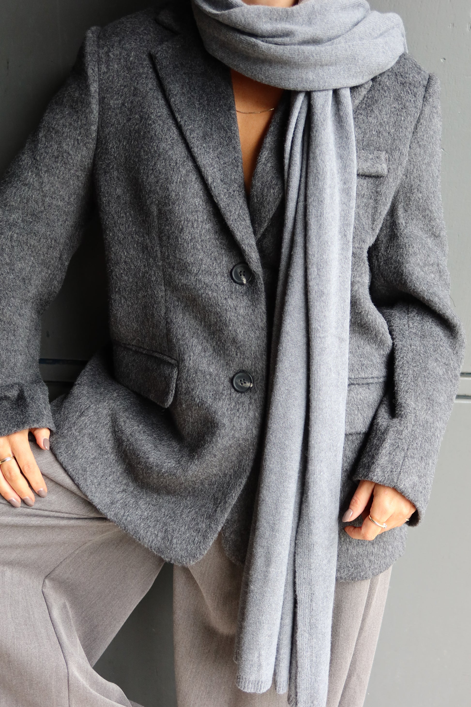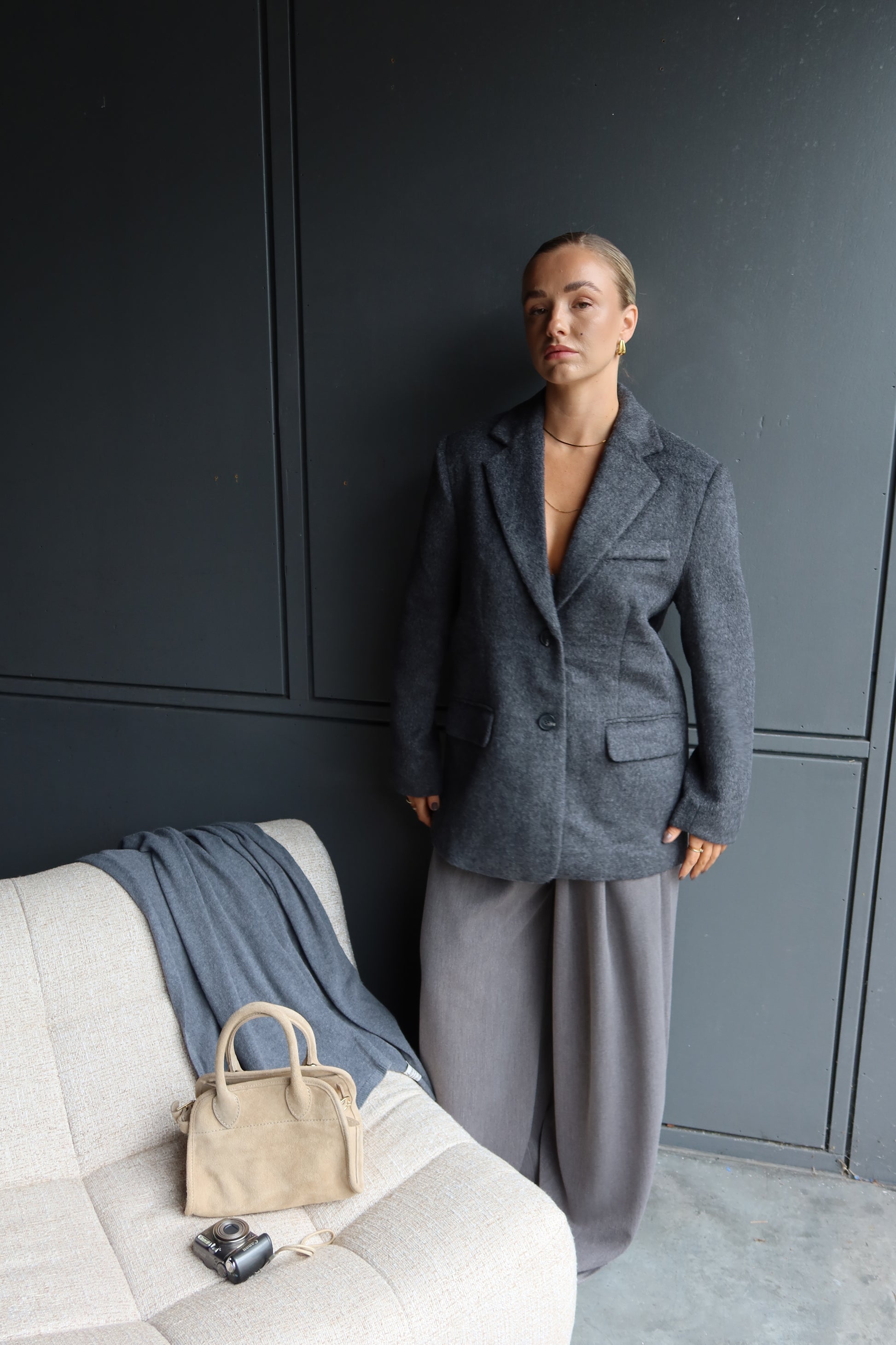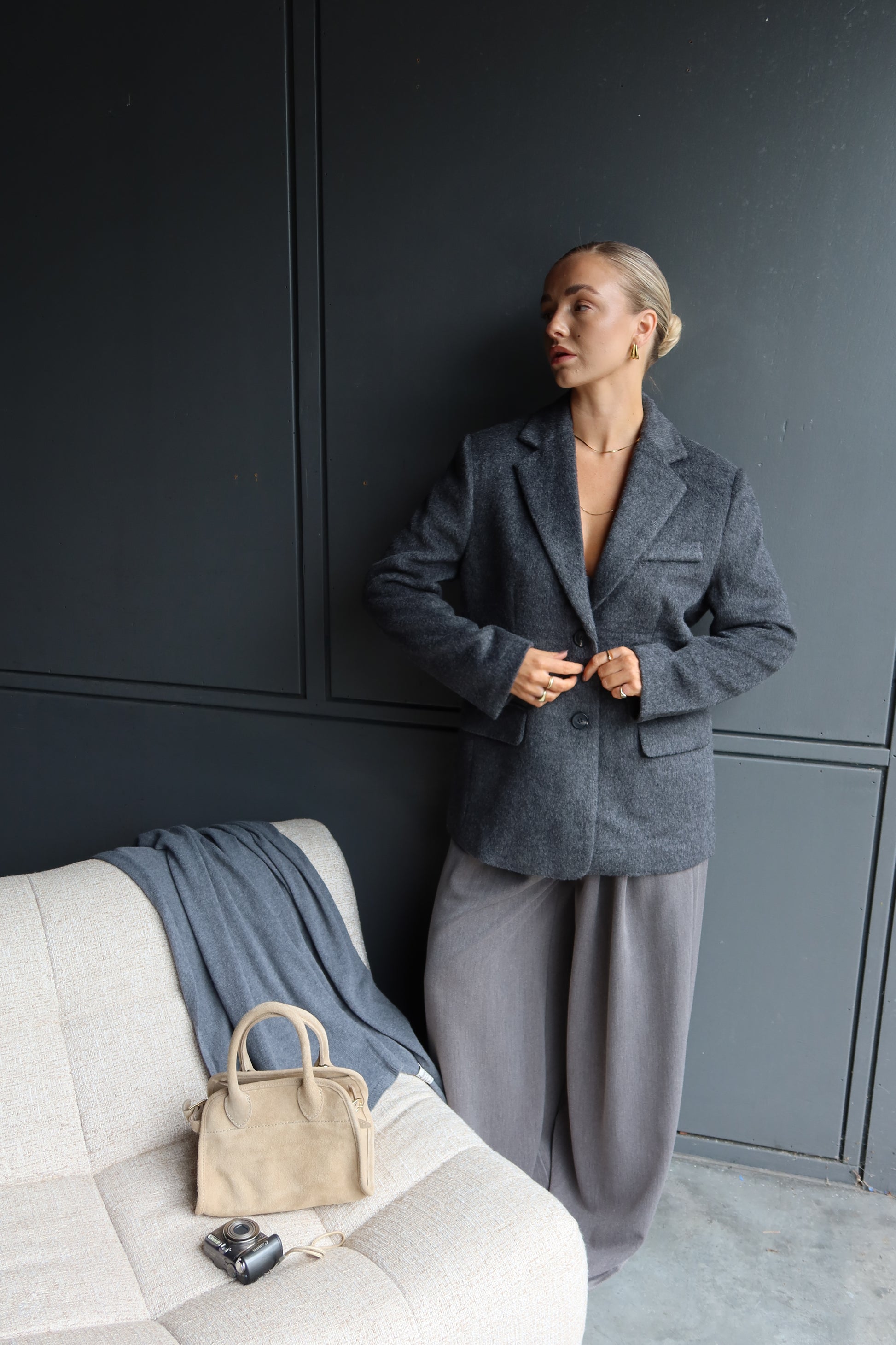 Dit wol-colbert voelt heerlijk zacht en luxe, met tijdloze tinten in beige en grijs die bij alles passen. Het klassieke silhouet krijgt een speelse twist door de lichte structuur van de stof, waardoor je look direct stylish en nonchalant tegelijk is.