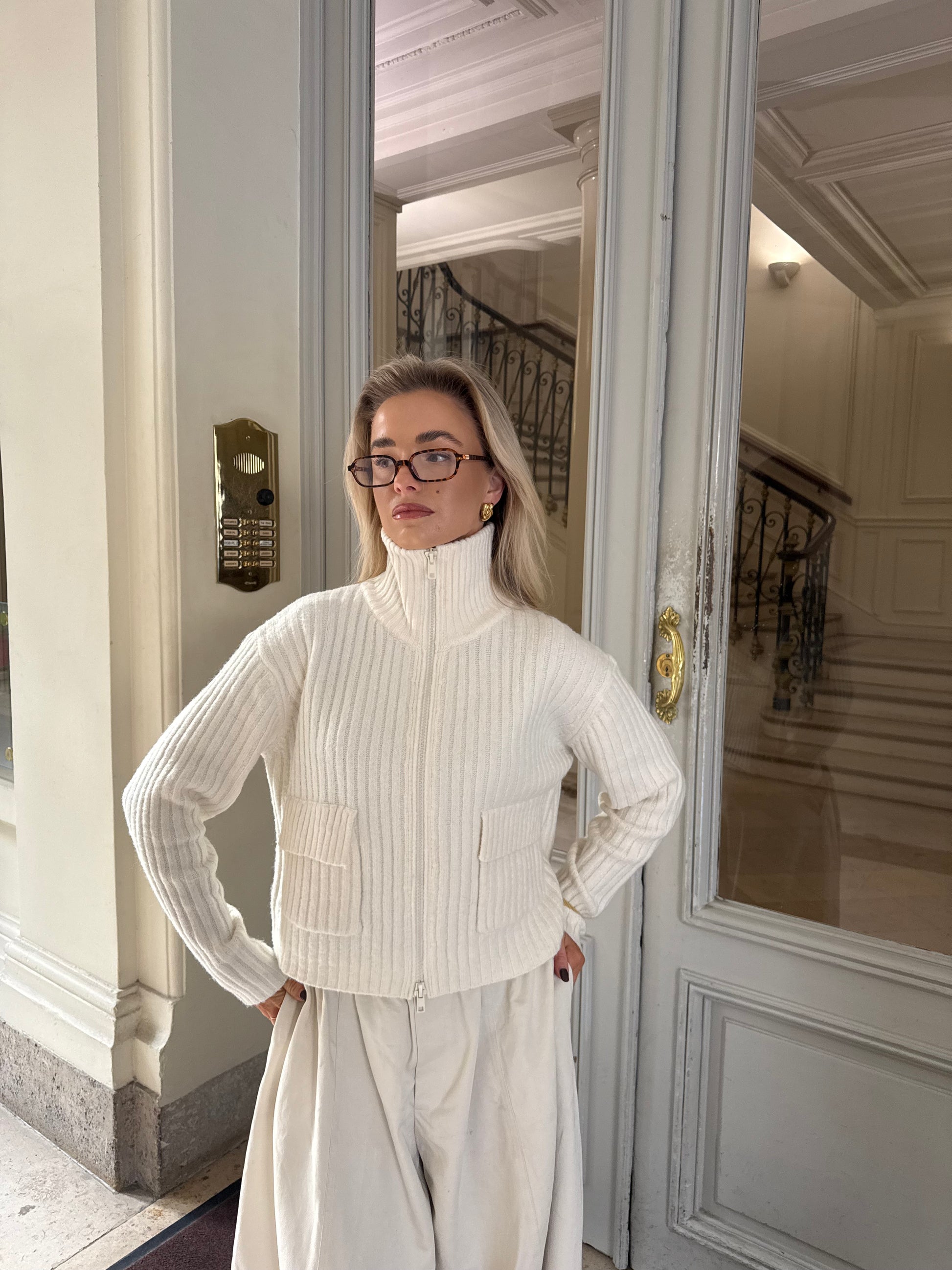 Een kort crèmekleurig vest met een leuke zipper als detail. Het zachte materiaal en het compacte model maken het een fijn item om makkelijk over elke outfit te dragen.