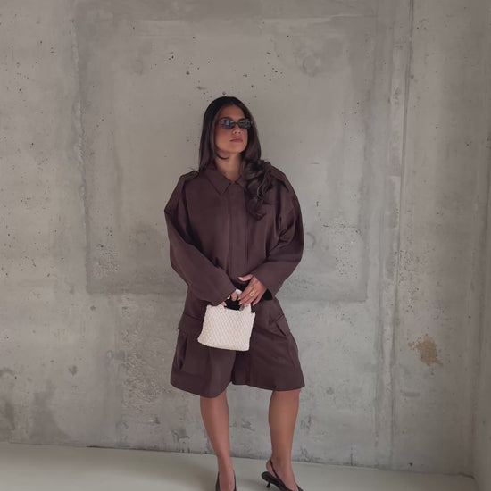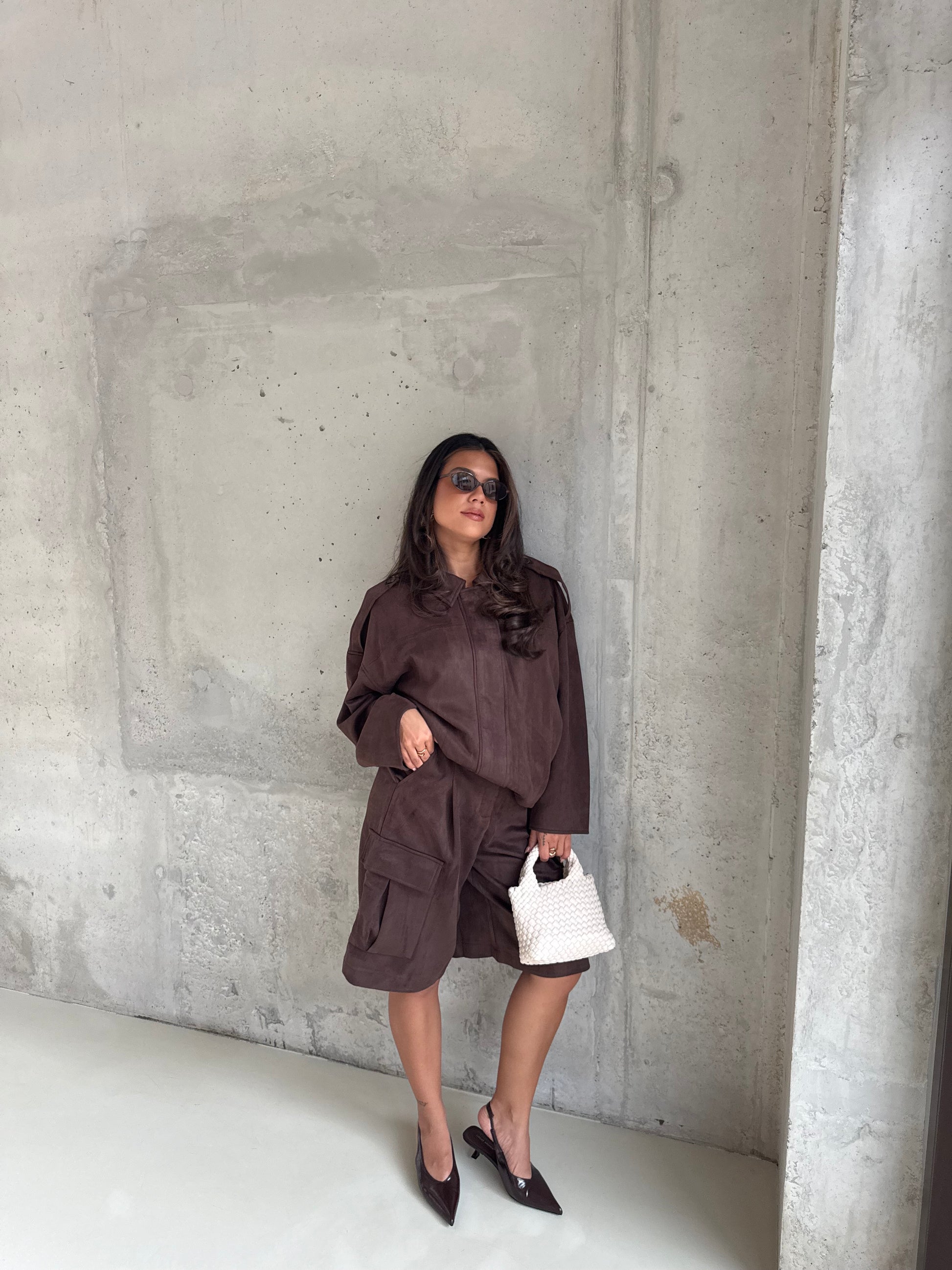 Say hallo tegen je nieuwe favorite jacket. Deze suède bomber in rich chocolate brown is alles wat je nodig hebt voor die effortlessly cool look. Zacht, comfortabel en mega stijlvol! Gooi ‘m over een witte tee, jeans of style hem af met onze bijpassende korte suede broekje en you're good to go. Bomber vibes met een luxe feel.