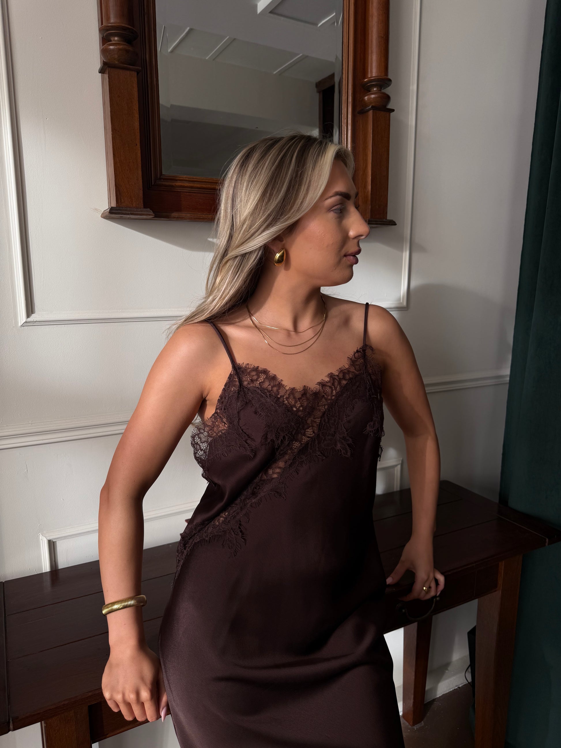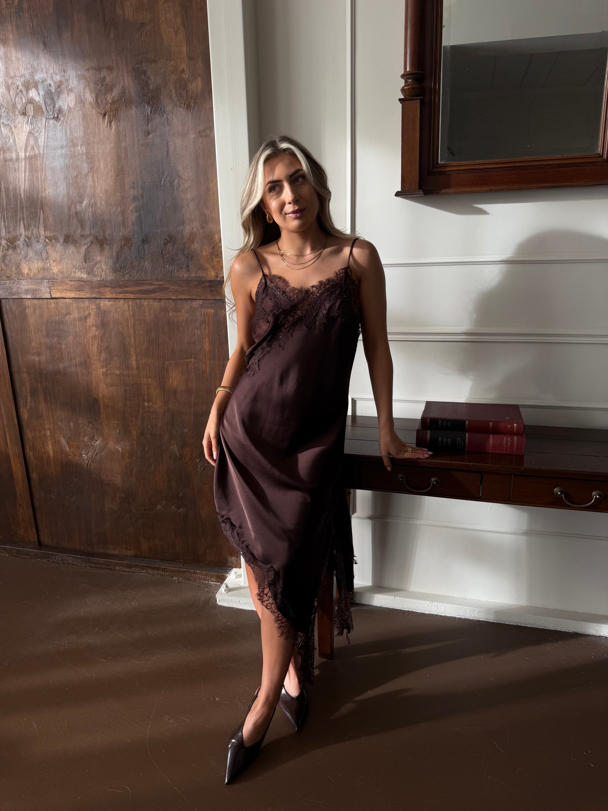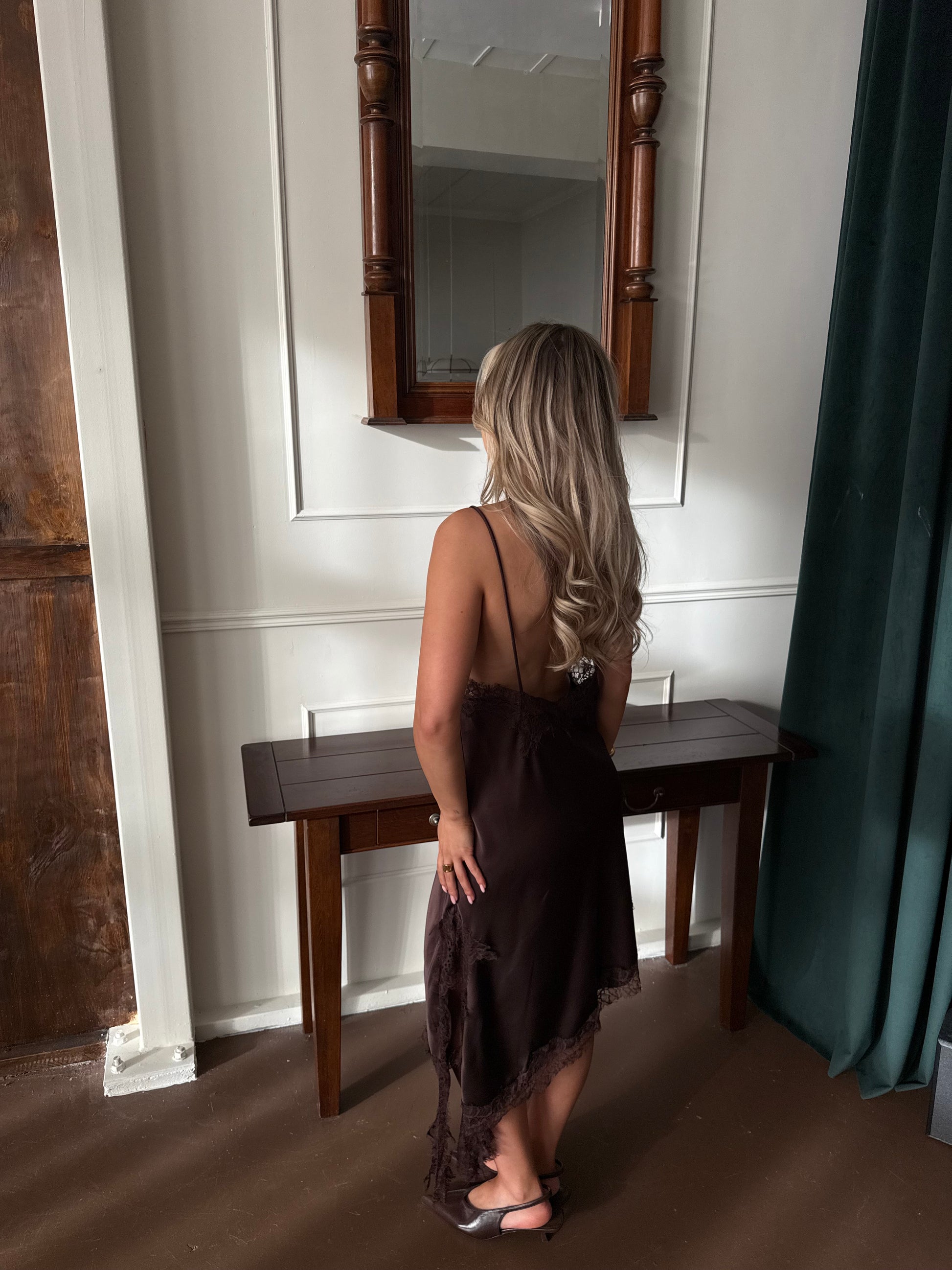 Deze bruine jurk heeft een elegant silhouet dat aan de zijkanten iets langer uitloopt, waardoor hij mooi en soepel om het lichaam valt. Het subtiele kanten detail aan de zijkant geeft een fijne, luxe touch zonder te overheersen.