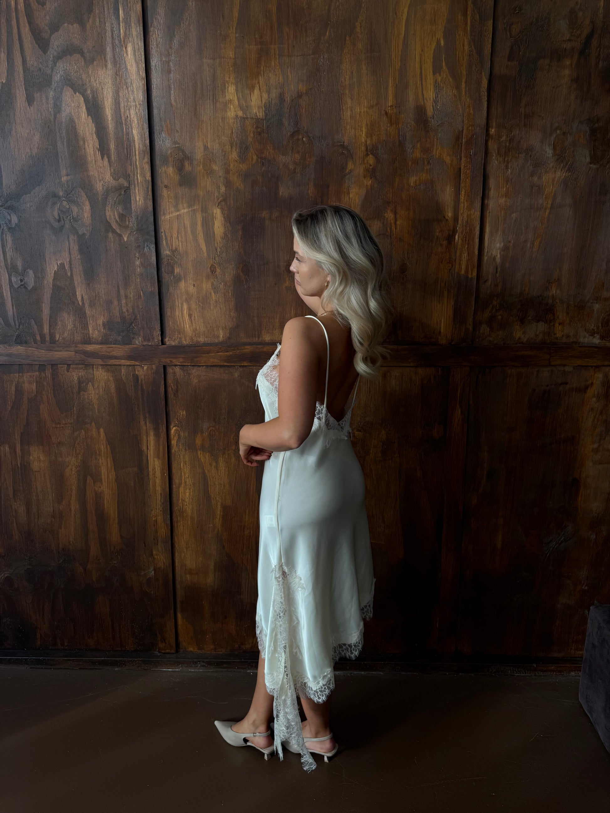 Aan de achterkant is de jurk iets meer open, wat een zachte, stijlvolle vorm van elegantie en vrouwelijkheid toevoegt. Een tijdloze keuze voor een chique gelegenheid, waarbij eenvoud en verfijning samenkomen.