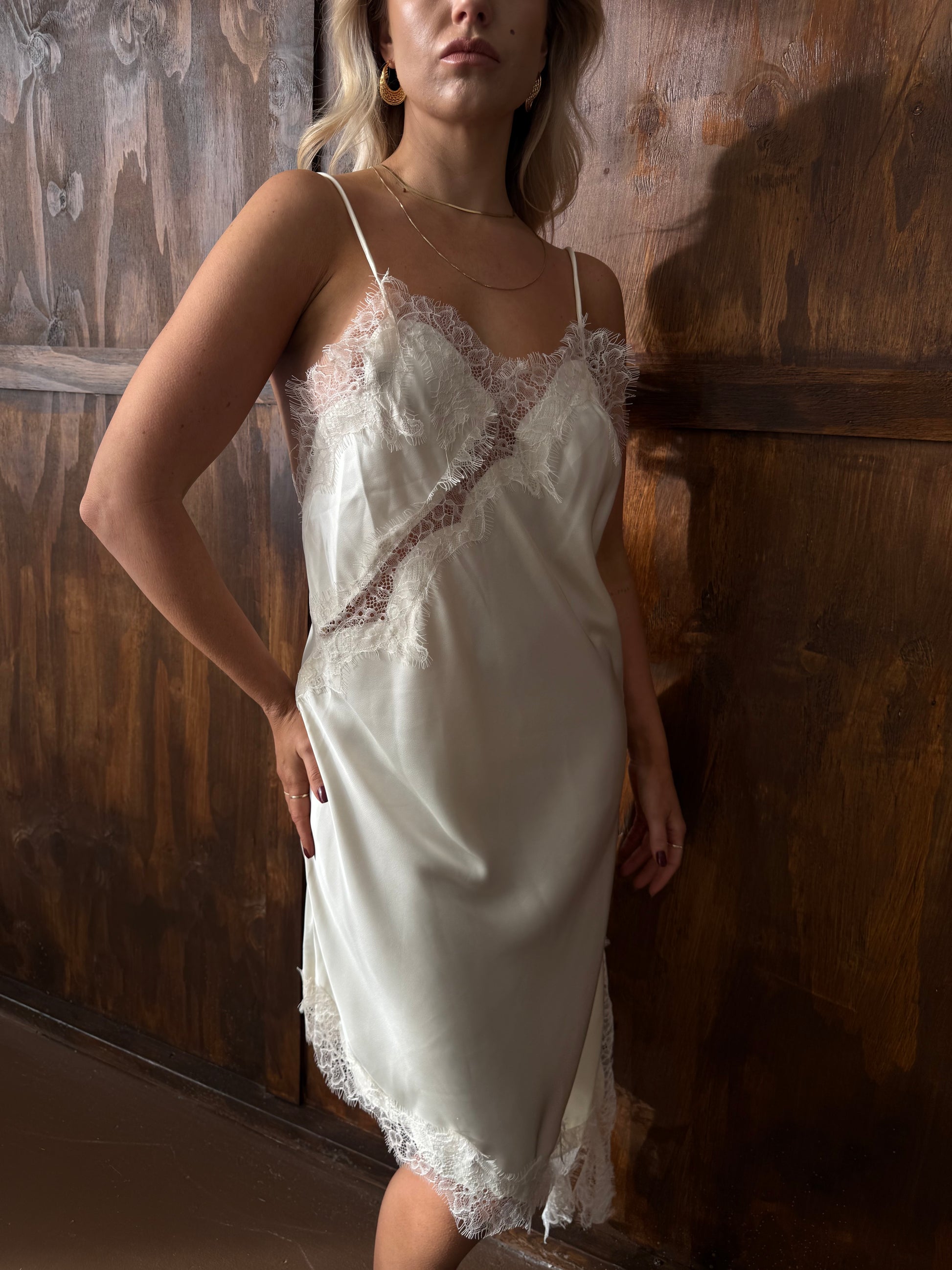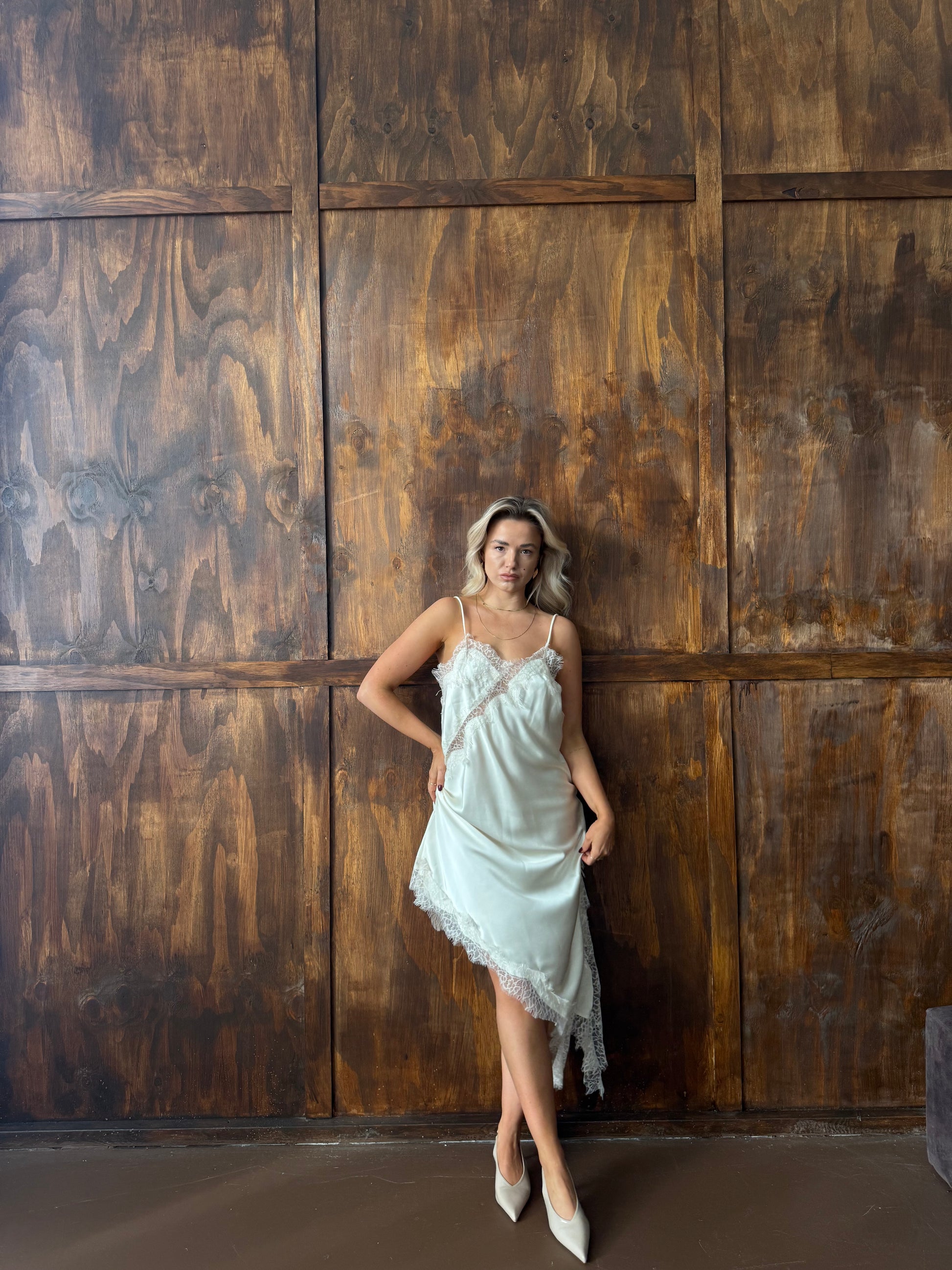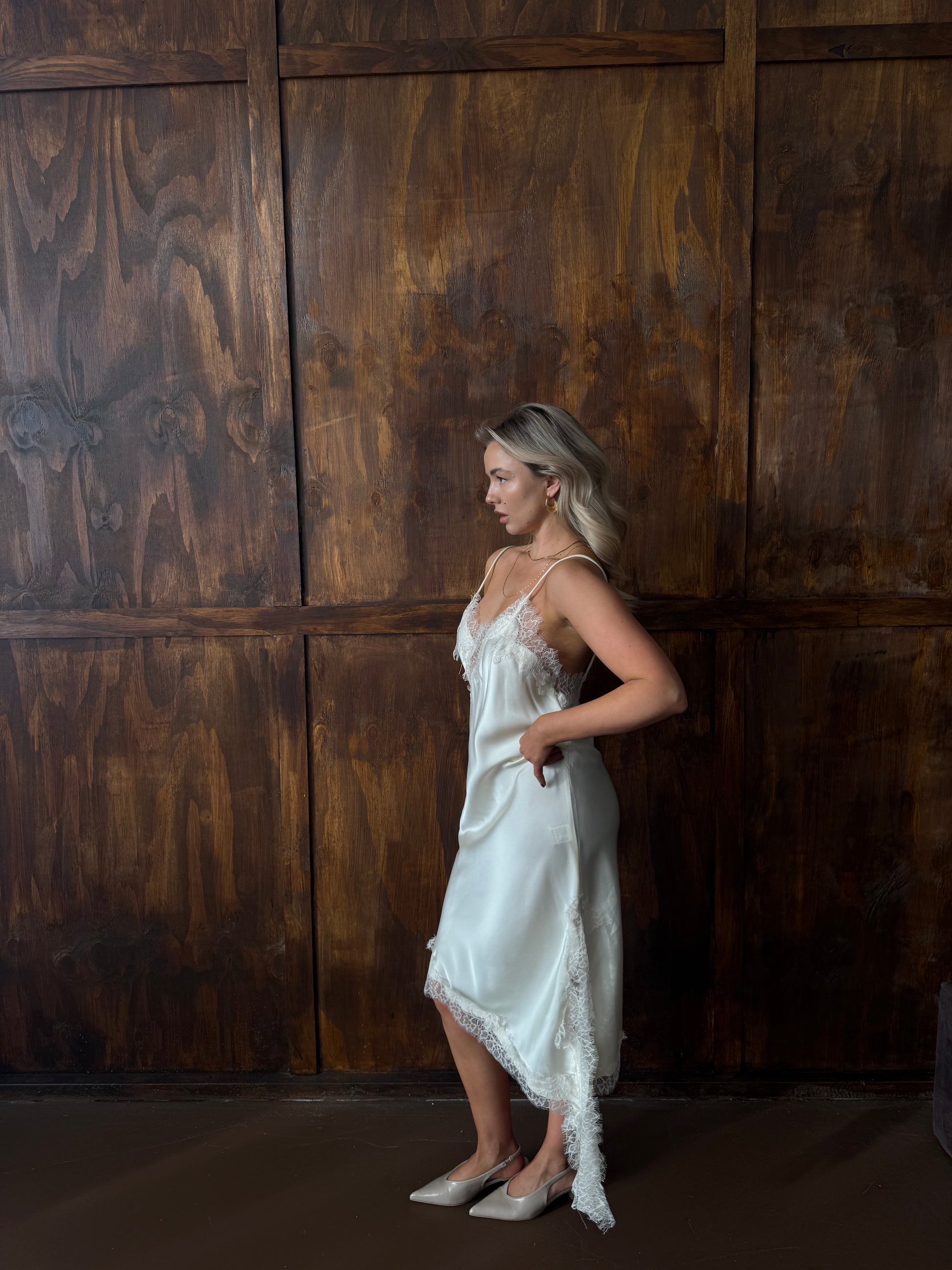 Deze crème jurk heeft een elegant silhouet dat aan de zijkanten iets langer uitloopt, waardoor hij mooi en soepel om het lichaam valt. Het subtiele kanten detail aan de zijkant geeft een fijne, luxe touch zonder te overheersen.