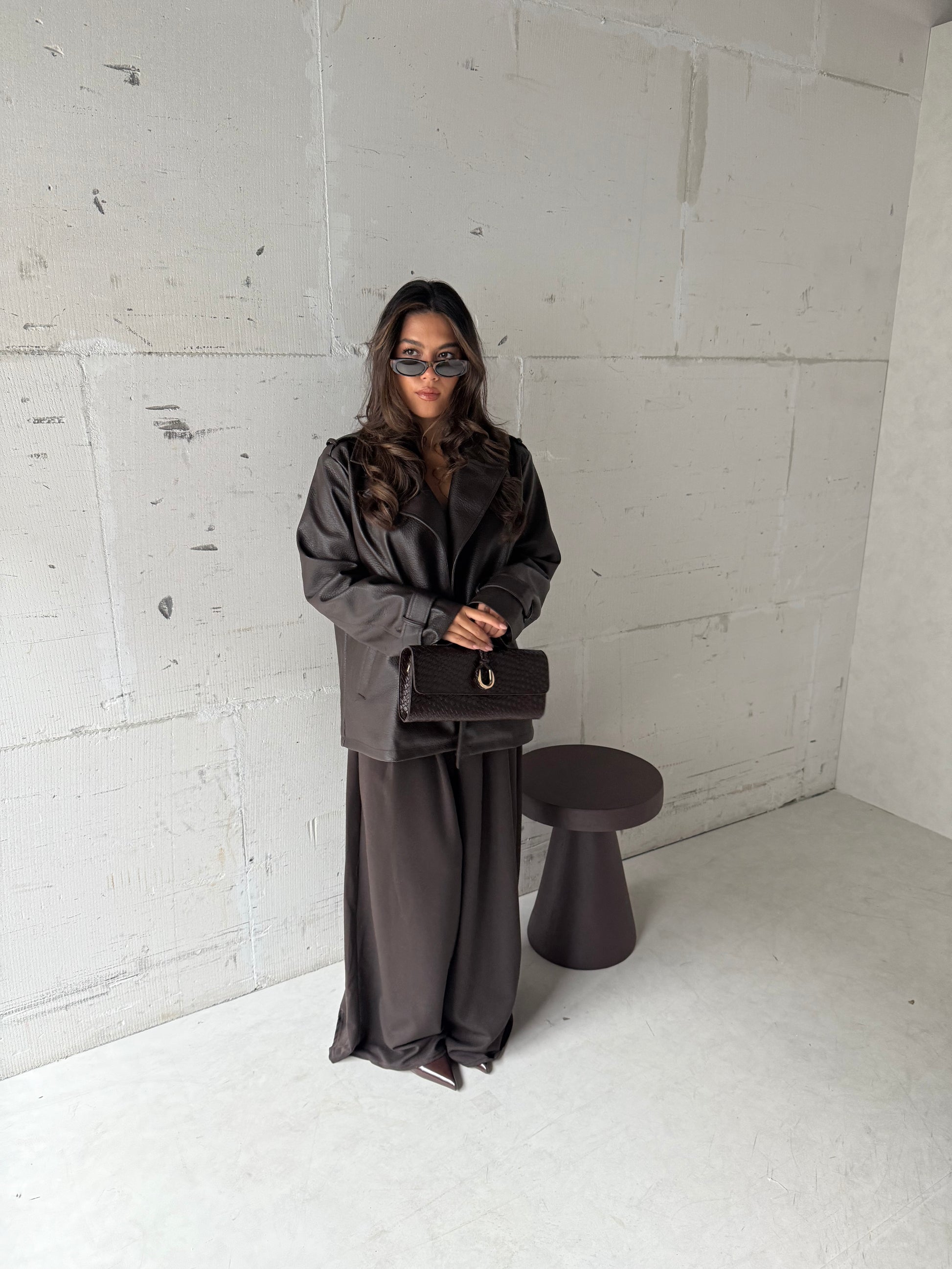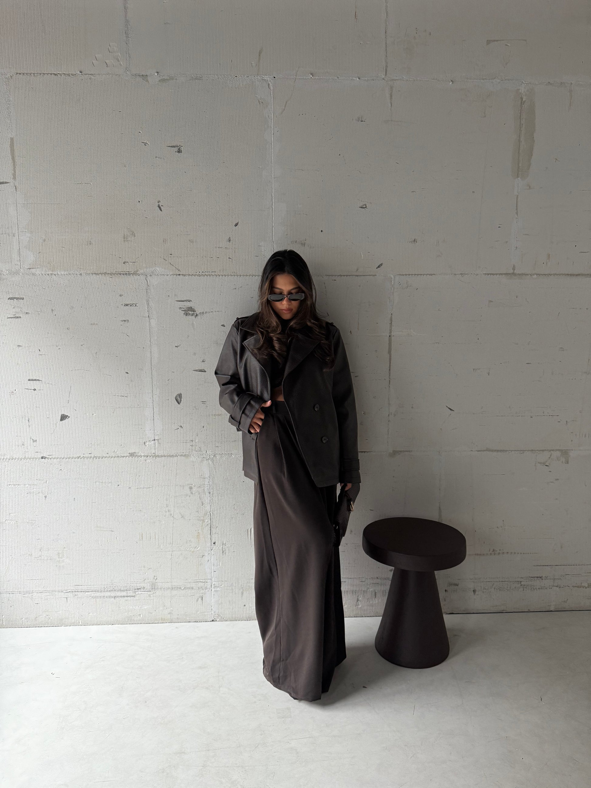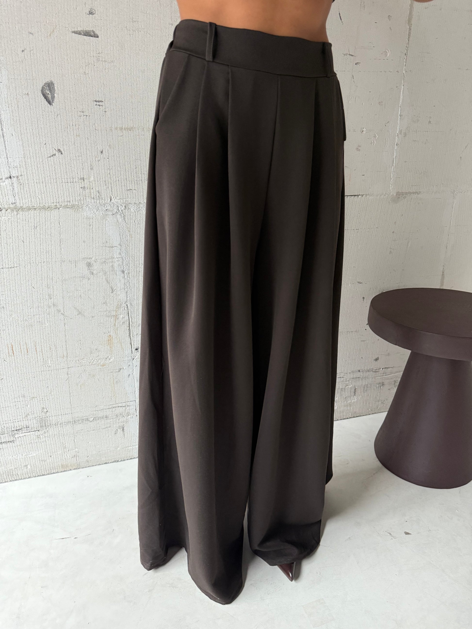 Deze lange, wijde pantalon in diep donkerbruin combineert elegantie met ultiem draagcomfort. De vloeiende pasvorm creëert een sierlijk silhouet, terwijl de elastische band aan de achterzijde zorgt voor een perfecte aansluiting en extra gemak.
