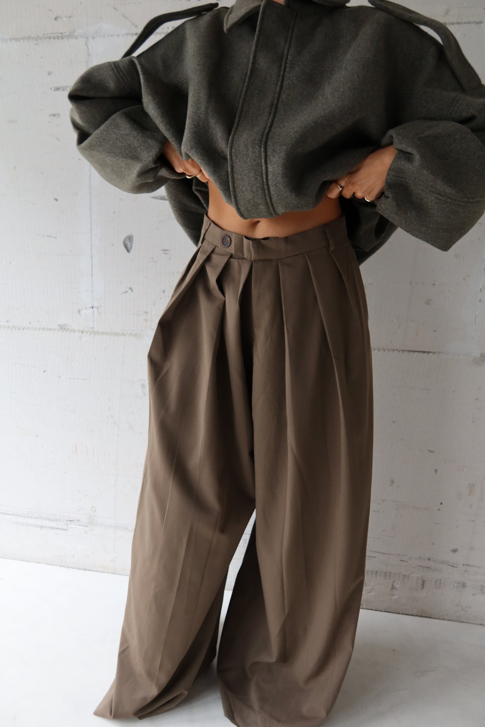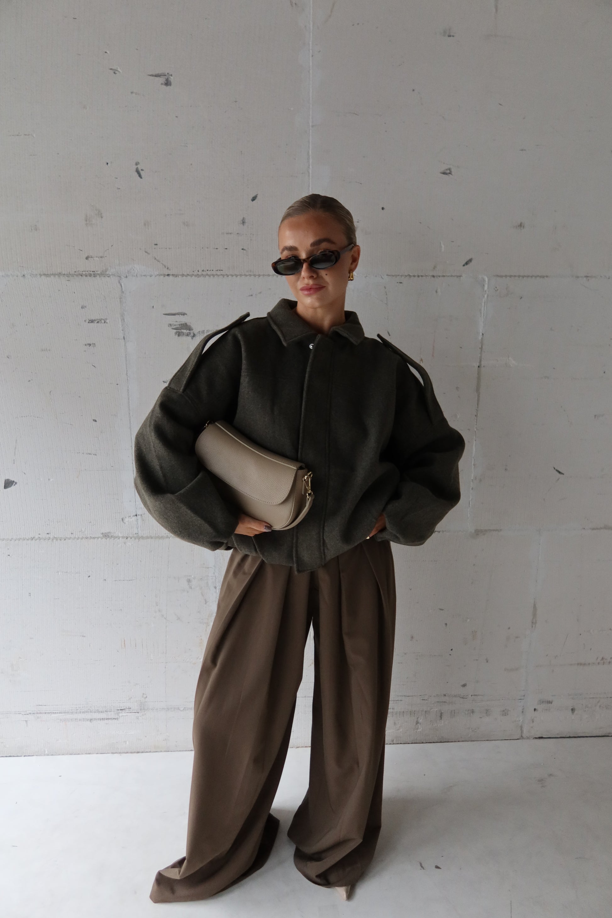Deze kaki pantalon combineert comfort met een elegante touch dankzij het subtiele knoopdetail bovenaan. De wijdvallende pasvorm geeft een nonchalante vibe, perfect om casual of juist iets chiquer te stylen.