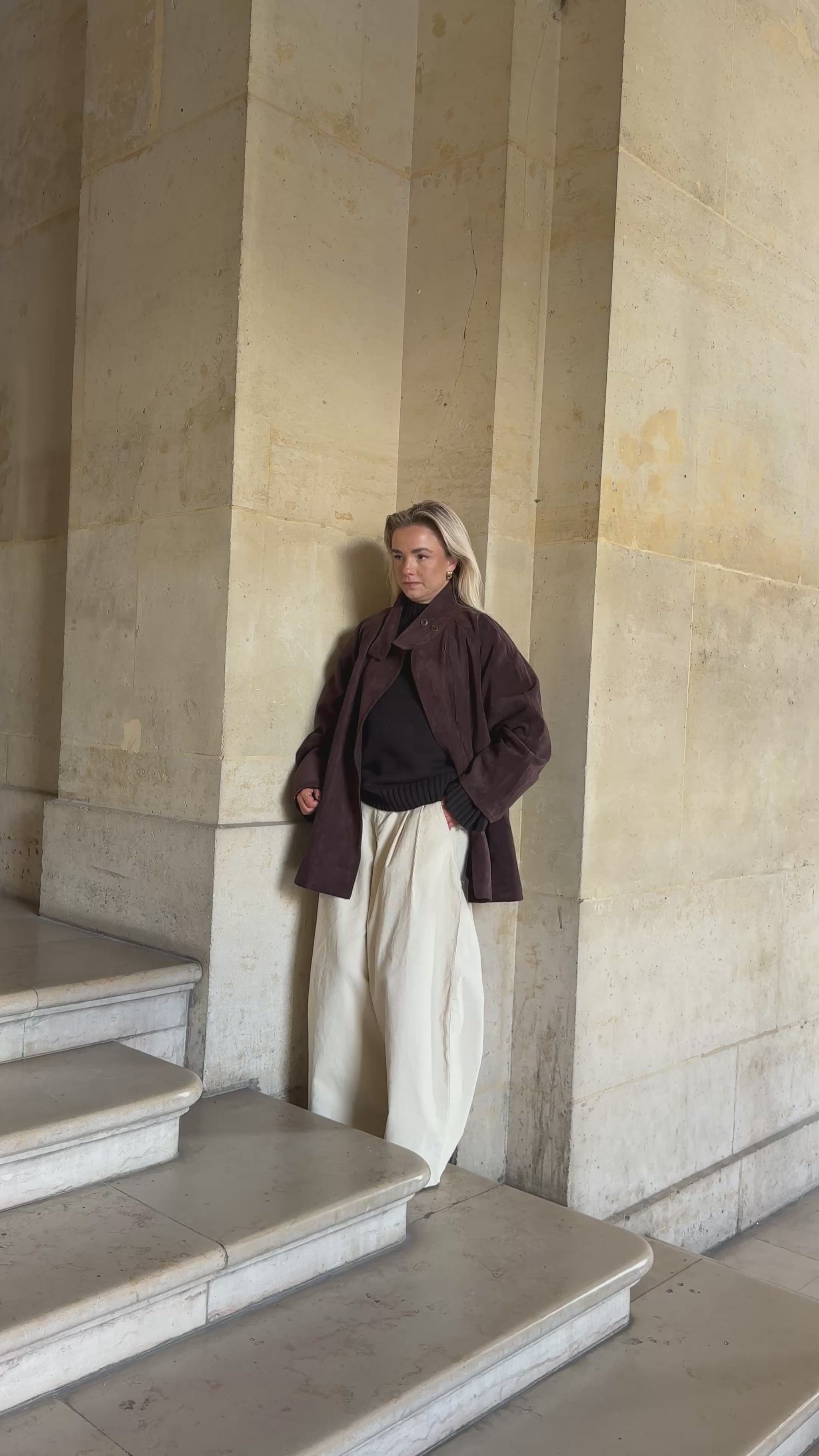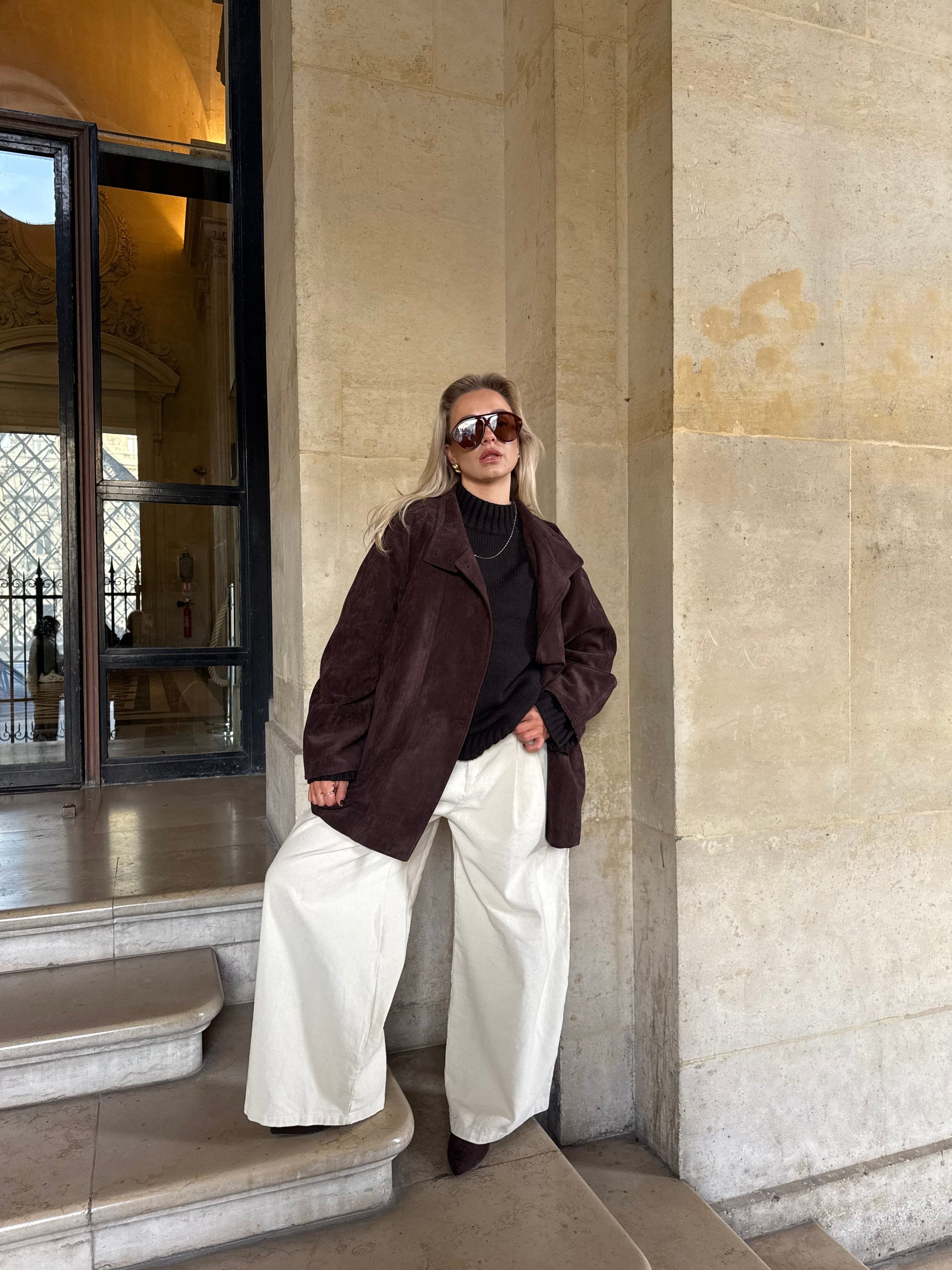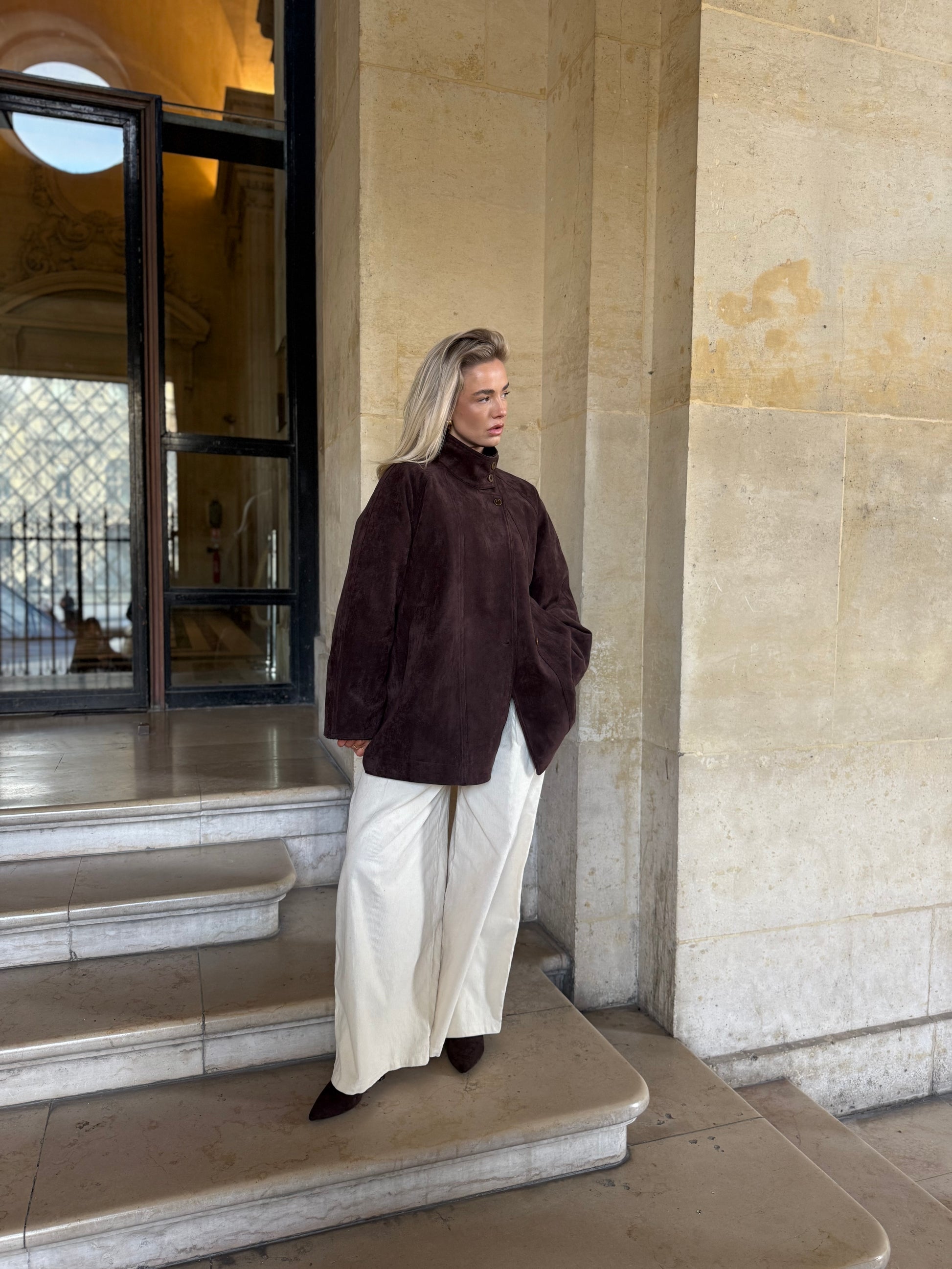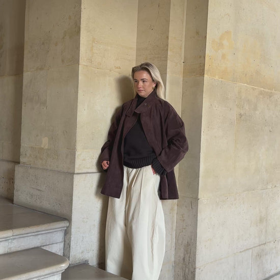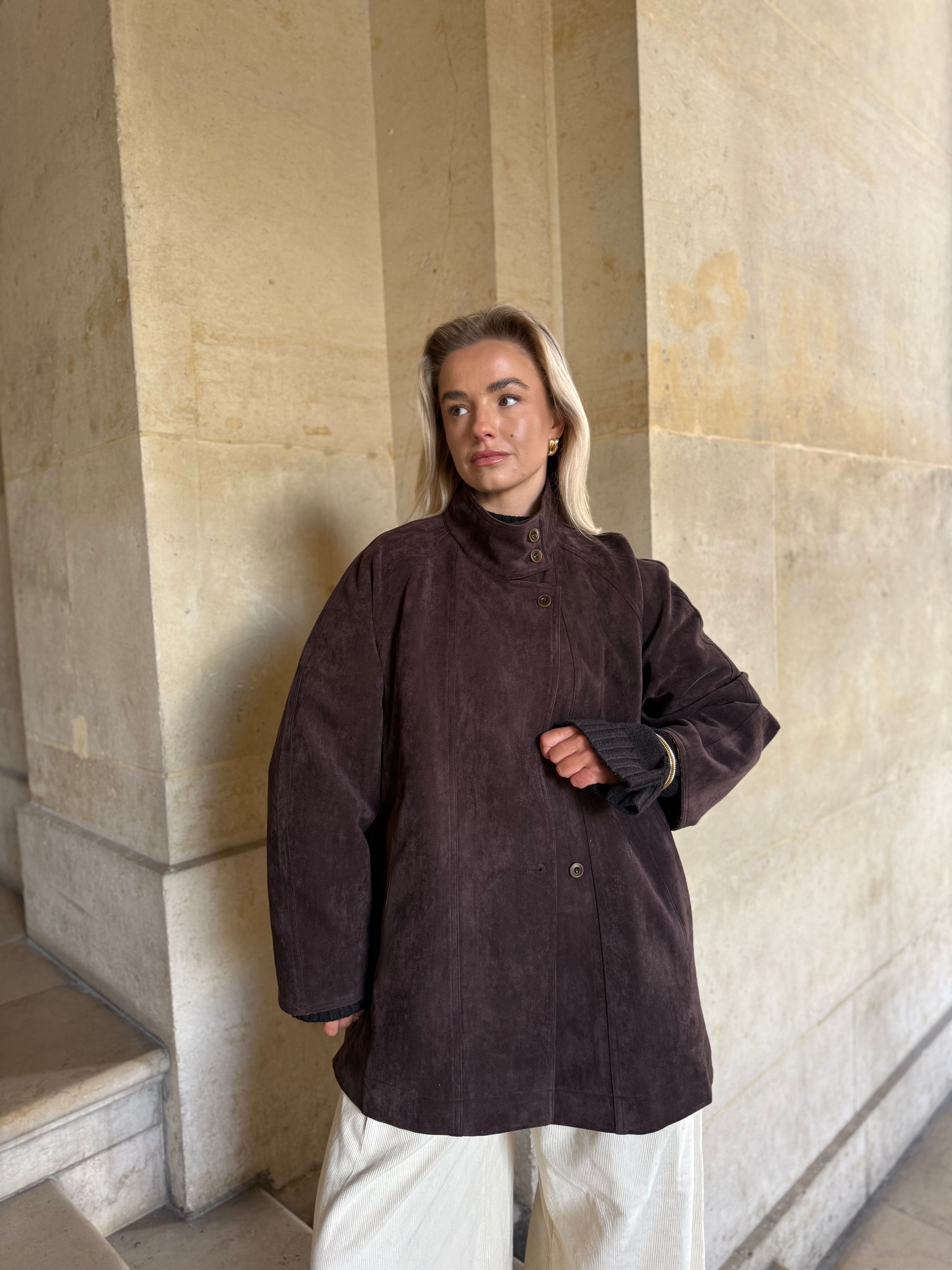 Deze suède bruine, iets langere jas straalt pure elegantie uit. Het subtiele knoopdetail voegt een verfijnde touch toe, terwijl de zachte stof en tijdloze kleur elke outfit moeiteloos chic maken.