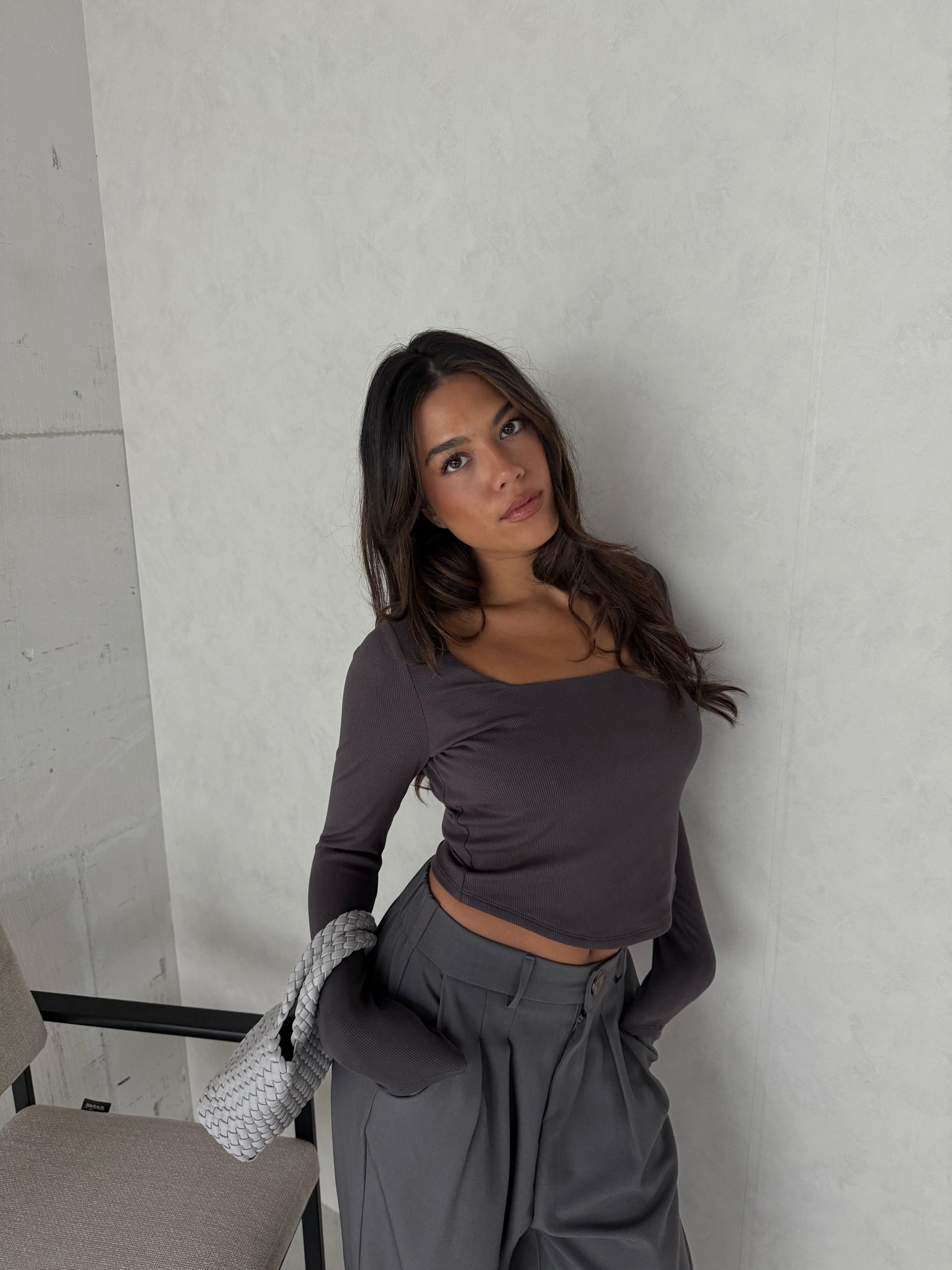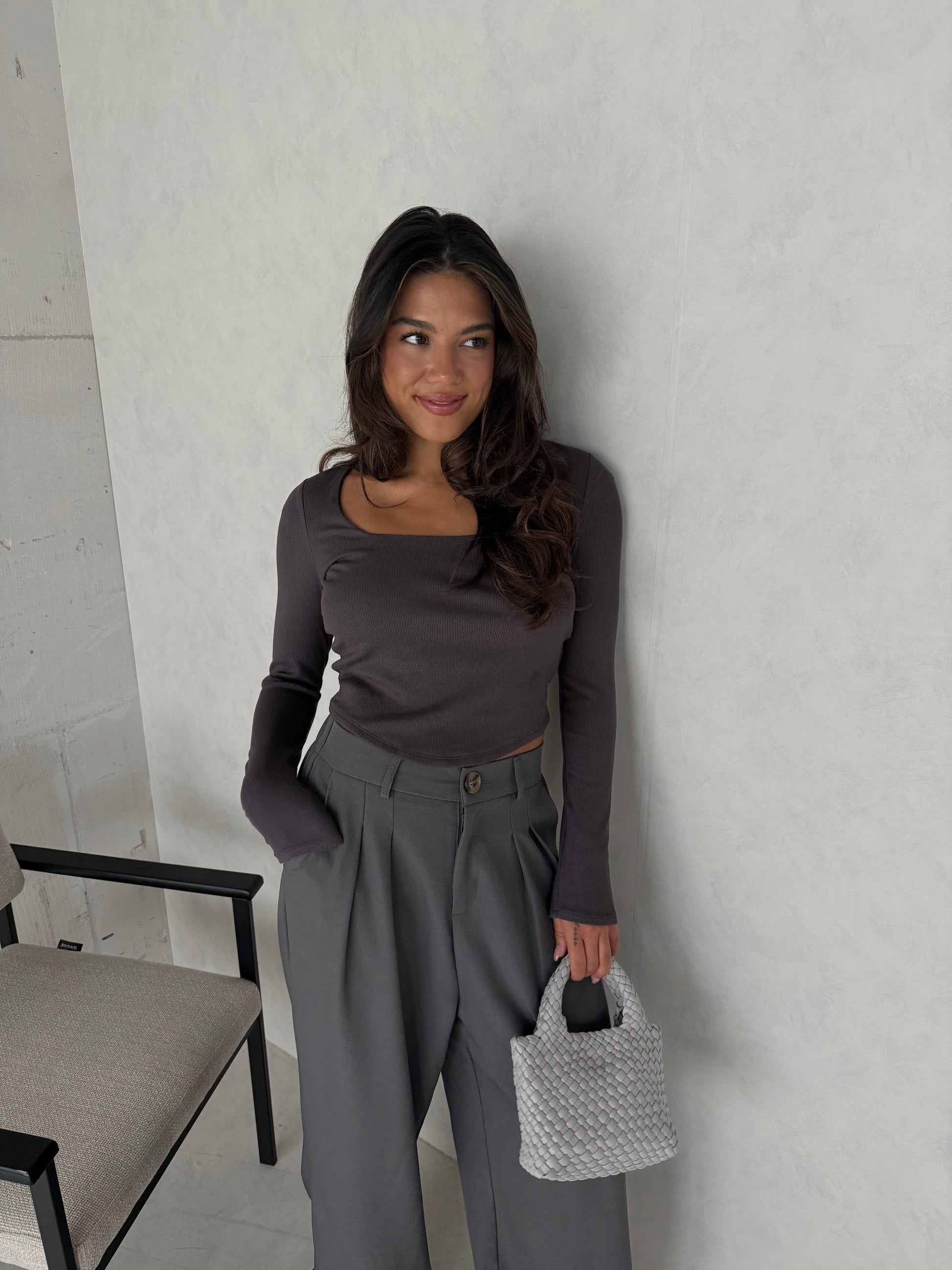 Deze stijlvolle grijze top onderscheidt zich door de subtiel afgeronde onderkant, wat zorgt voor een elegante en vloeiende pasvorm. Het zachte materiaal en de tijdloze kleur maken deze top tot een veelzijdig kledingstuk dat moeiteloos met diverse stijlen gecombineerd kan worden.