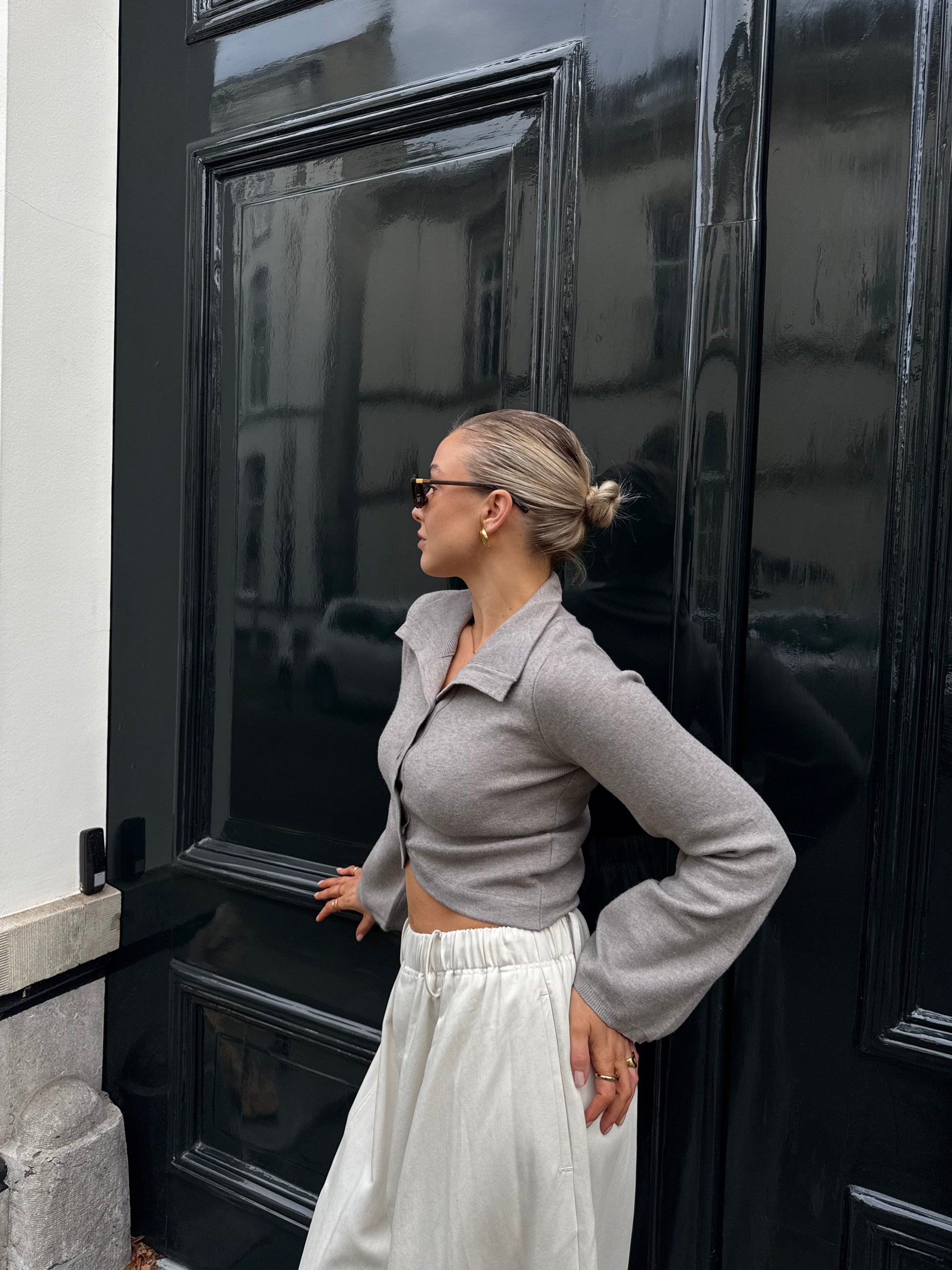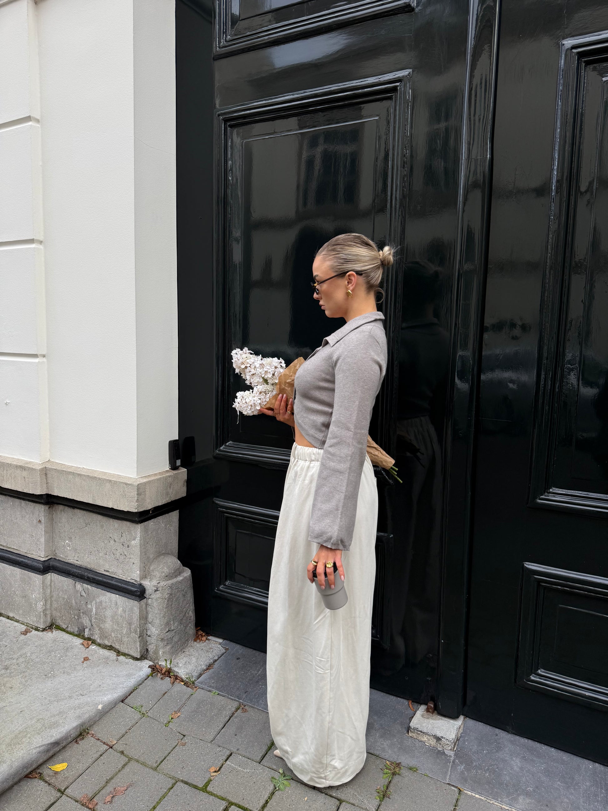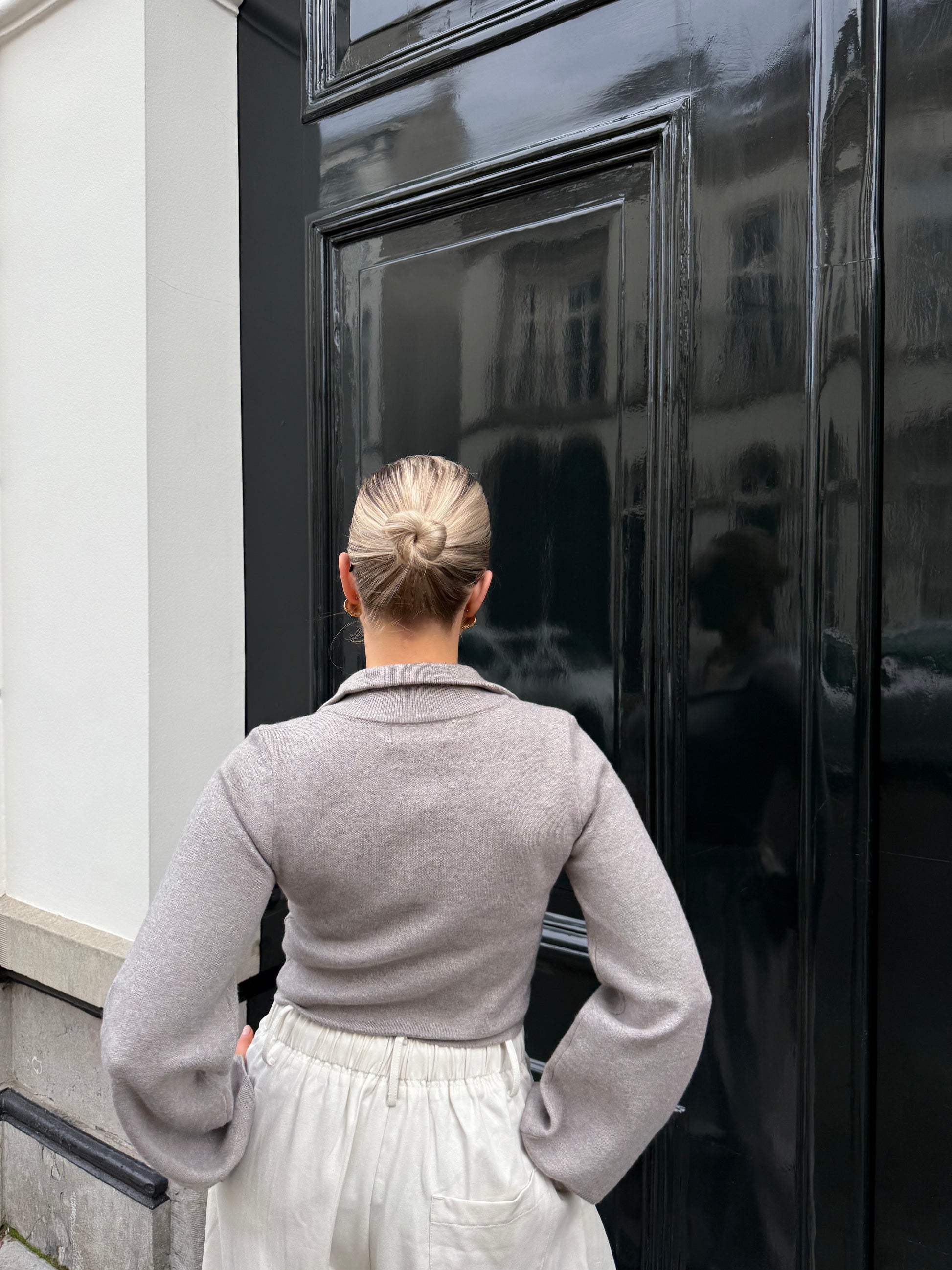 Deze grijze top heeft een moderne en verfijnde uitstraling. De uitlopende mouwen geven het item een speels en elegant detail. De top valt aan de kleine kant, waardoor we adviseren je eigen maat goed te checken voor de gewenste fit.