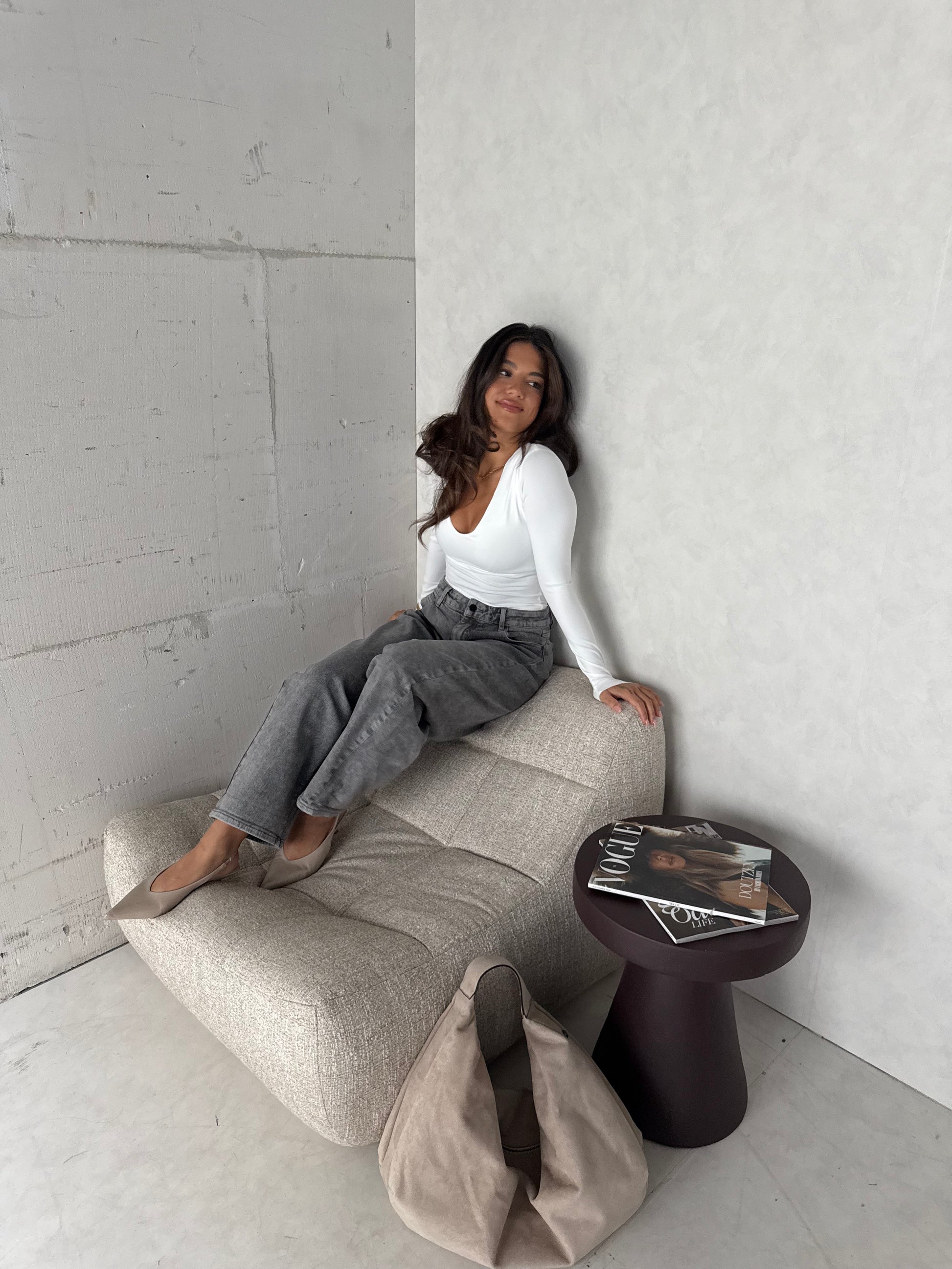 De lichte V-hals geeft een elegante en vrouwelijke touch, terwijl de tijdloze witte kleur de top eindeloos combineerbaar maakt