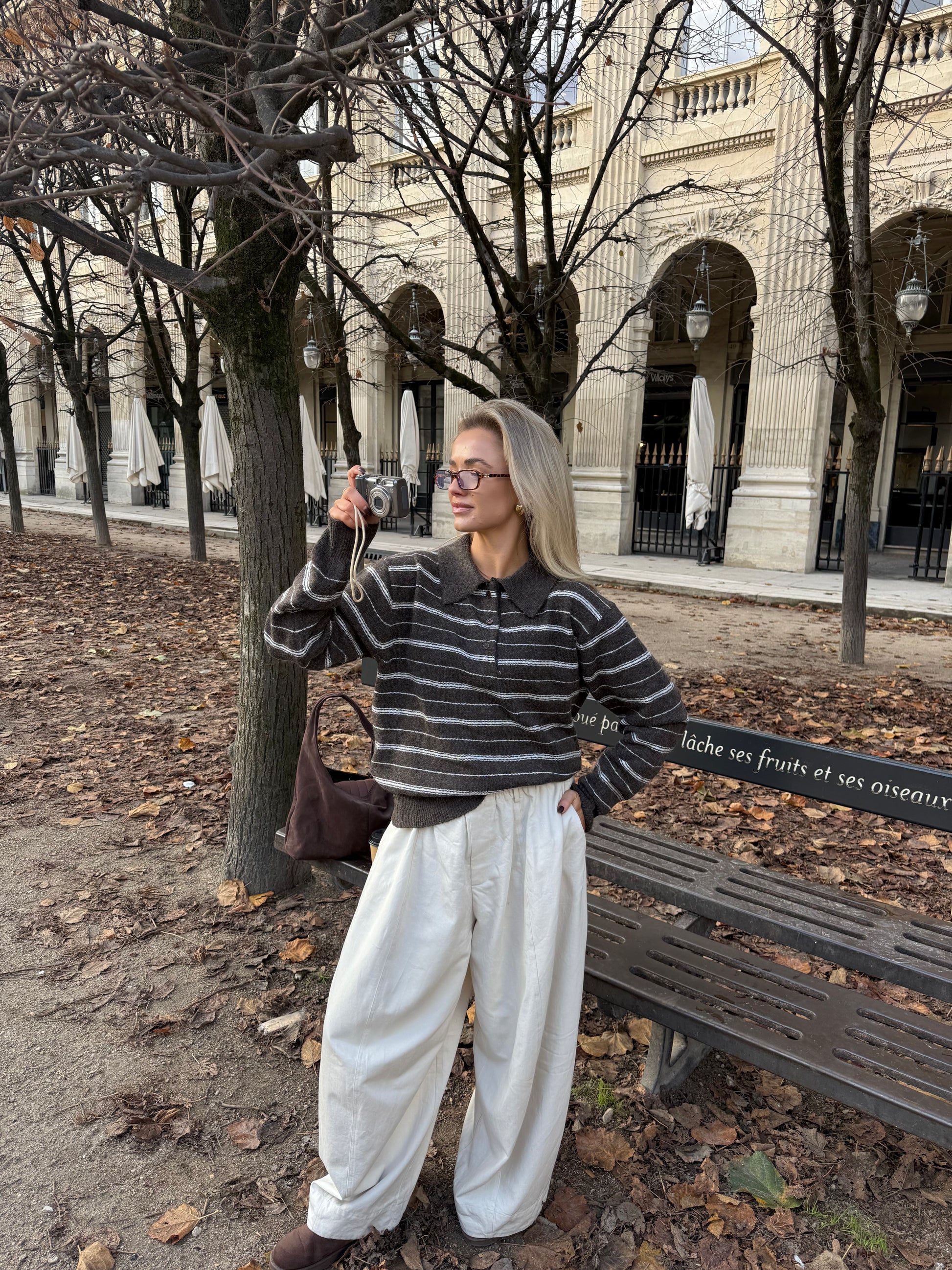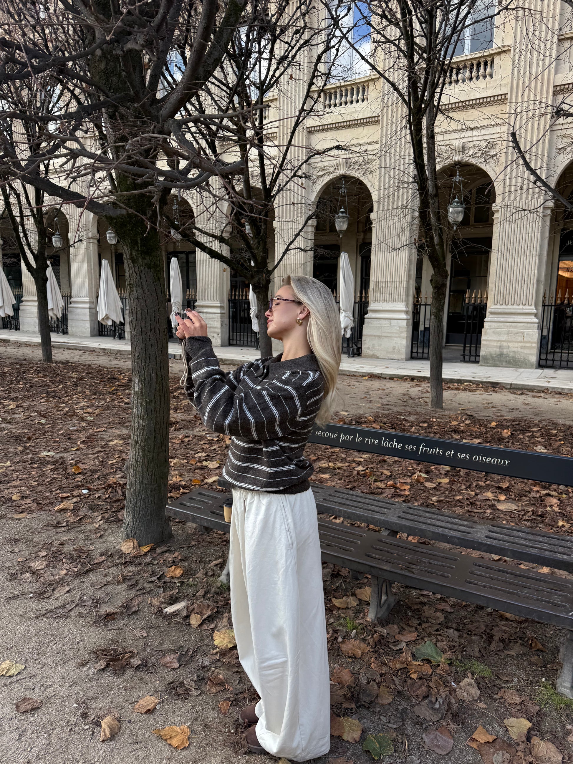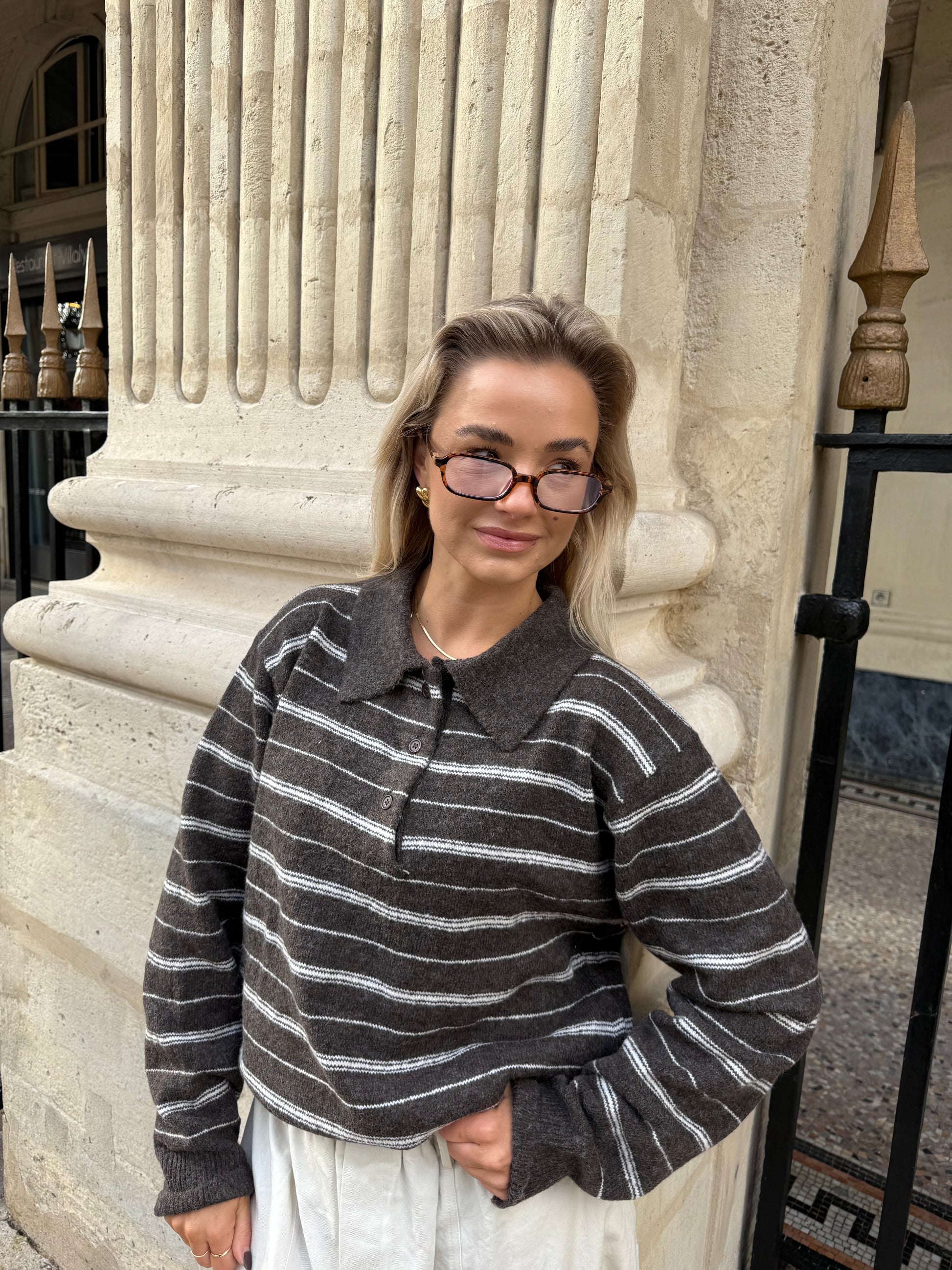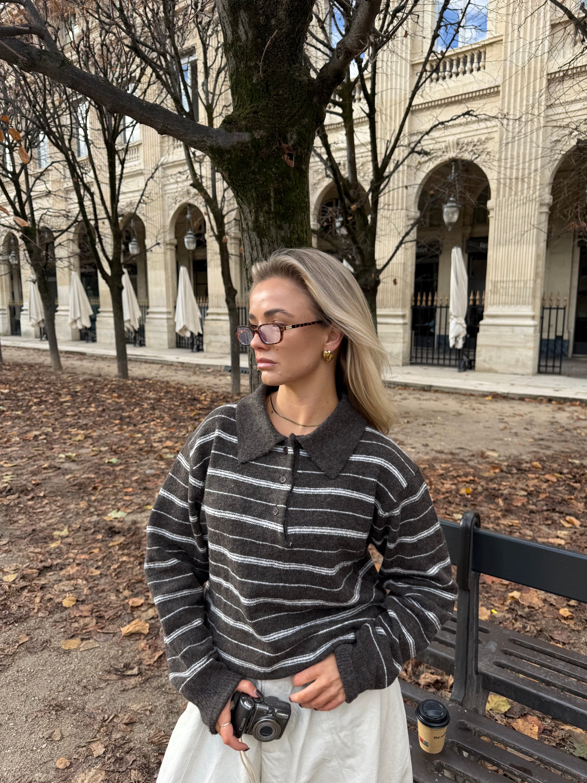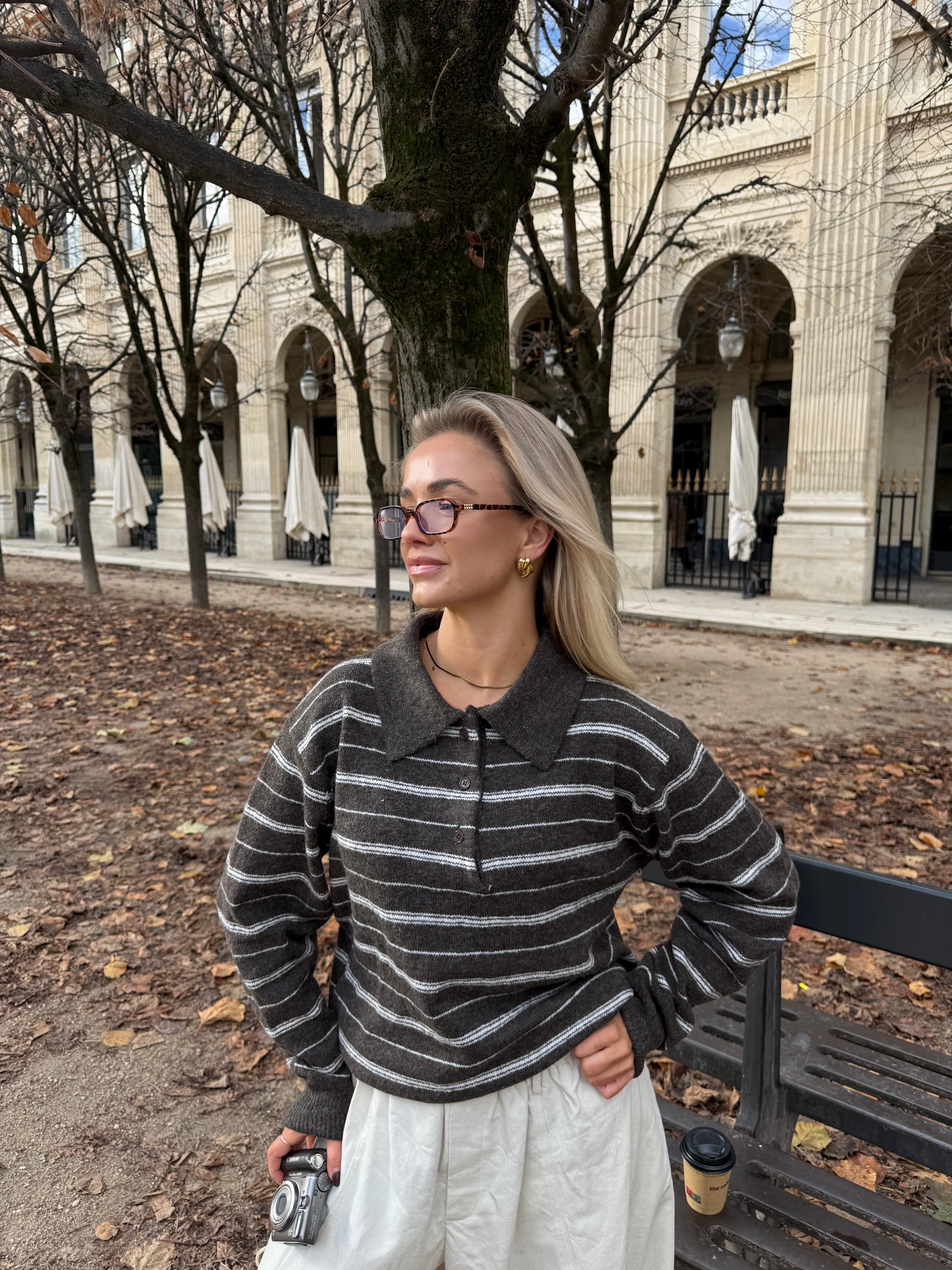 Deze chique trui is stijlvol afgewerkt met subtiele streepjes en een knoopdetail dat de look net wat specialer maakt. De trui voelt zacht aan, valt mooi en is ideaal voor zowel nette als casual outfits.
