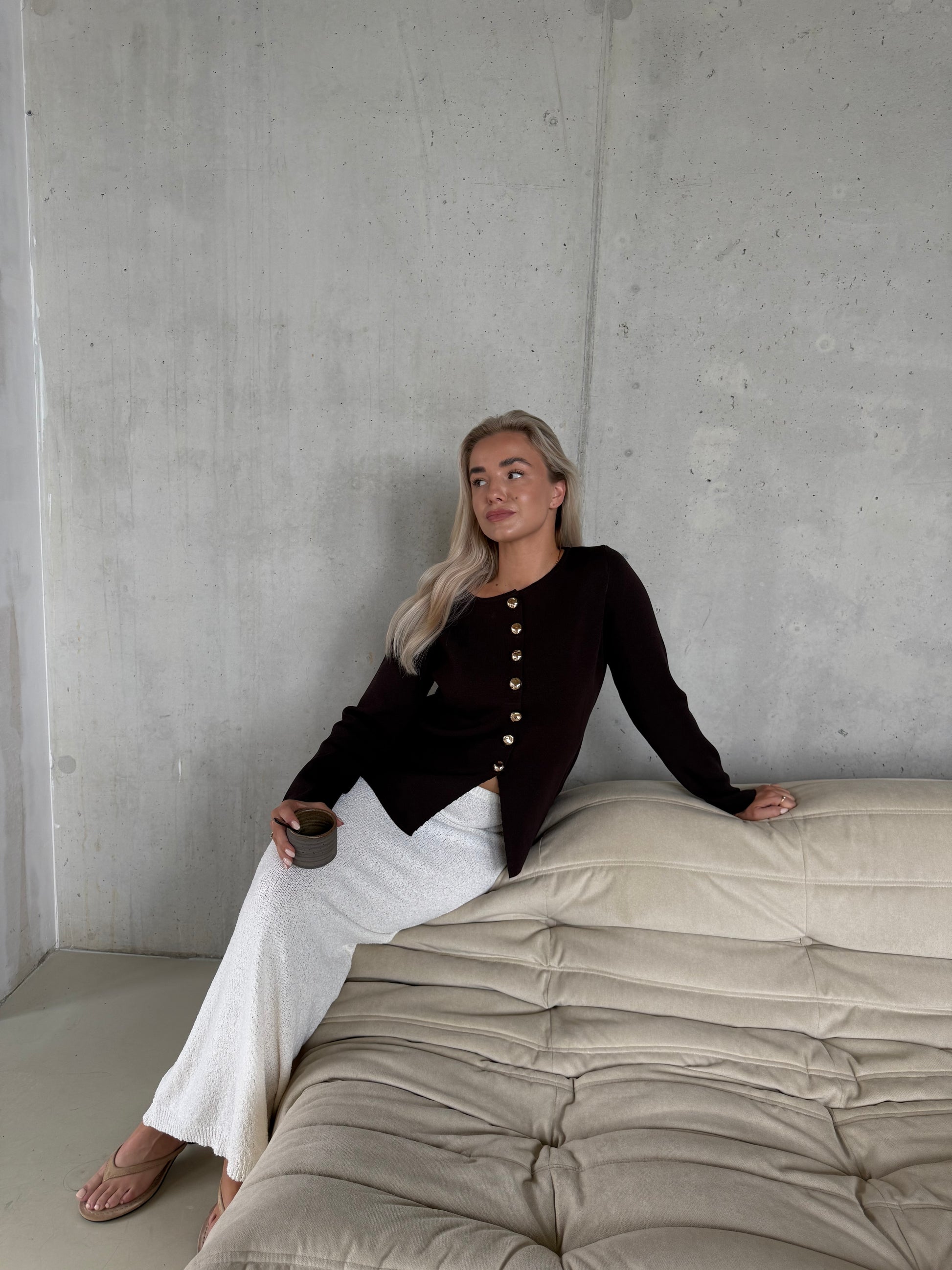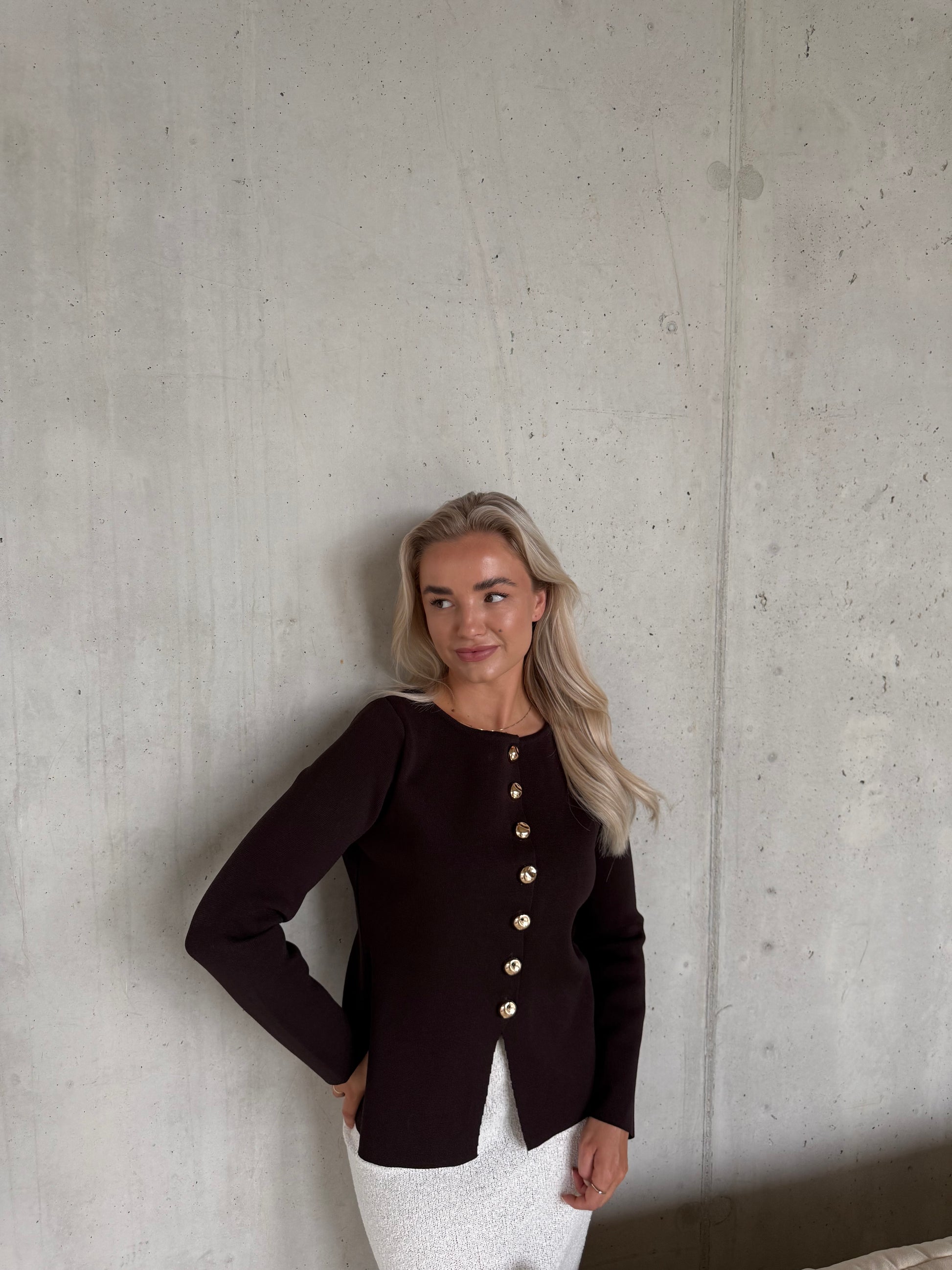 Donkerbruin truitje met chique gouden knopen, een tijdloos item met een subtiele twist.