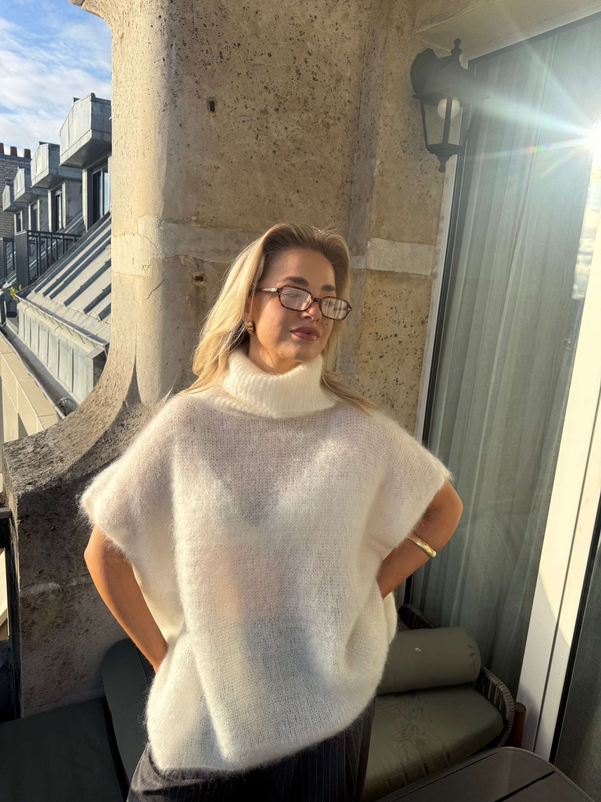 Deze witte col van zachte kid mohair voelt heerlijk luxe en warm aan. De rijke, diepe kleur en fijne textuur geven elke outfit een elegante, knusse uitstraling.