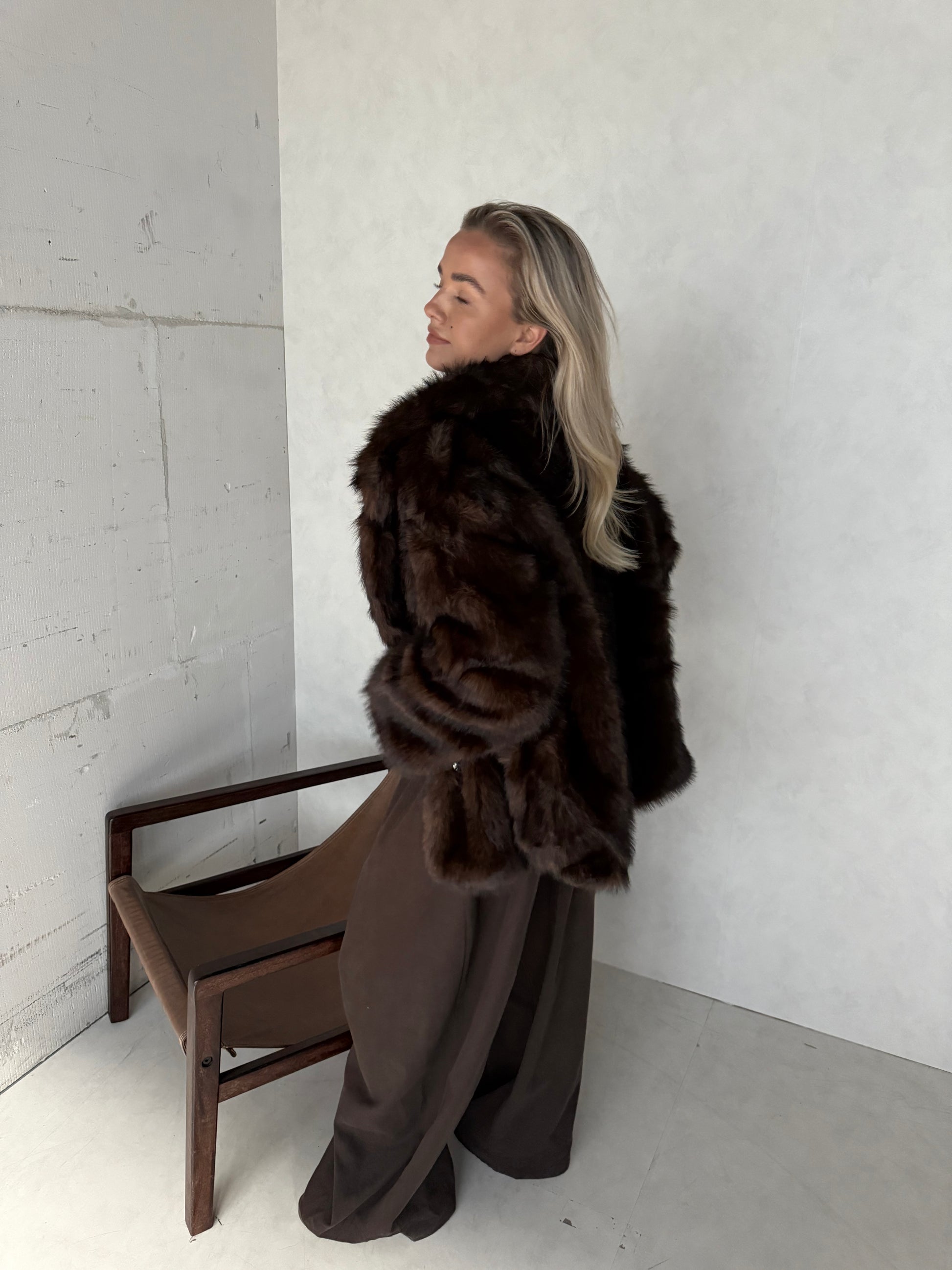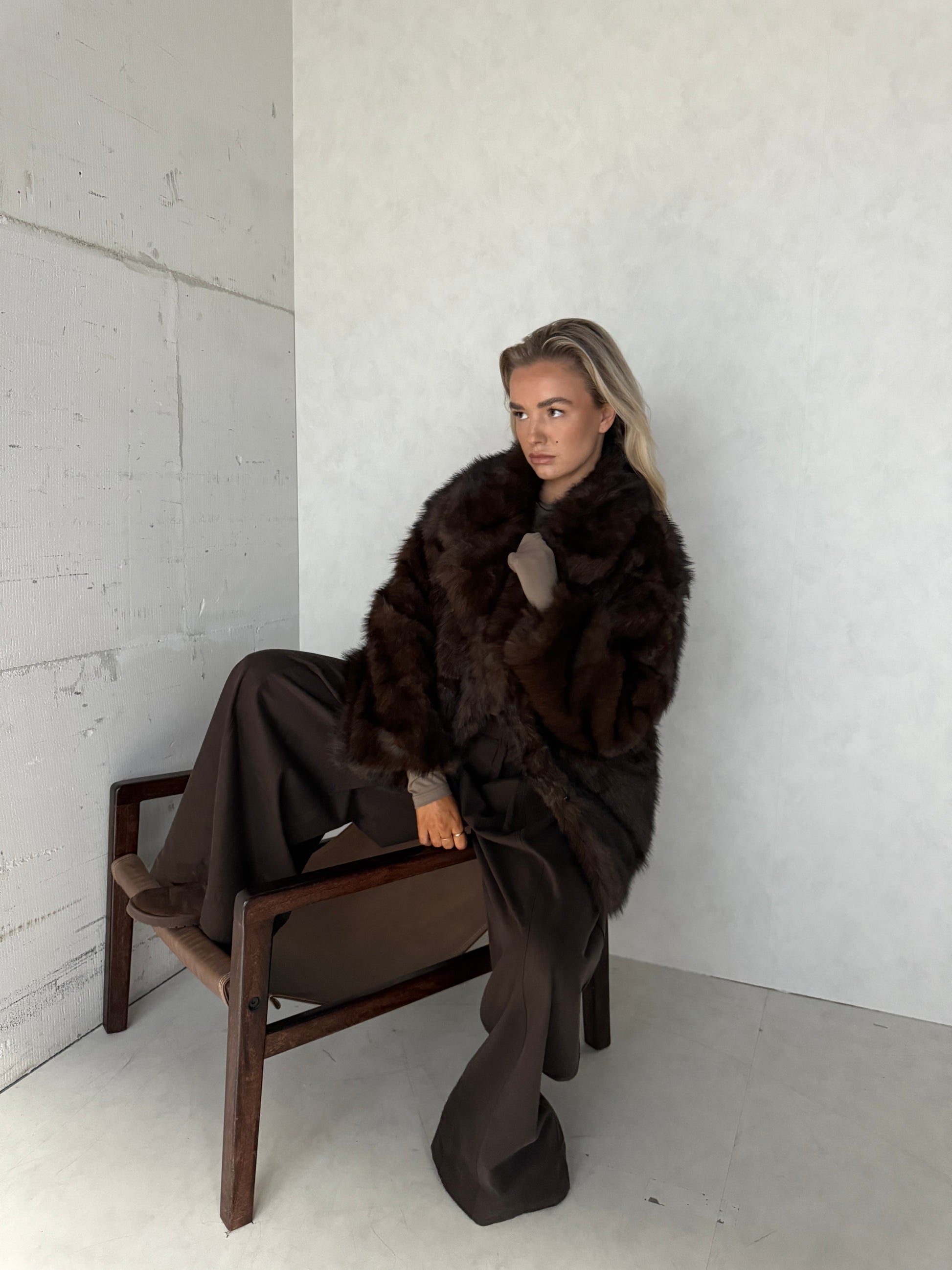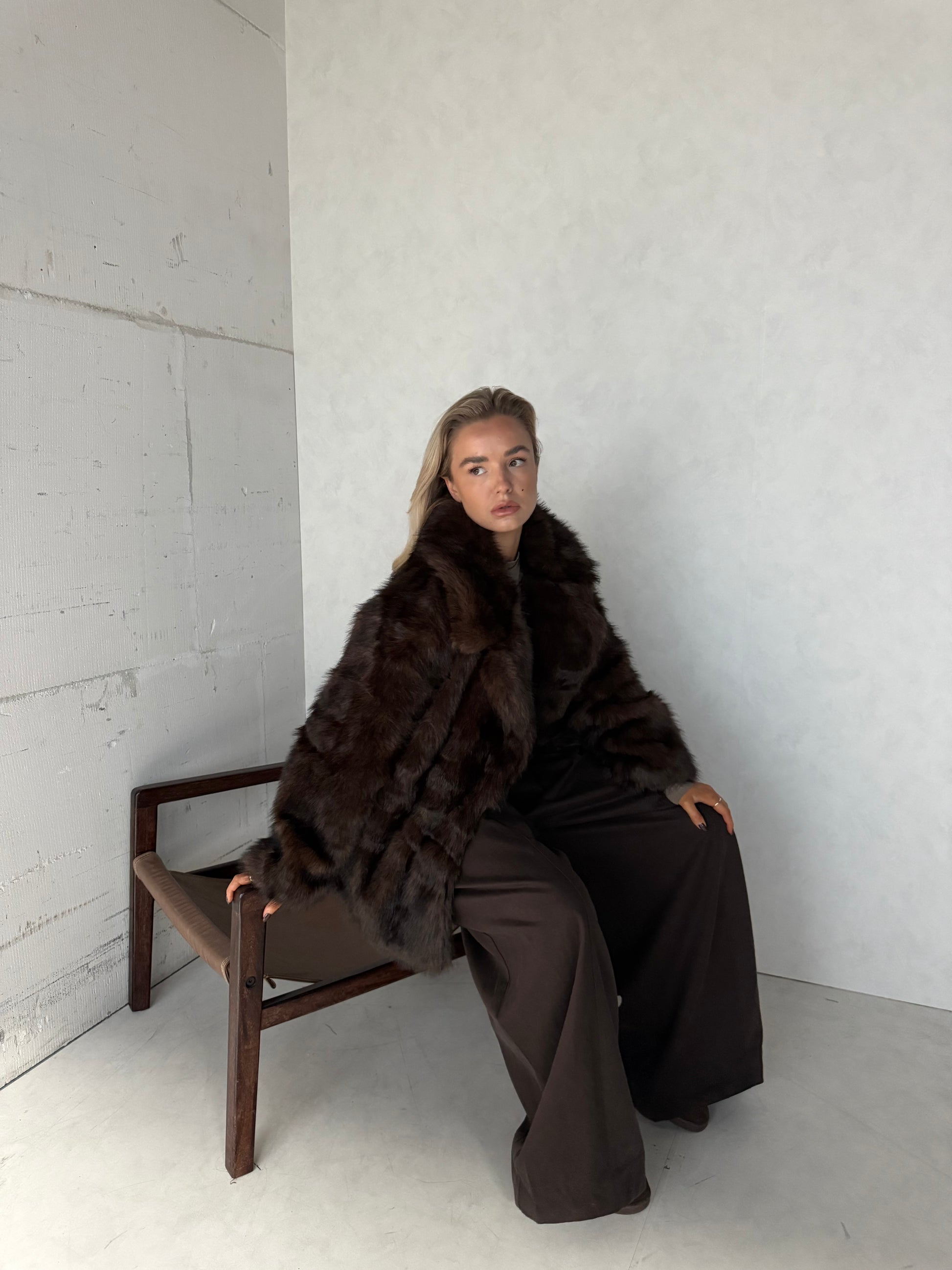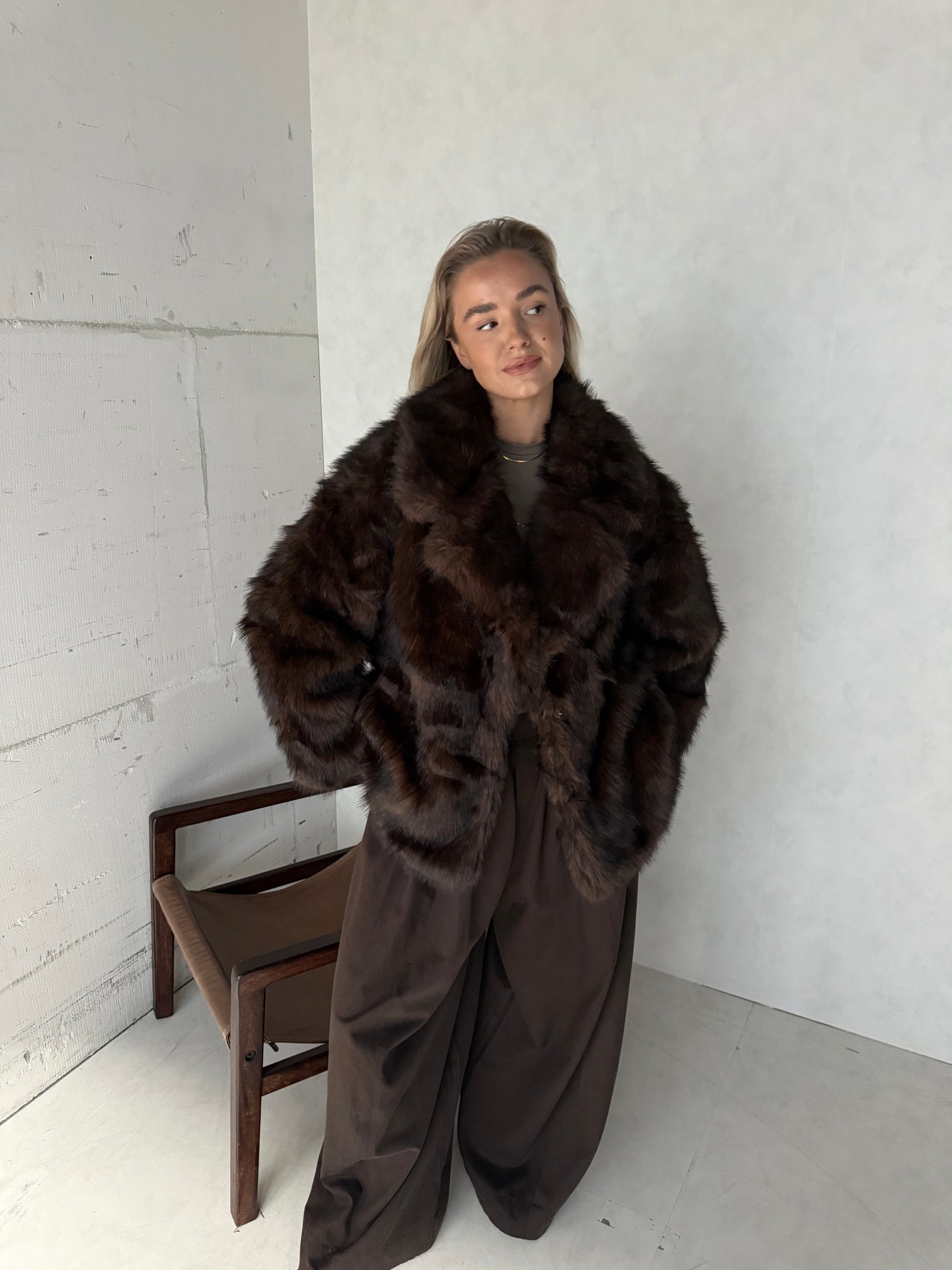 Een tijdloze jas die warmte en elegantie combineert. De zachte bruine bontstructuur voelt luxueus aan en geeft elke outfit een verfijnde uitstraling. Perfect voor koude dagen waarop je stijlvol en comfortabel wilt blijven.