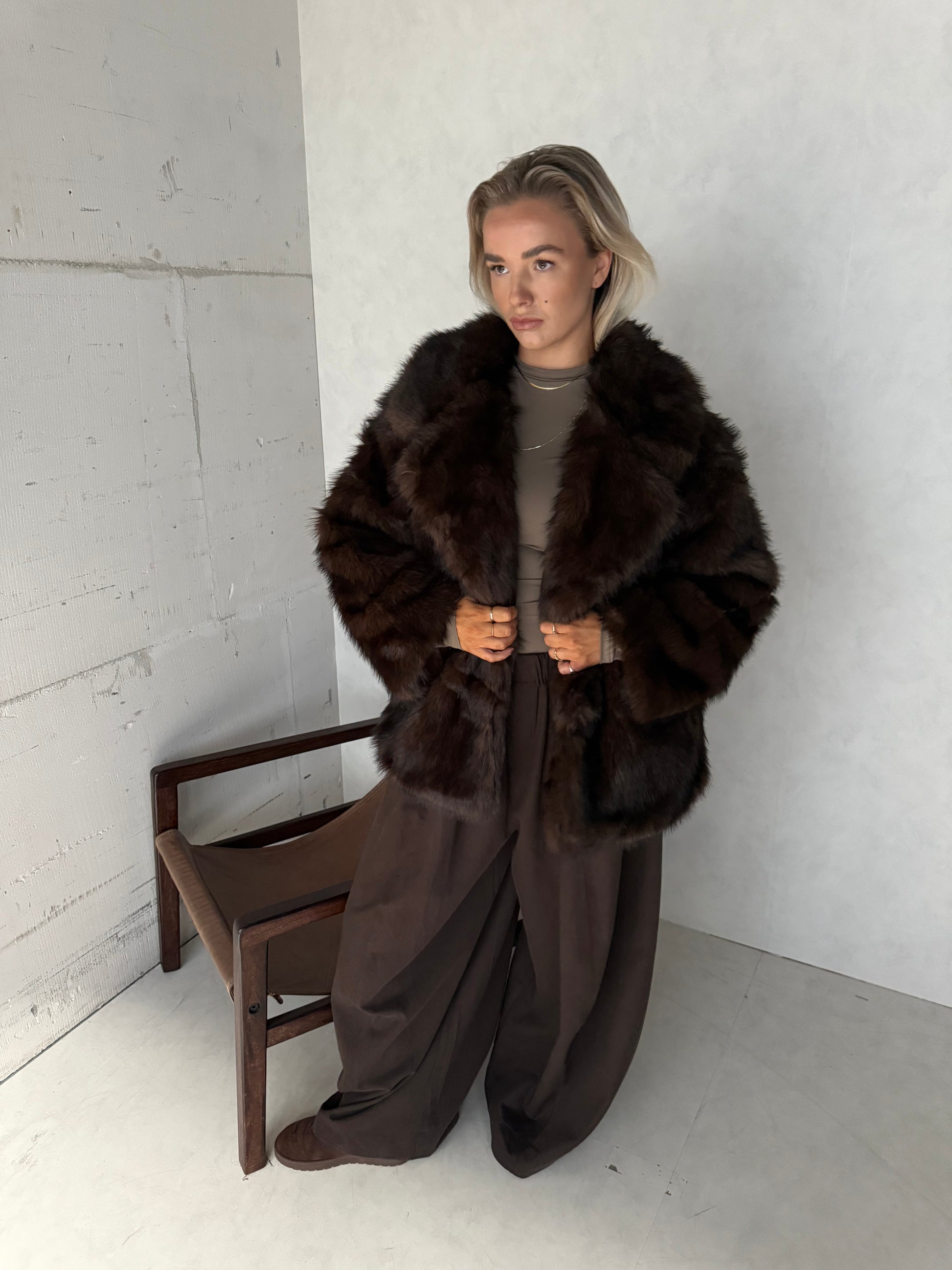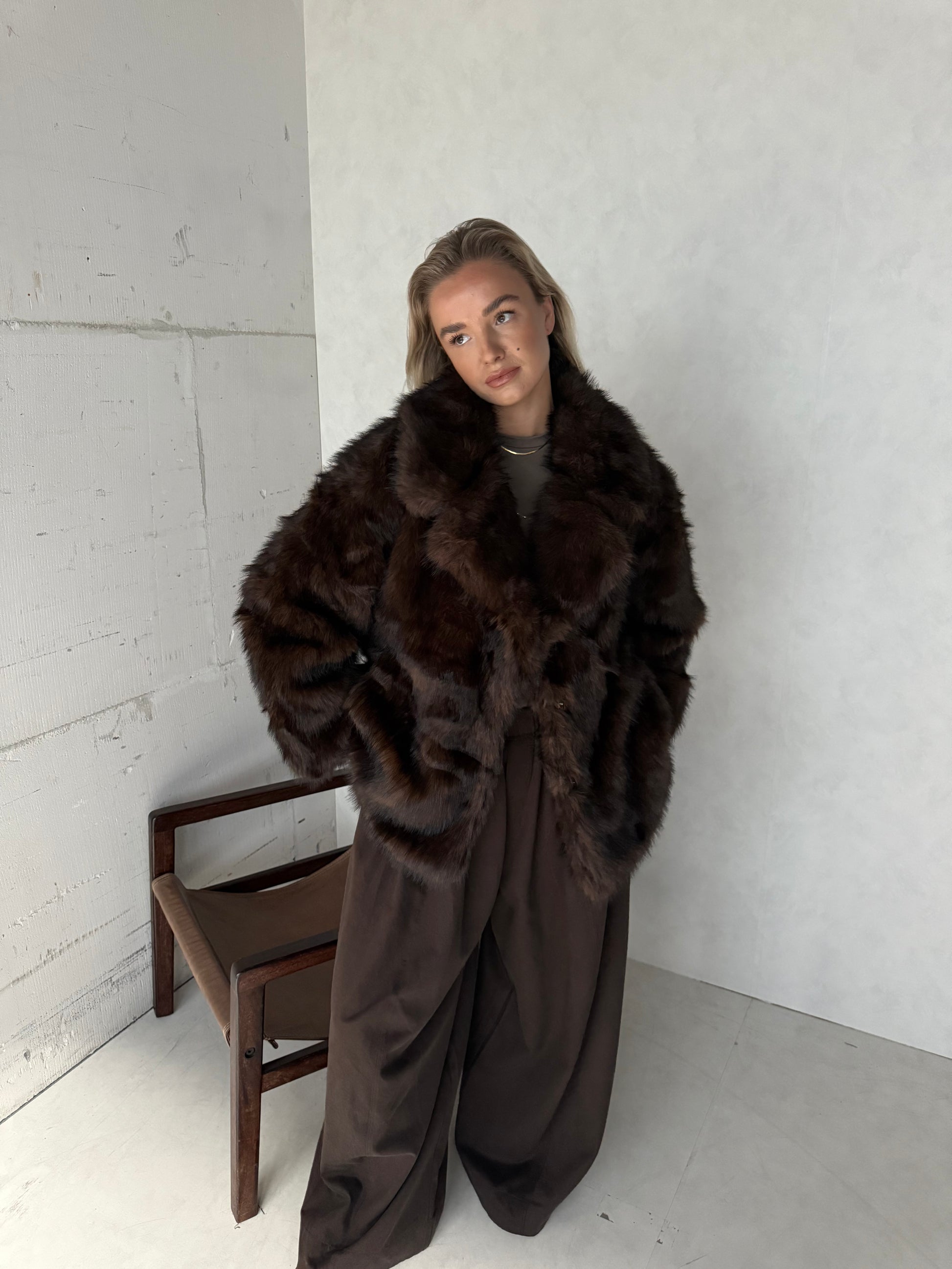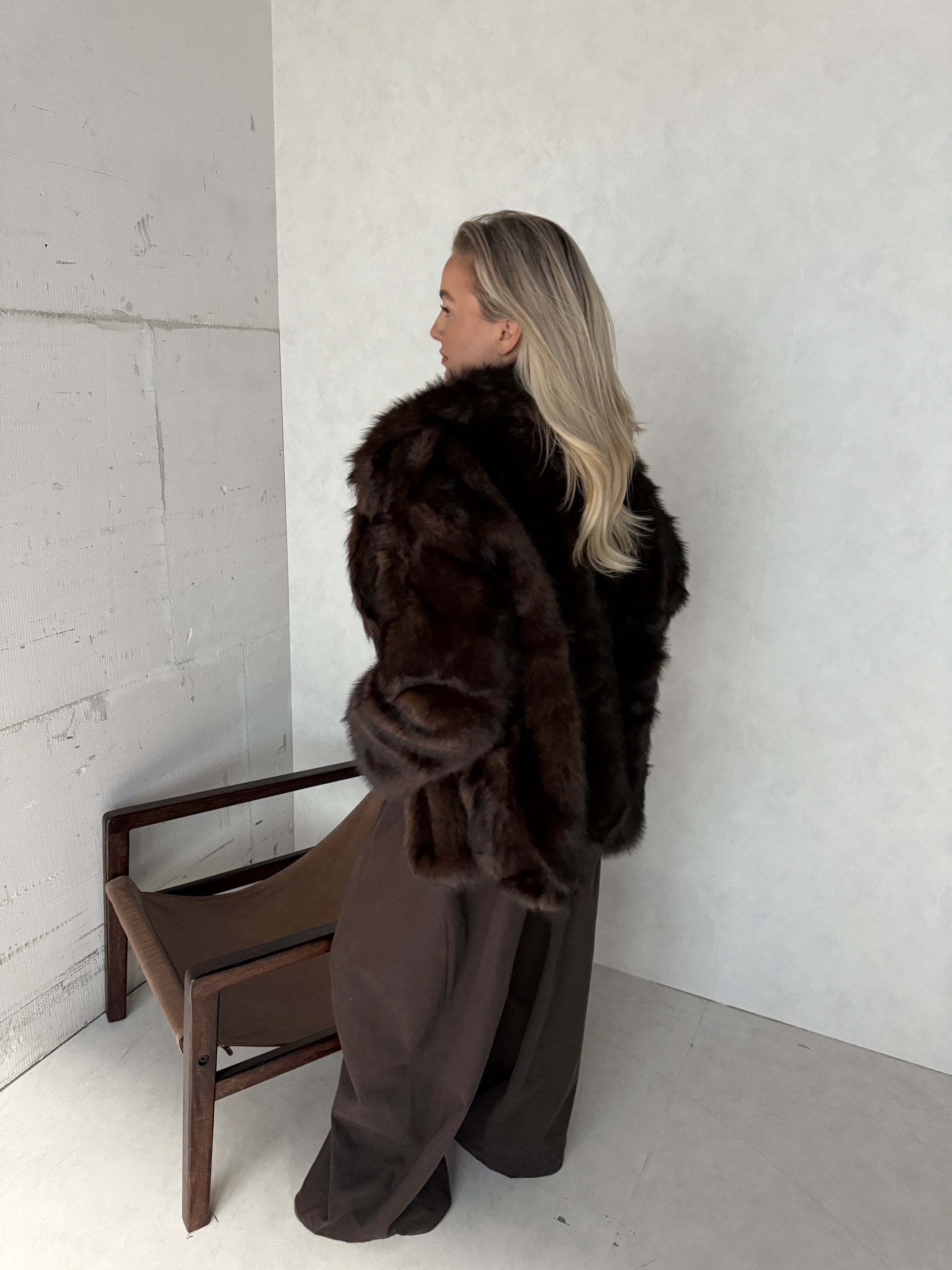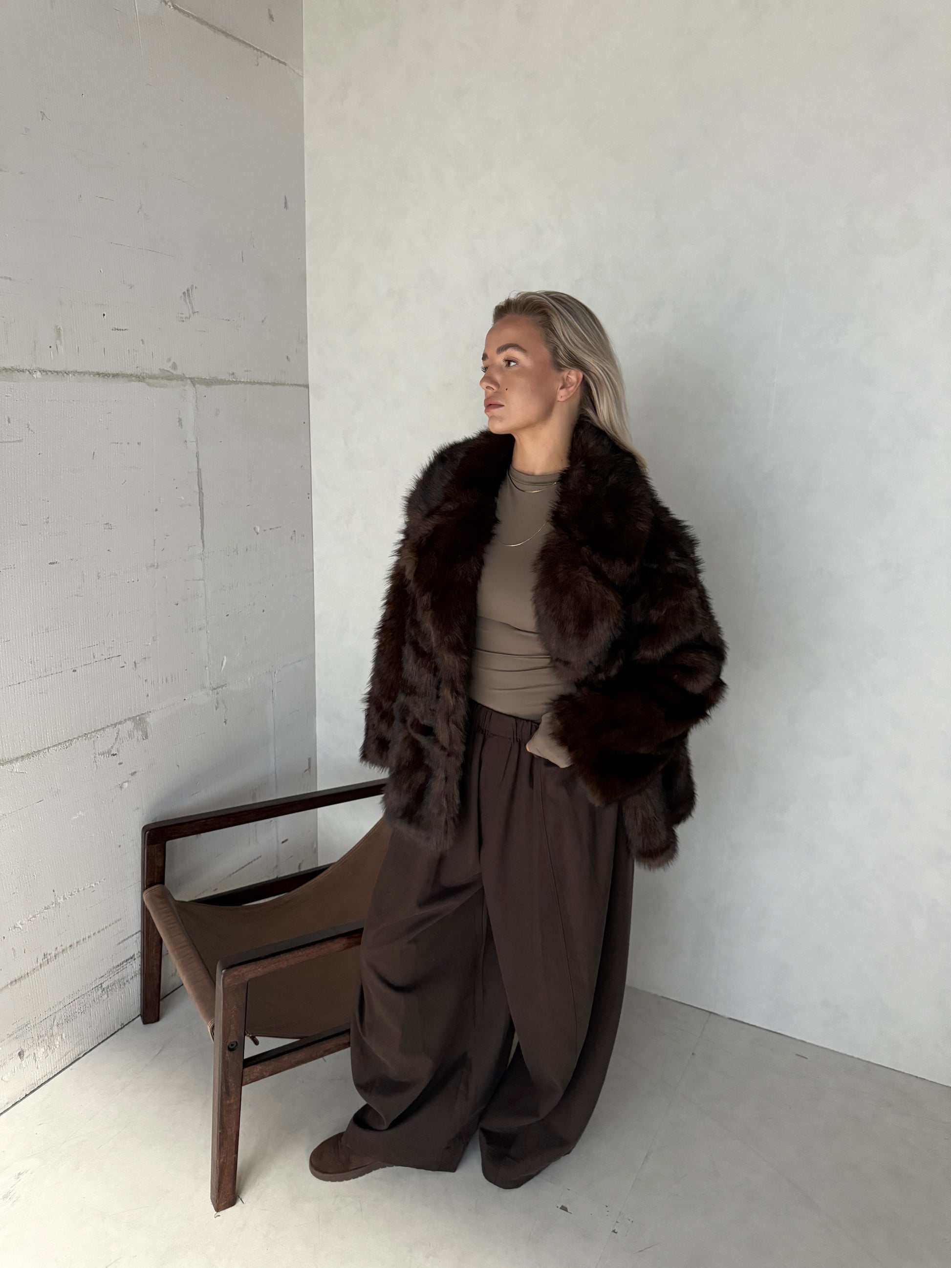 Een tijdloze jas die warmte en elegantie combineert. De zachte bruine bontstructuur voelt luxueus aan en geeft elke outfit een verfijnde uitstraling. Perfect voor koude dagen waarop je stijlvol en comfortabel wilt blijven.