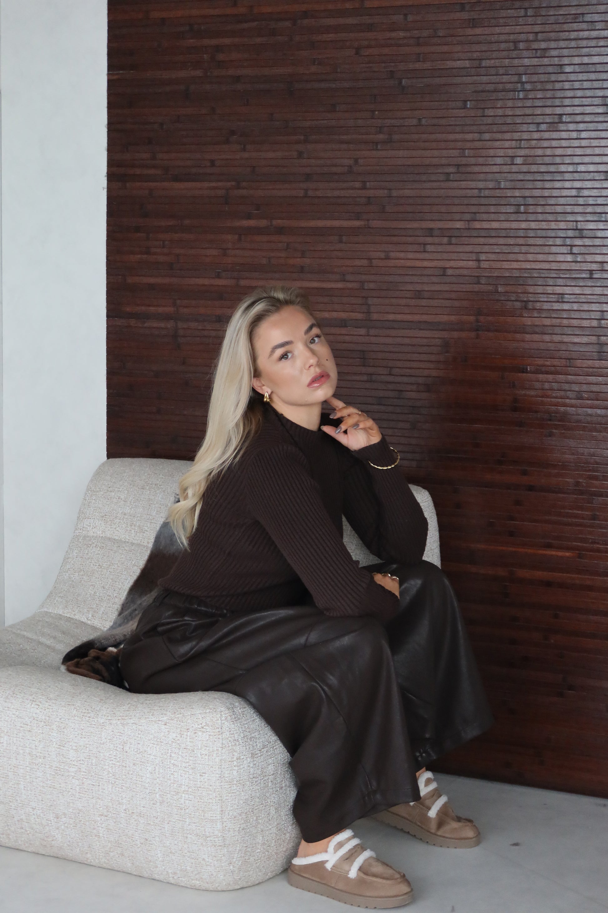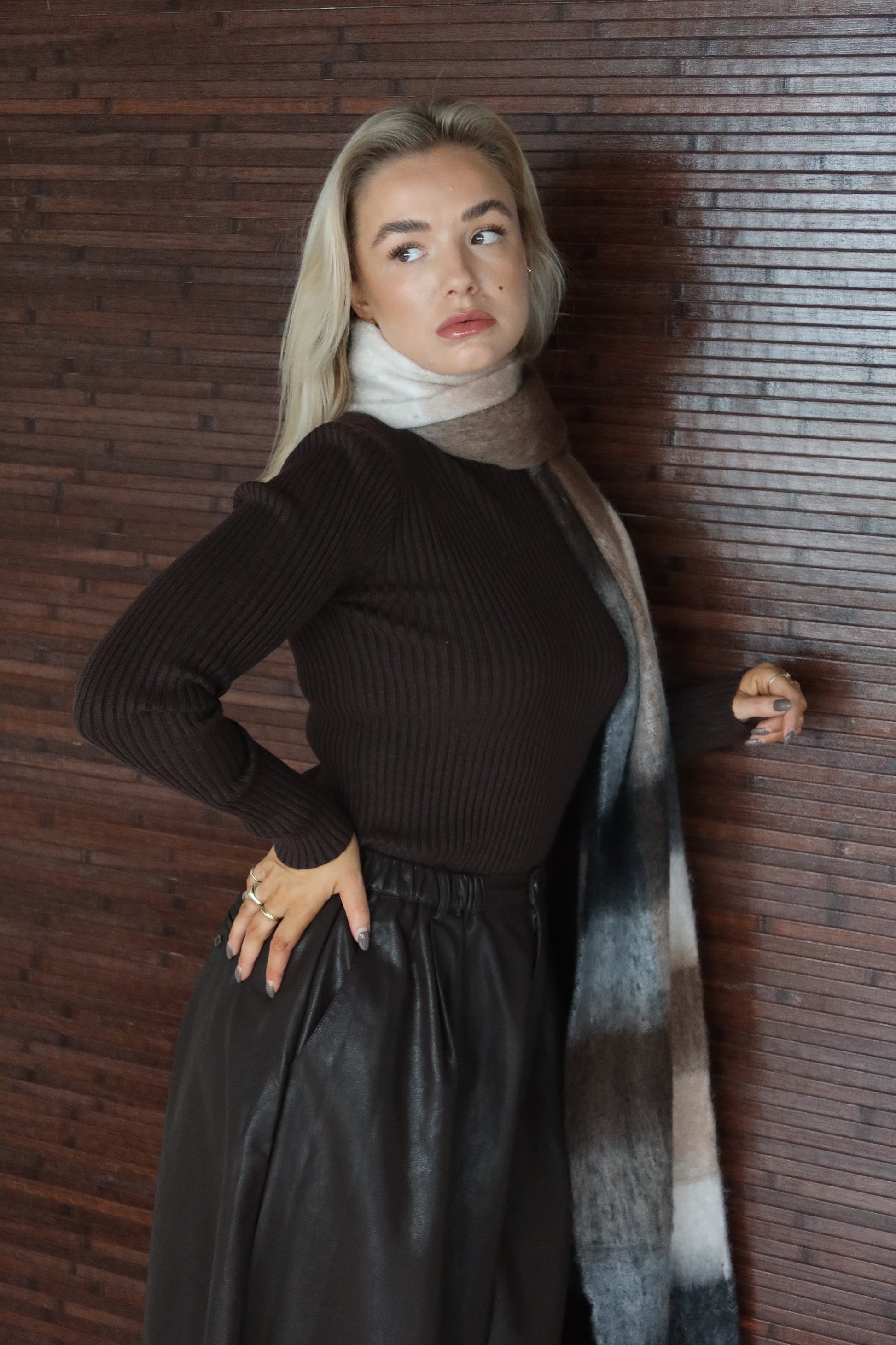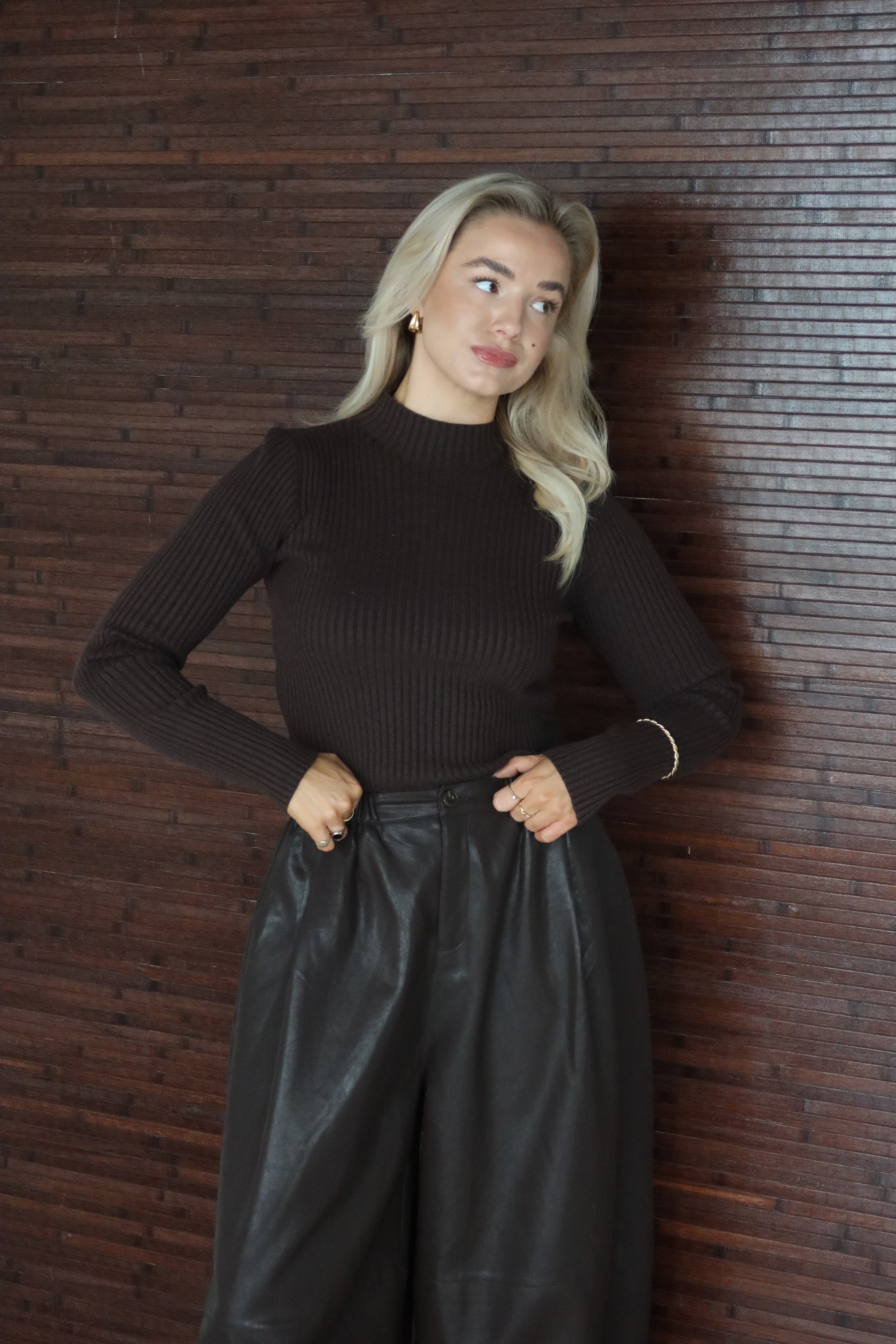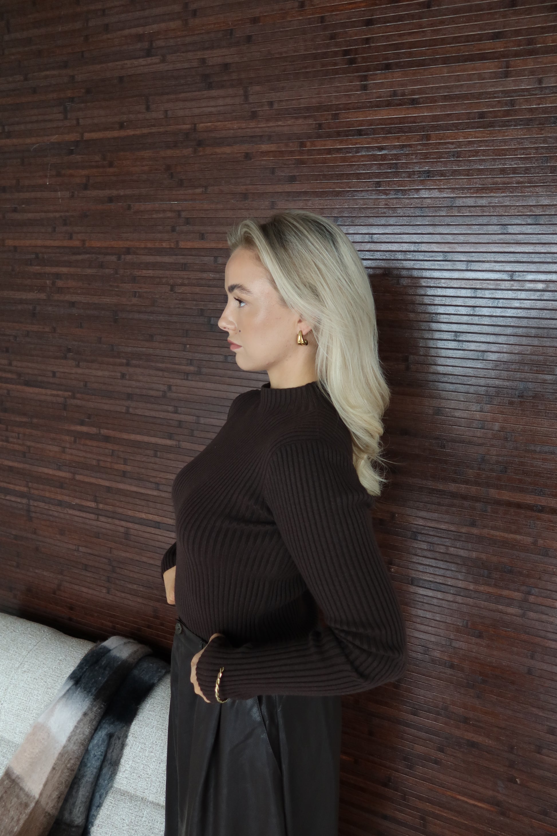 Een col bruin is een warme, stijlvolle trui met een hoge omgeslagen kraag in een diepe bruine tint. Perfect voor een elegante, comfortabele look tijdens koelere dagen.