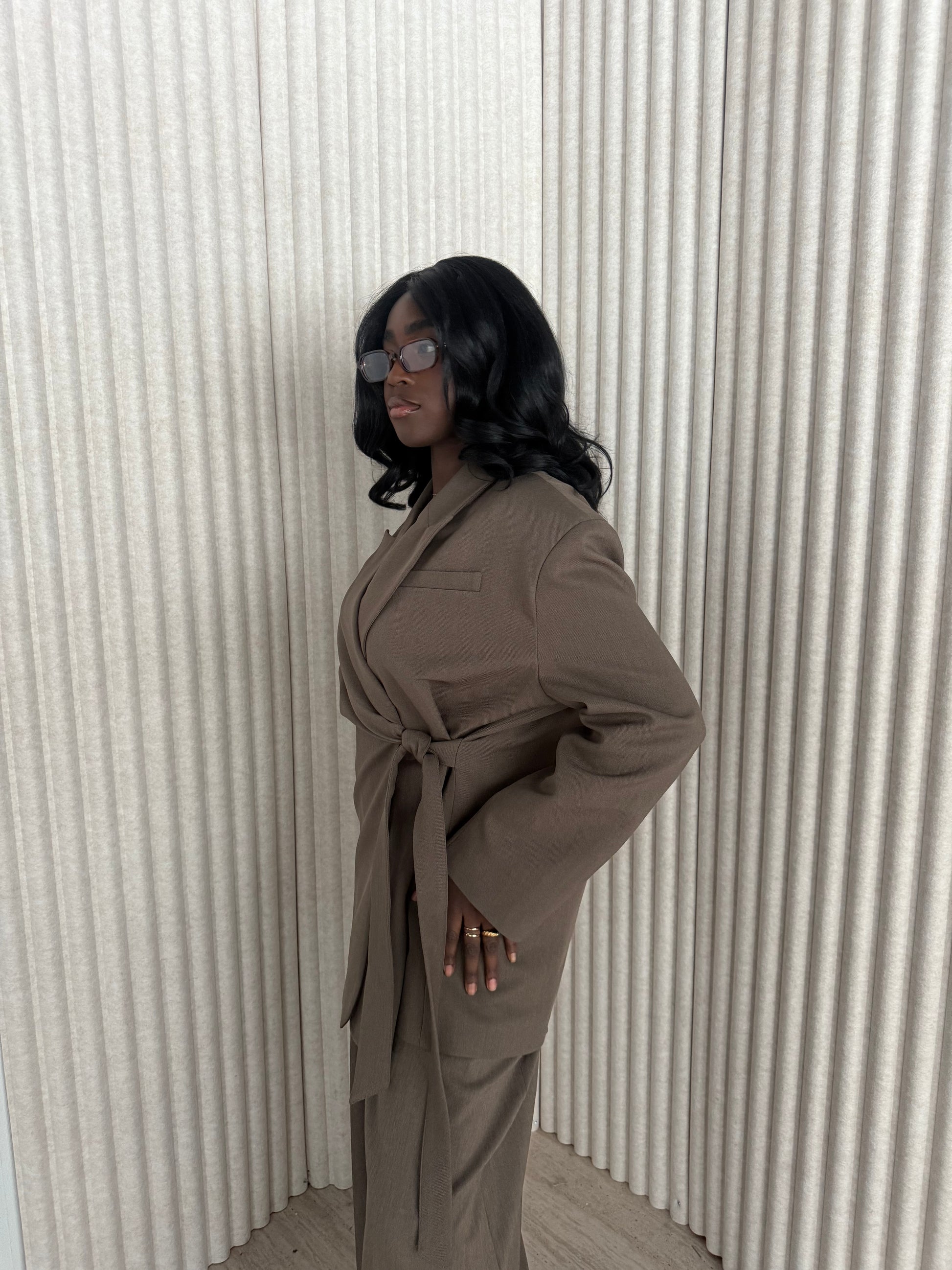 Dit taupe colbert is zonder twijfel de eyecatcher van de collectie. De elegante snit en luxe uitstraling maken dit item perfect te combineren met de bijpassende pantalon voor een krachtige, stijlvolle look. Draag het samen als statement set of los voor een verfijnde touch aan elke outfit.