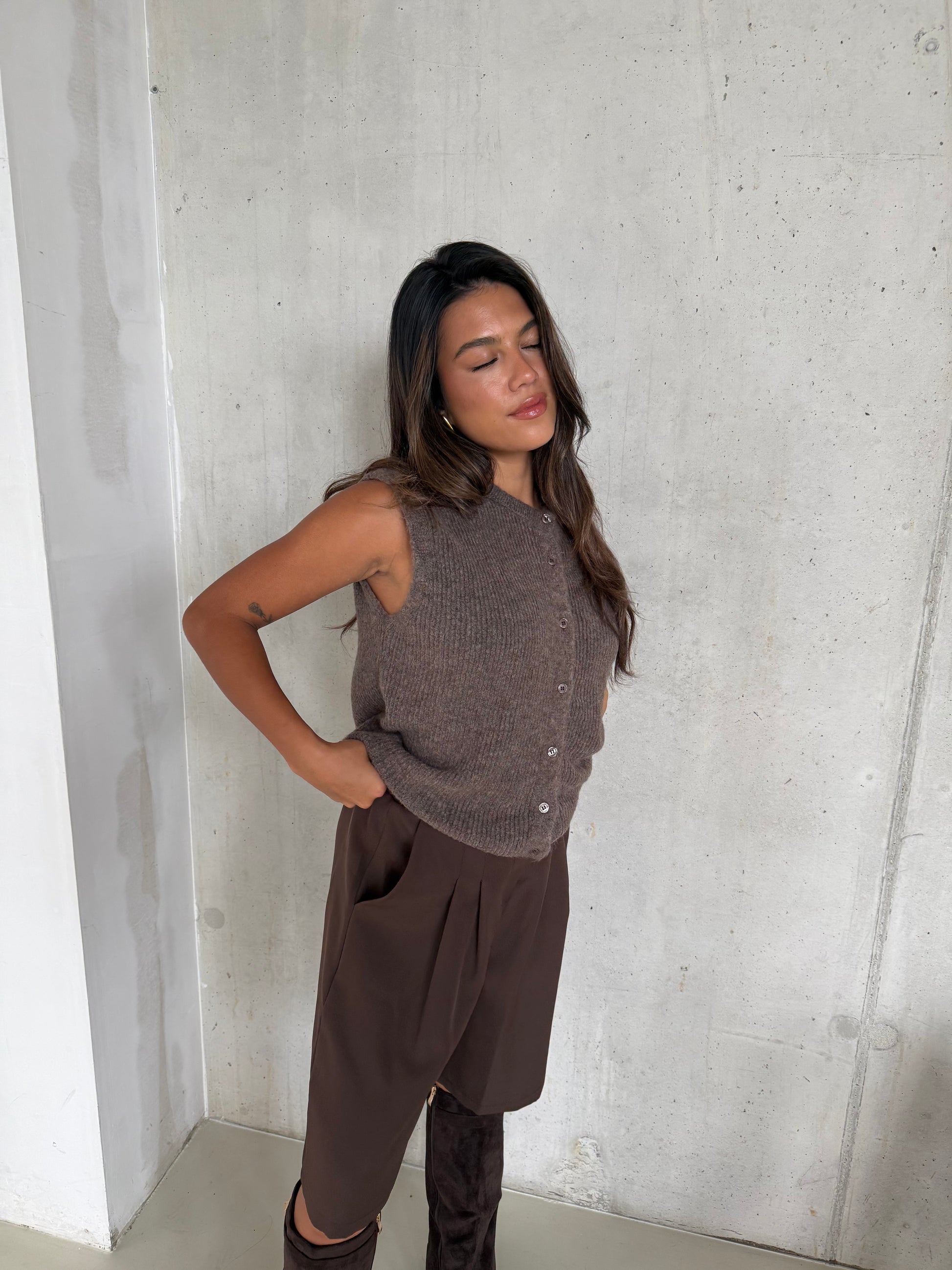 Zacht bruin gilet met een minimalistische look. Gemaakt van een comfortabele wolblend die zacht op de huid ligt.