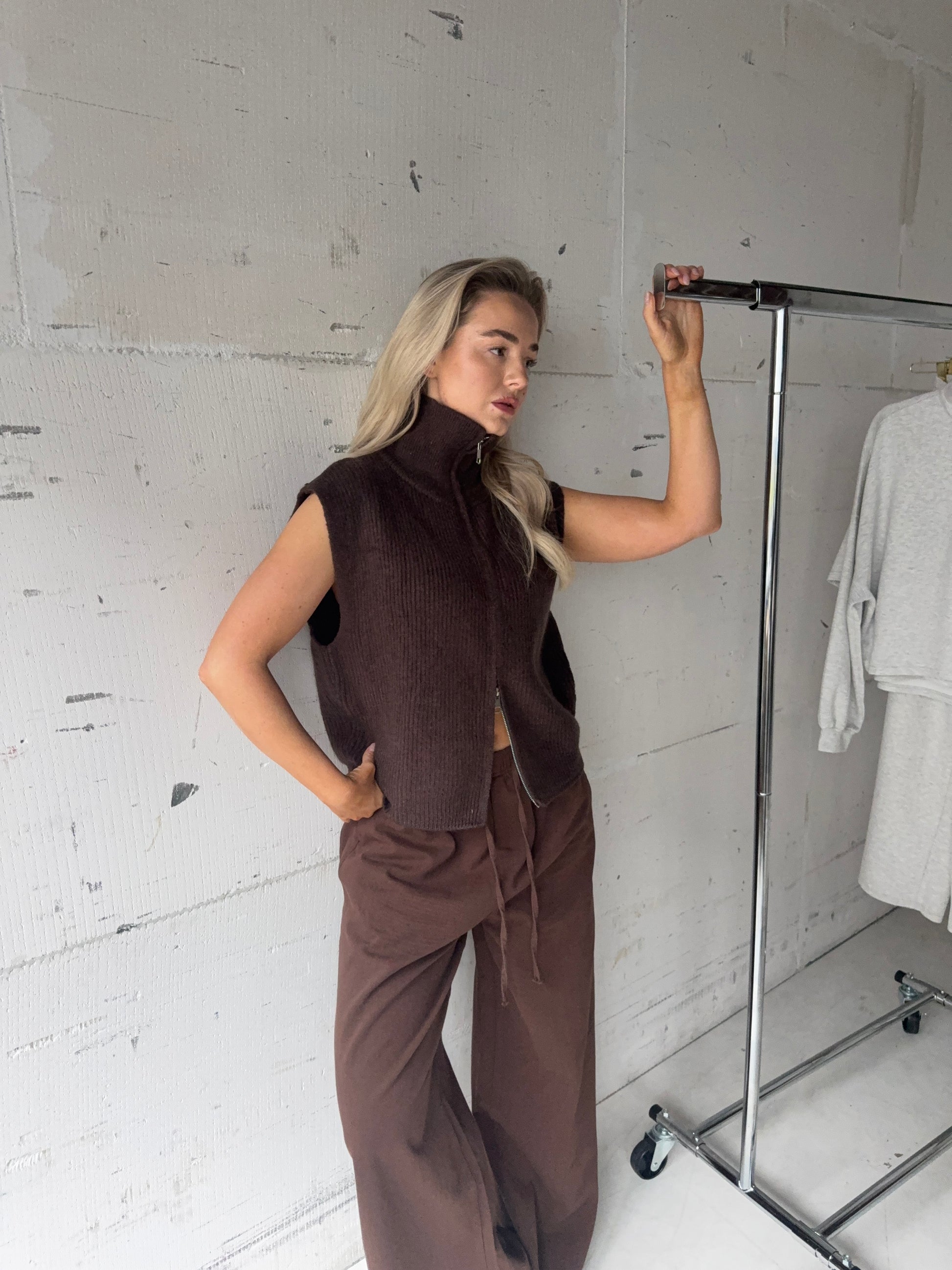 Zacht bruin ribbelvest met hoge col en rits aan twee kanten. Makkelijk te combineren, echte een comfy essential🤎