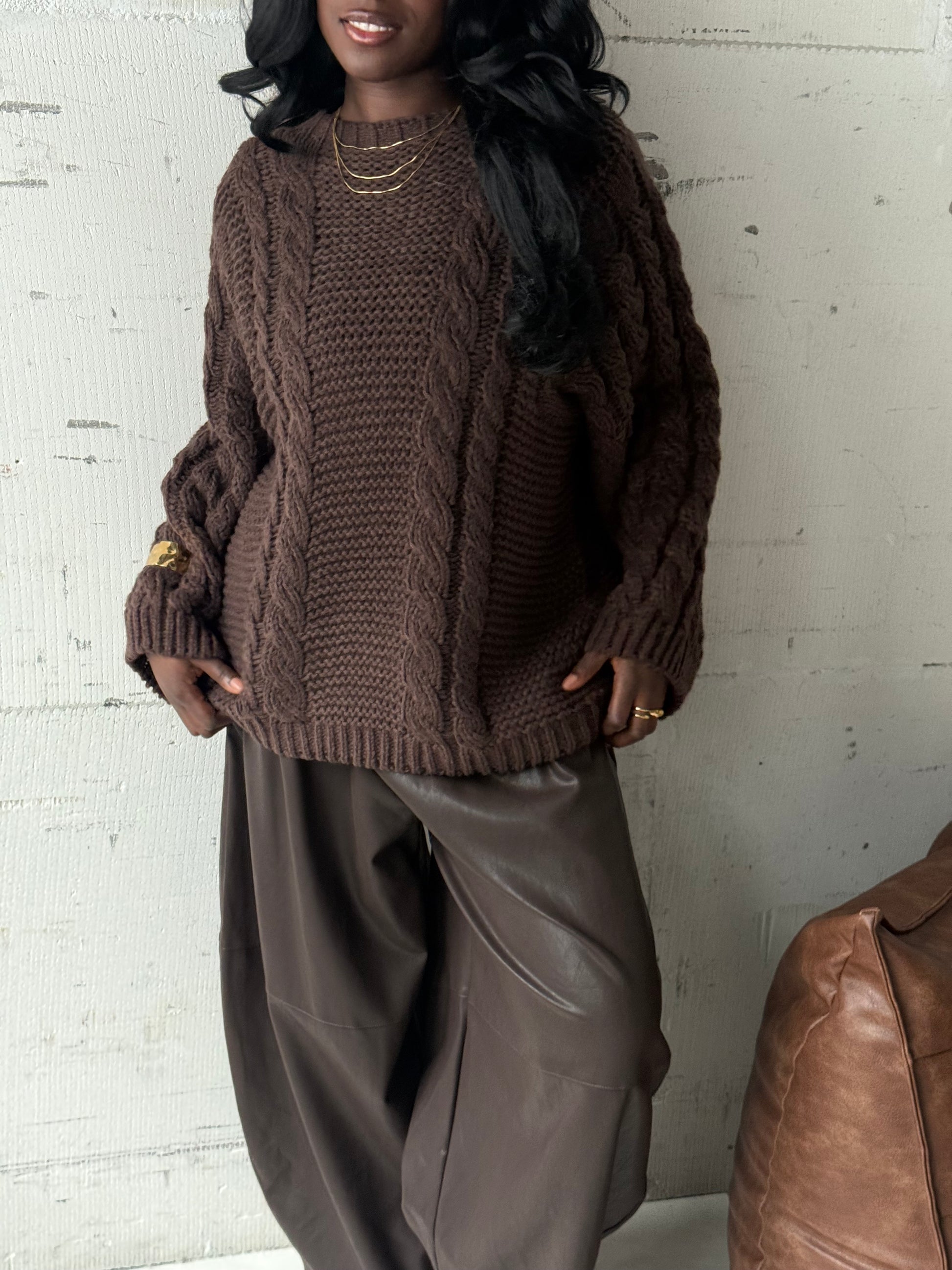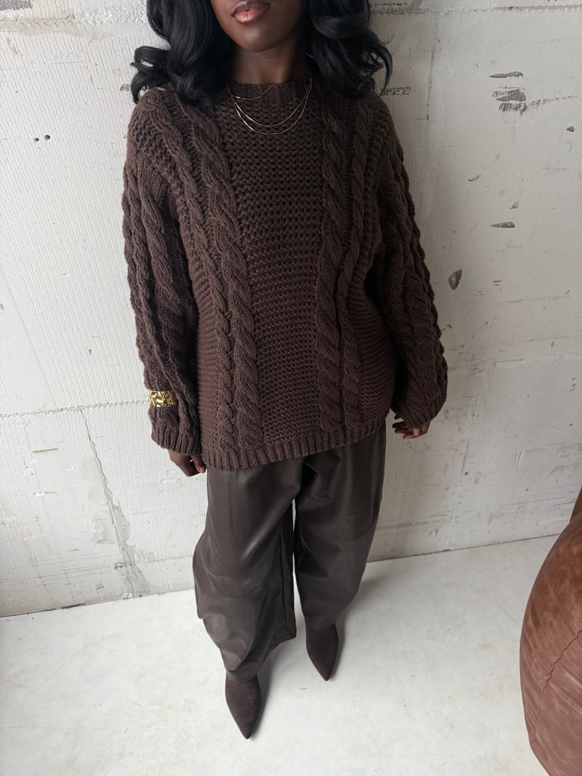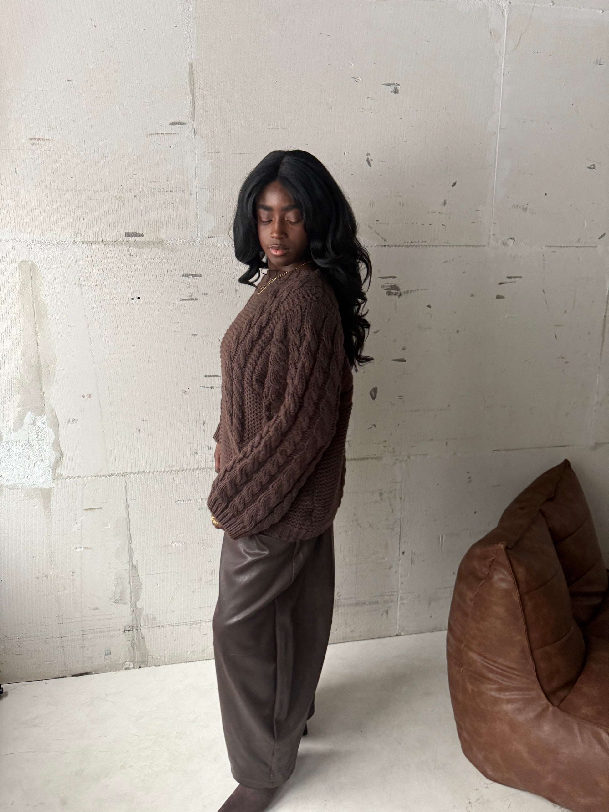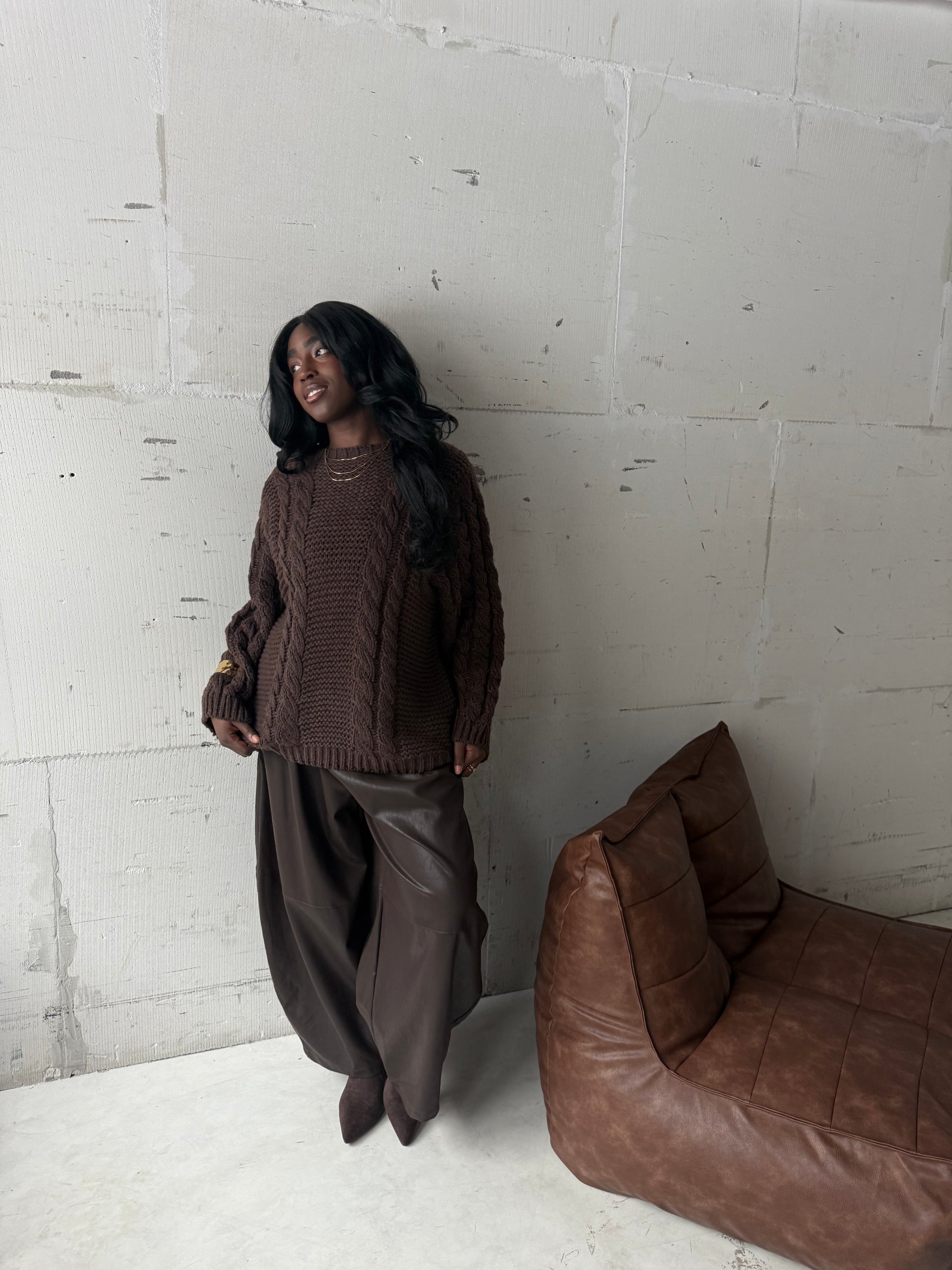 Deze bruine kabeltrui is een echte must-have voor het seizoen. De trui heeft een oversized fit en een klassiek kabelpatroon dat zorgt voor een warme, tijdloze uitstraling.
