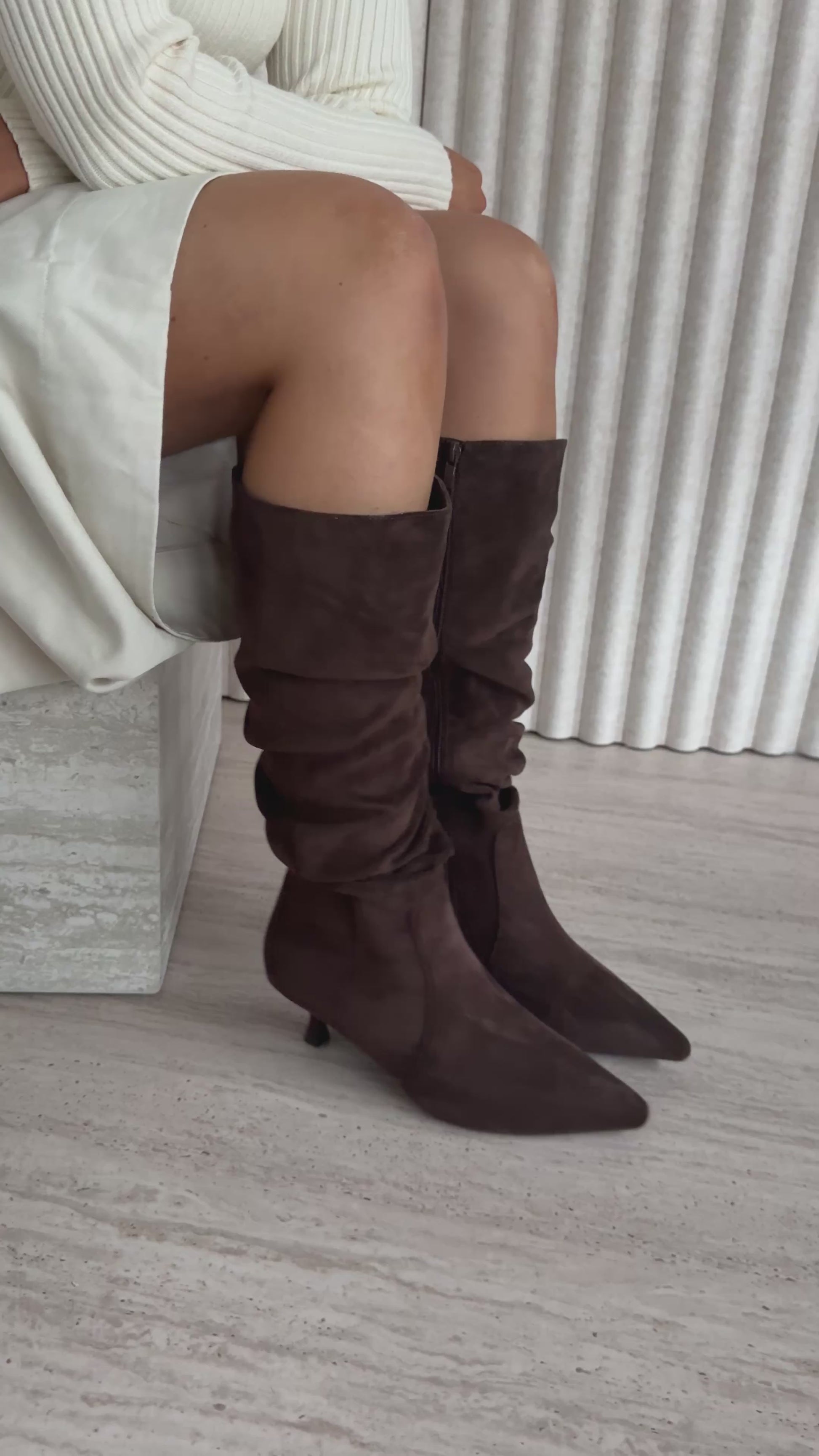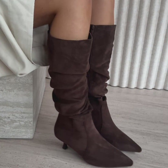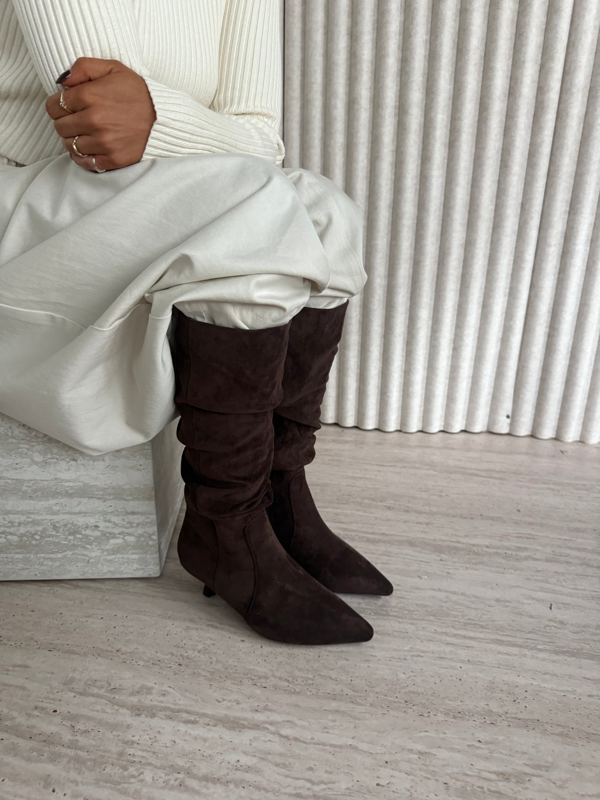 Een stijlvolle laars gemaakt van zacht suède in een rijke bruine tint. Het kleine hakje voegt een elegante touch toe, terwijl het tijdloze ontwerp zorgt voor een verfijnde, vrouwelijke look. Verkrijgbaar in jouw eigen maat