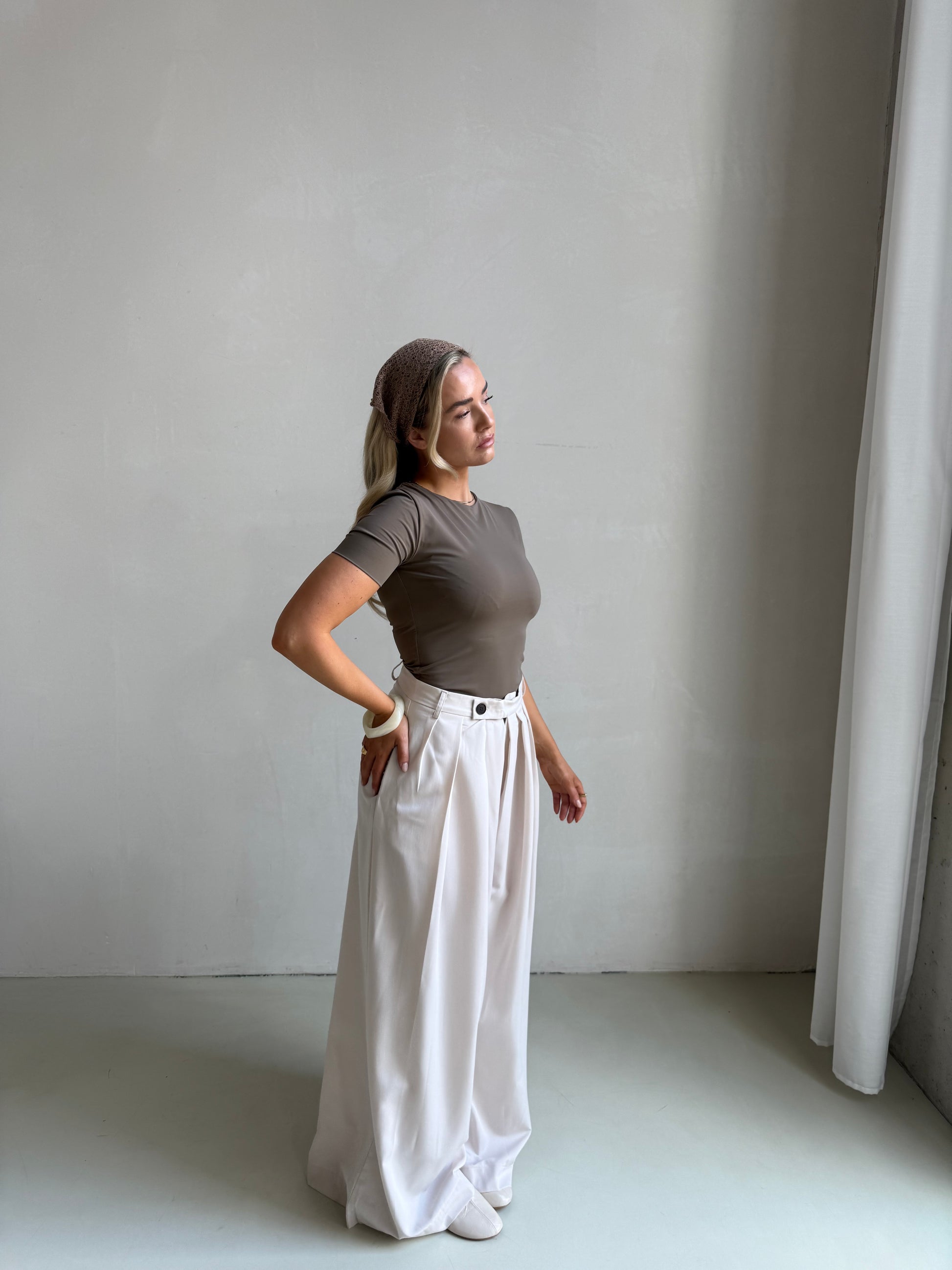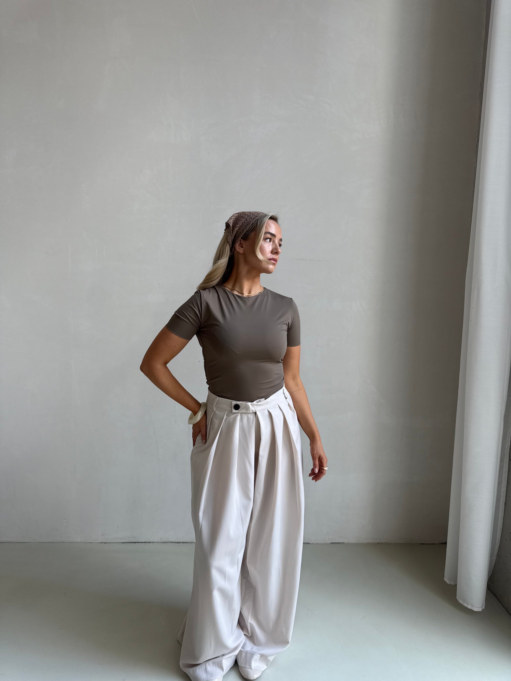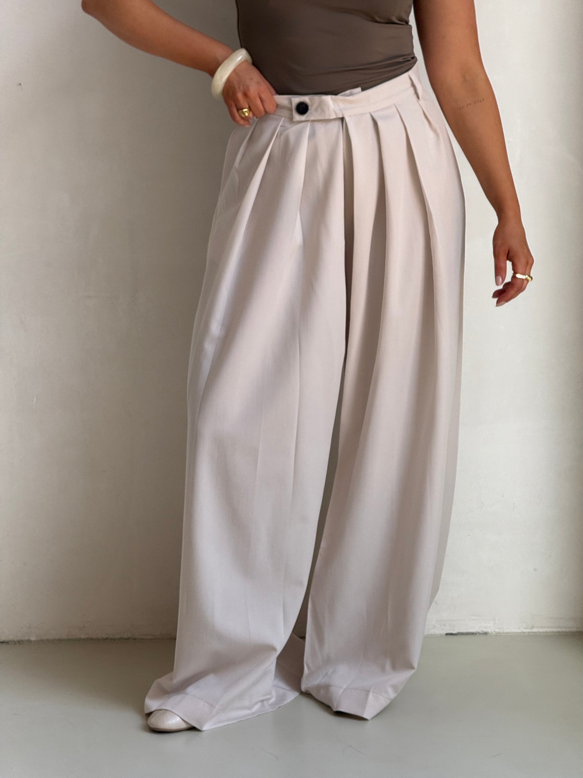 Elegante crèmekleurige pantalon met plooidetail. Geeft je outfit een chique look. Neem een maatje groter!