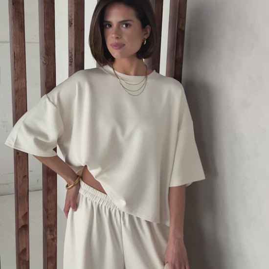 Zacht crème shirt dat hoort bij dit comfy setje. Tijdloos, comfortabel en makkelijk te combineren. perfect met onze broek