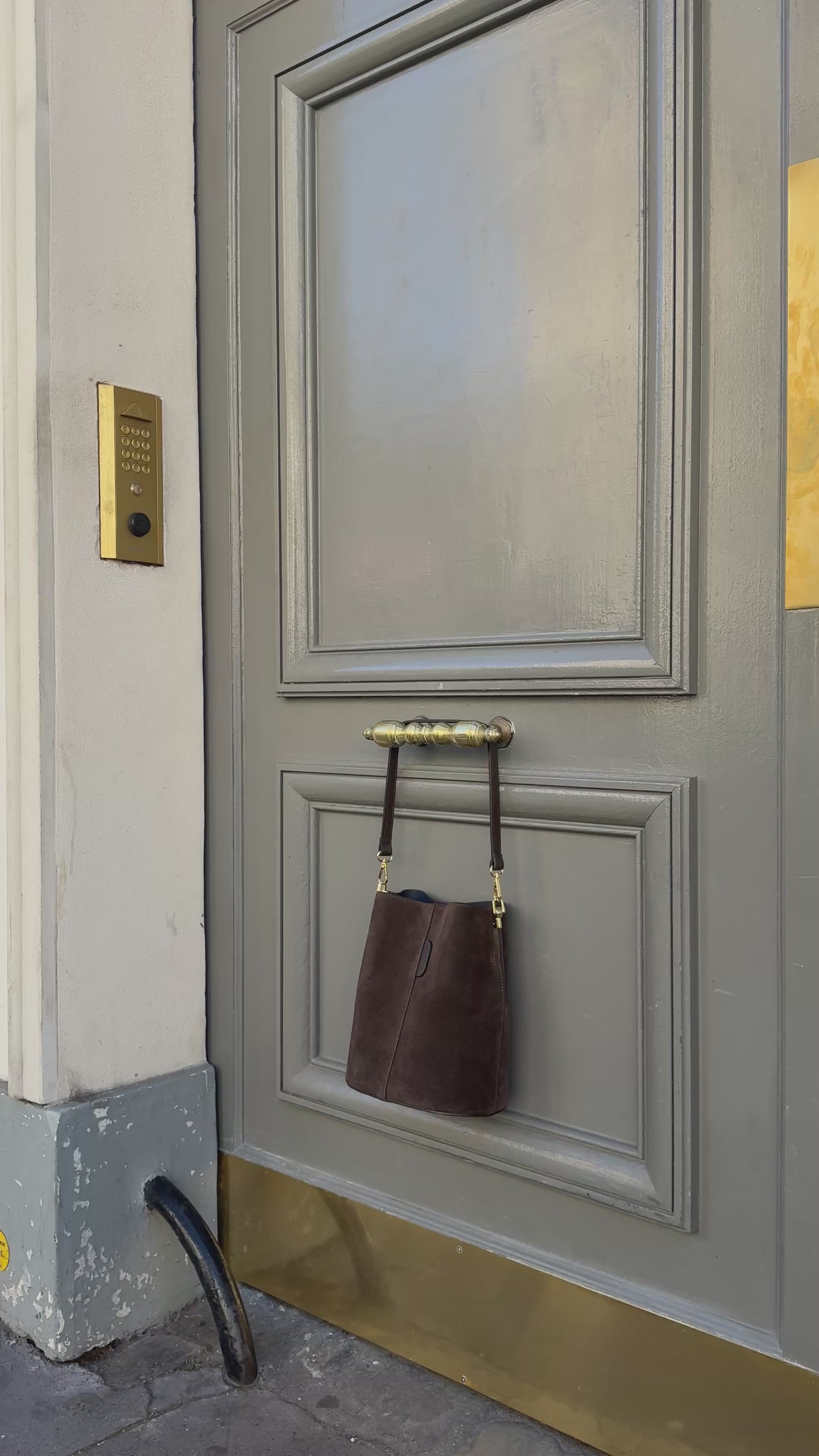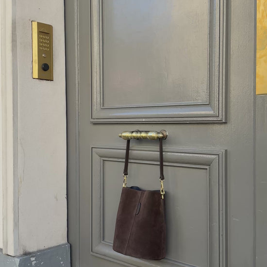 Ronde suède tas met een zachte, luxe uitstraling. Perfect voor een elegante touch.