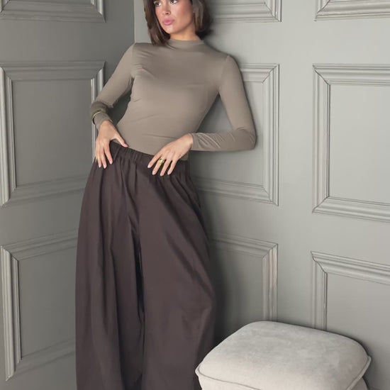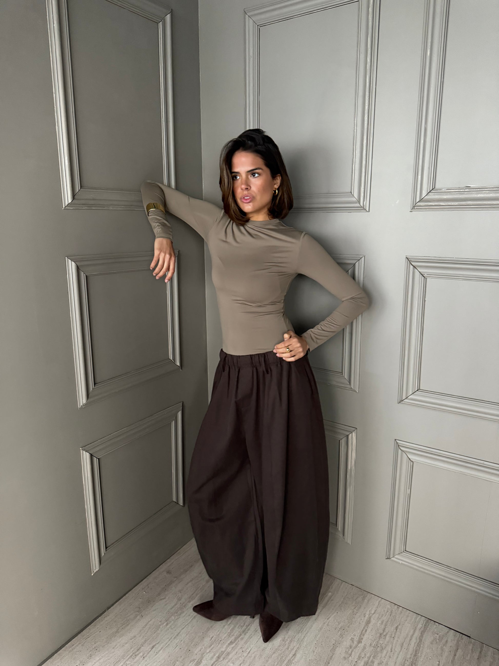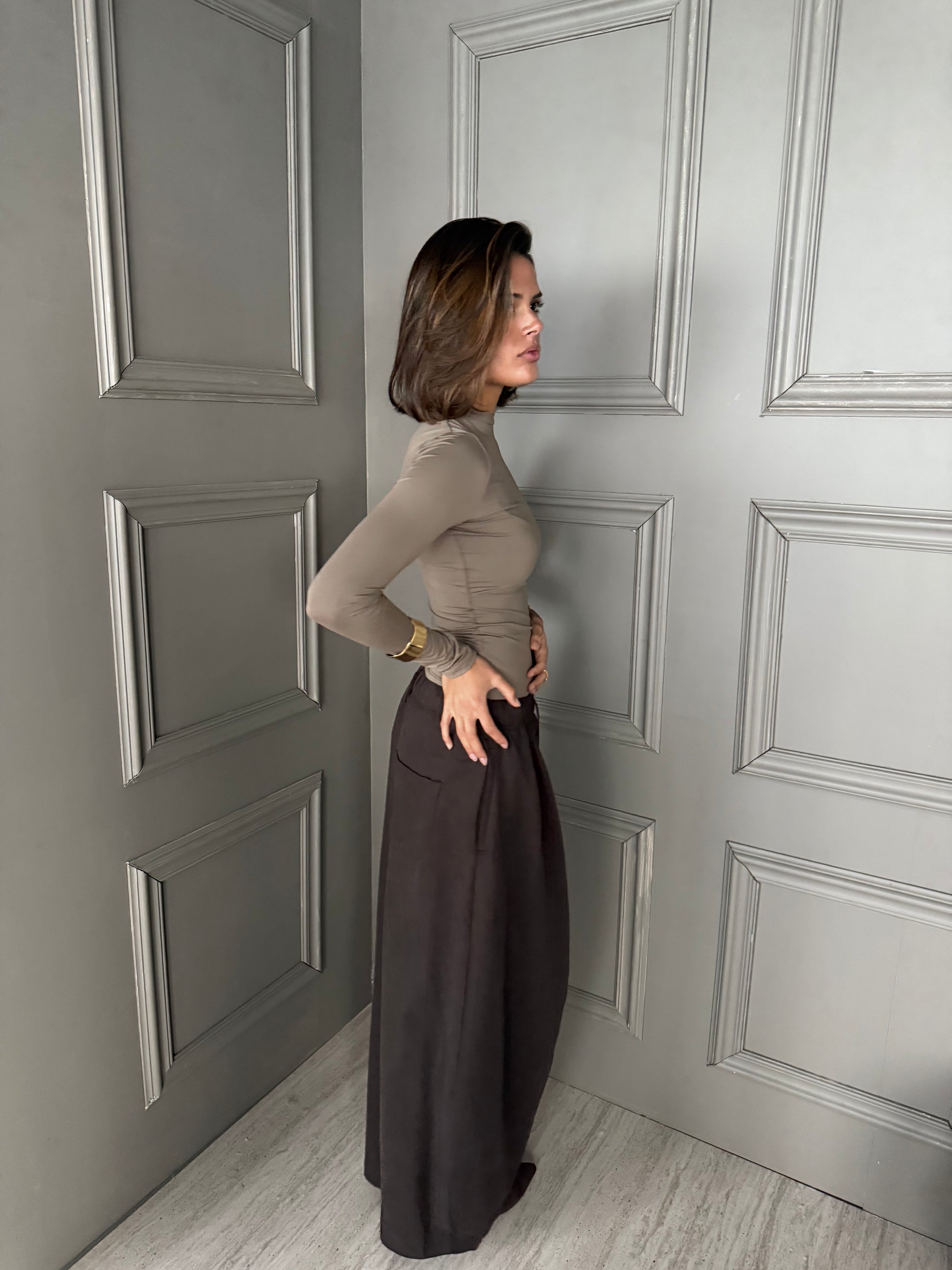 Een stijlvolle top met een strakke, vrouwelijke pasvorm. De zachte taupe kleur geeft een elegante en verfijnde uitstraling. Perfect te dragen als basisstuk onder een blazer of op zichzelf voor een minimalistische, chique look.