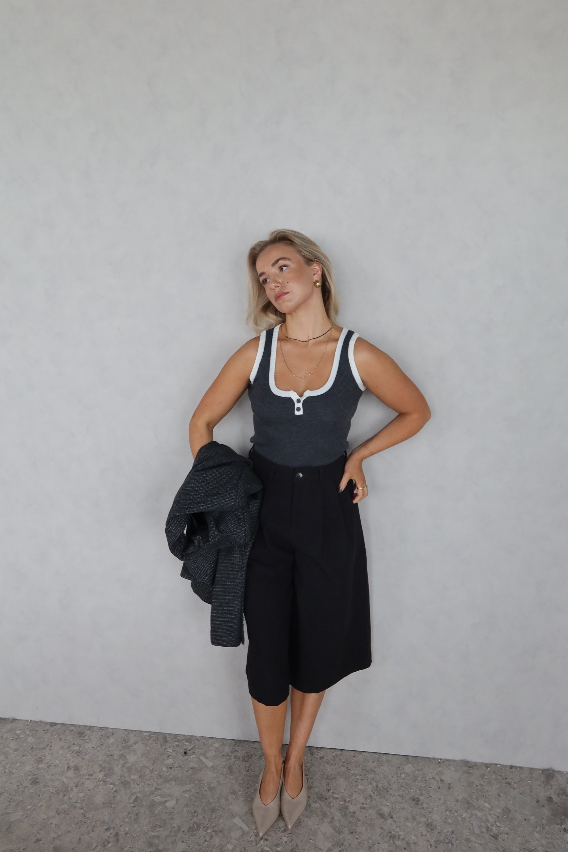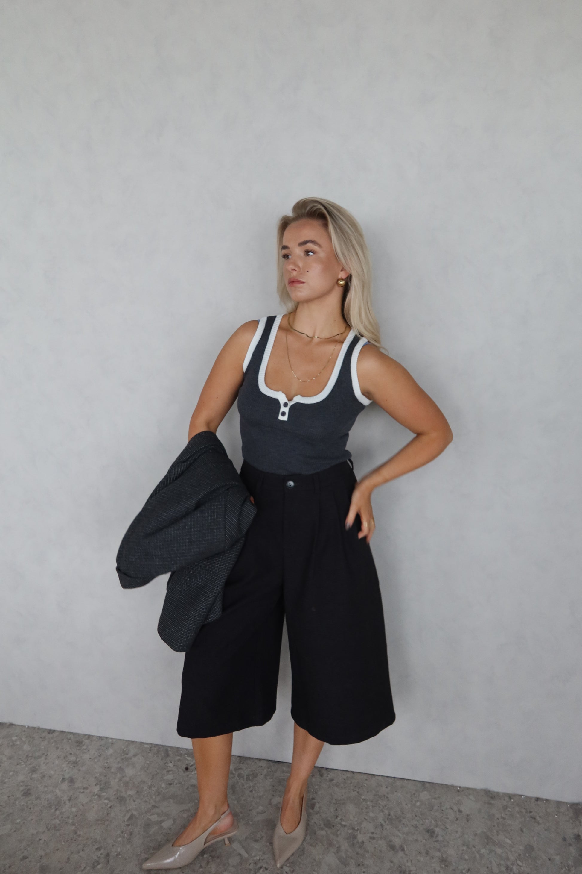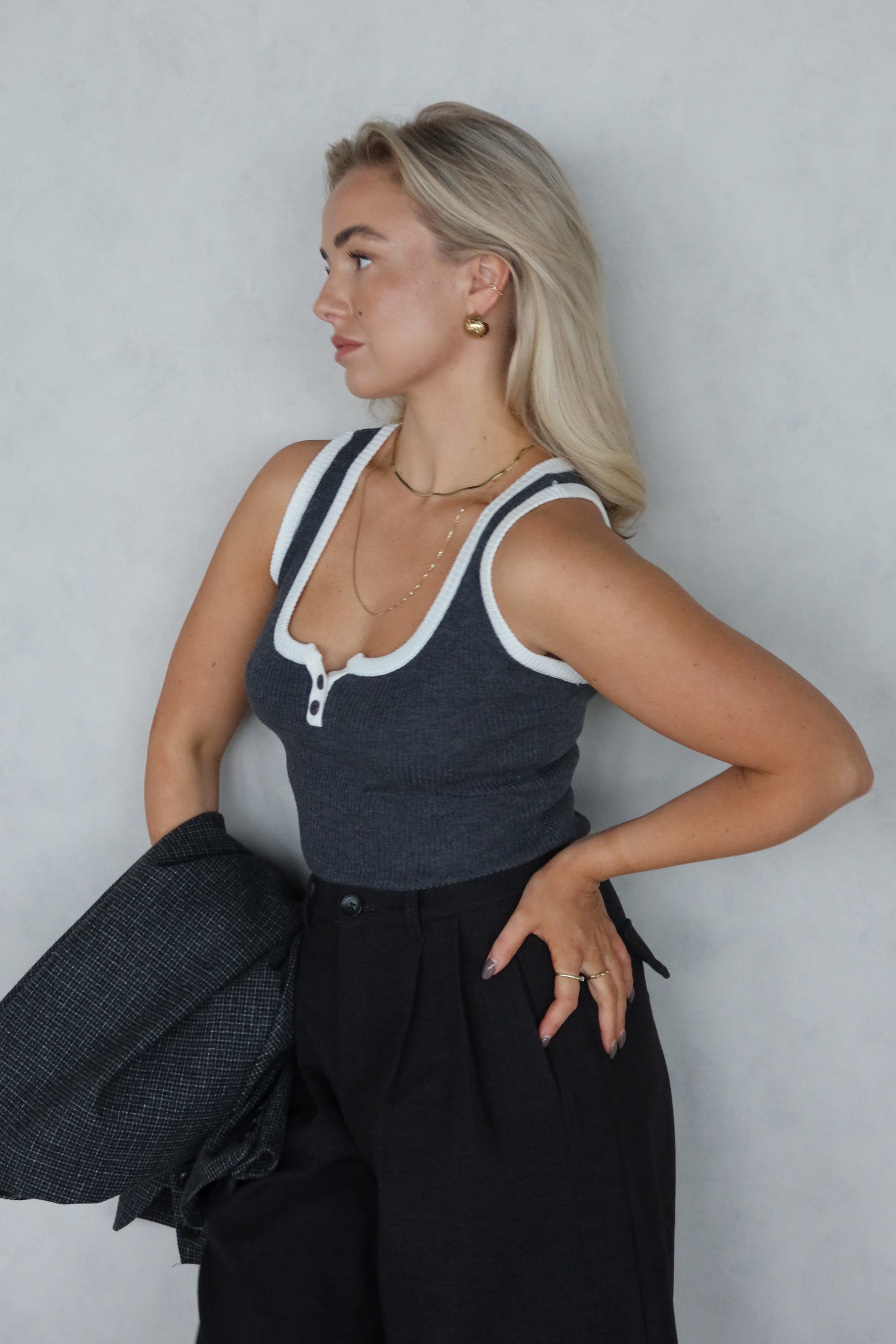 Een elegante top met een verfijnd knoopdetail dat zorgt voor een subtiele, vrouwelijke touch. Gemaakt van een soepele, comfortabele stof die mooi valt en gemakkelijk te combineren is