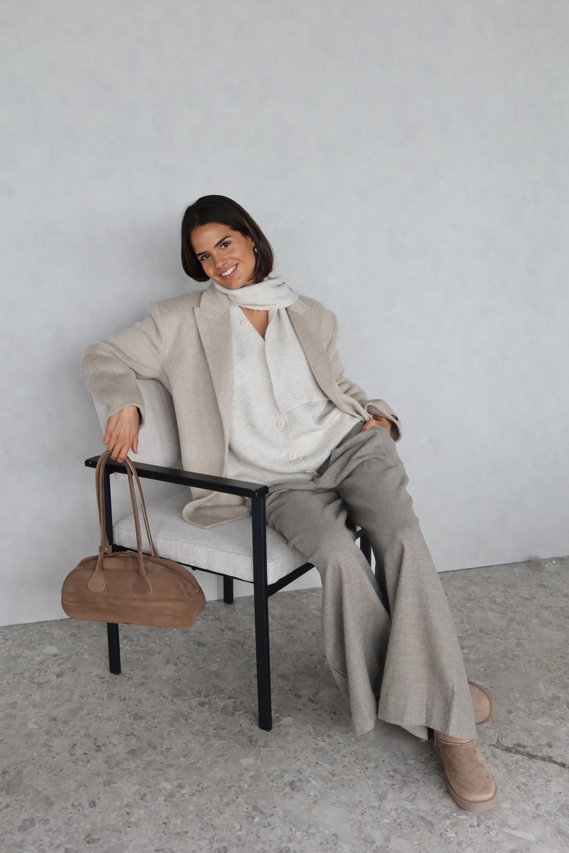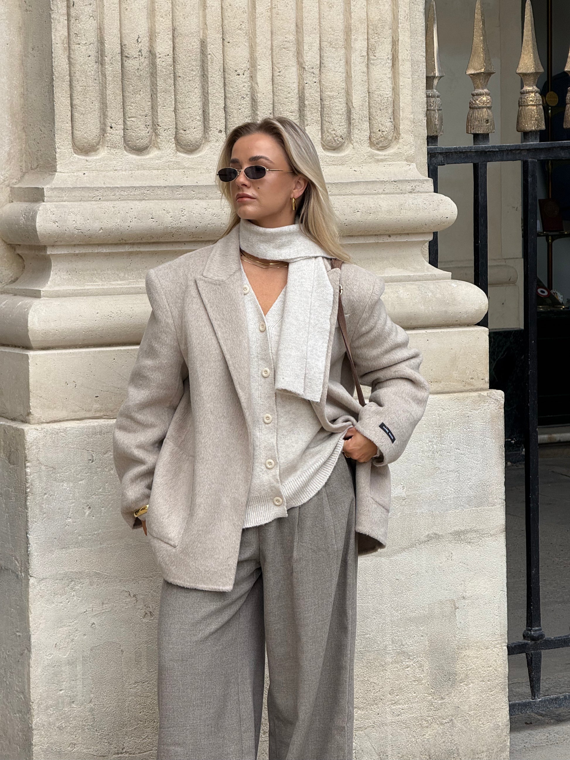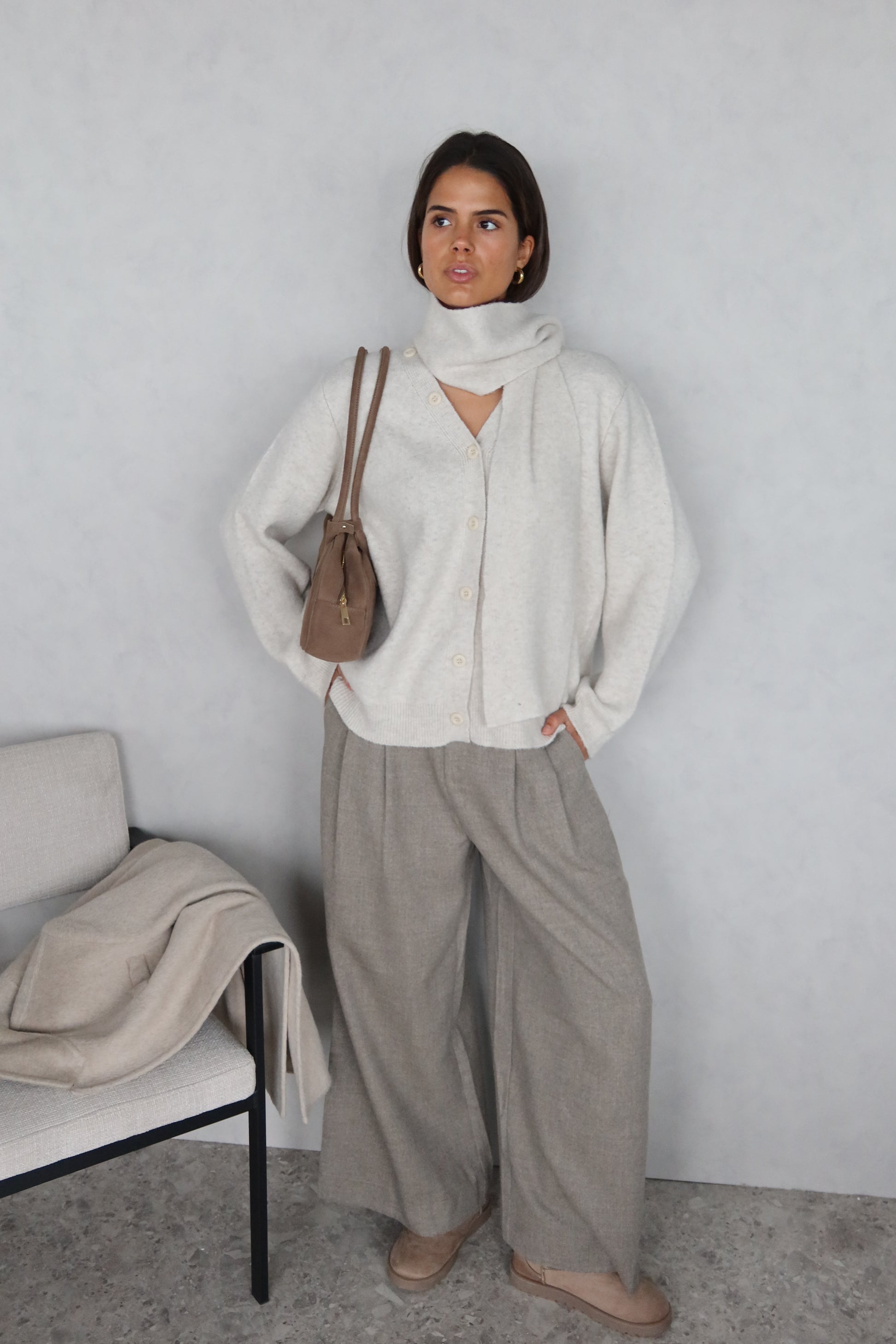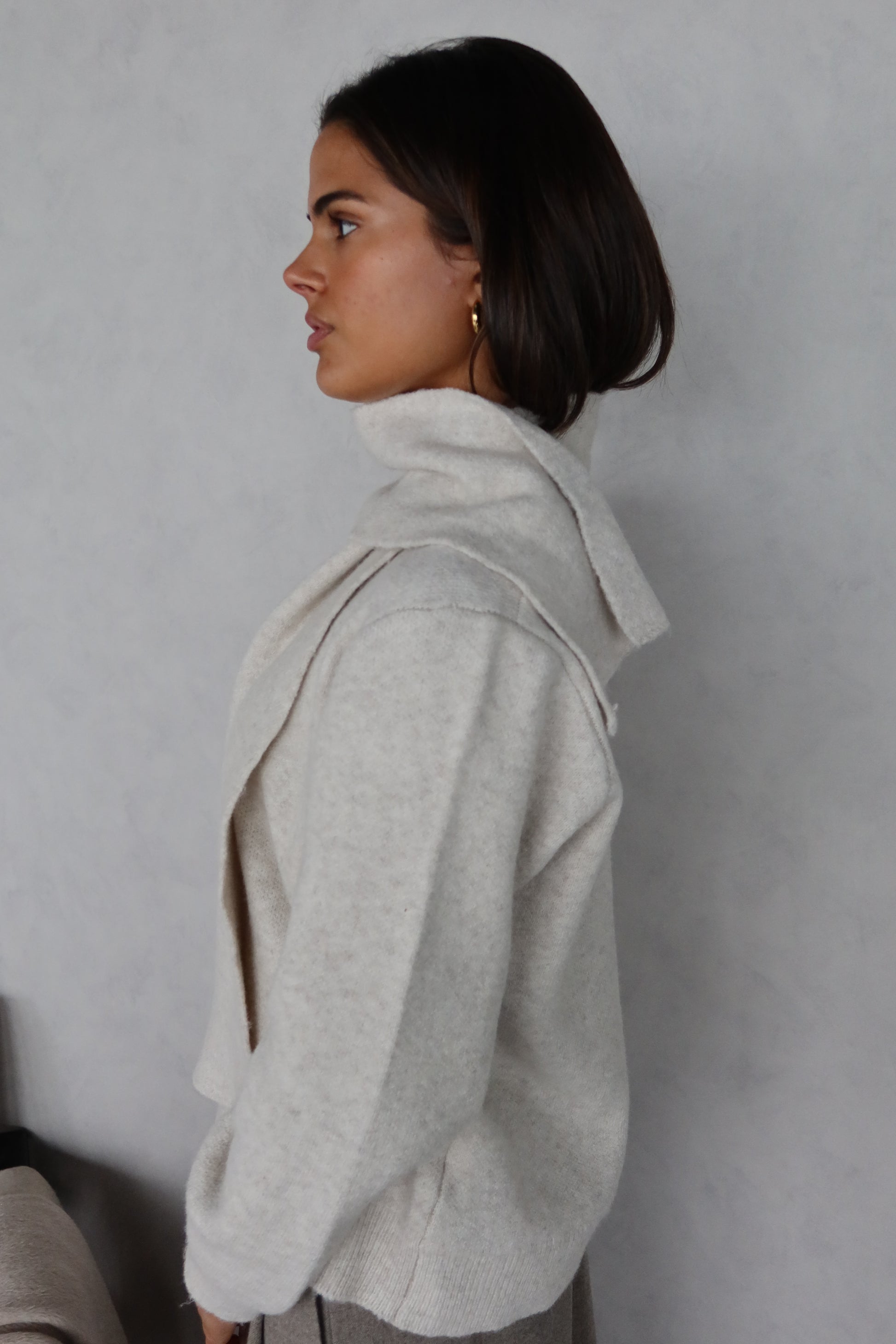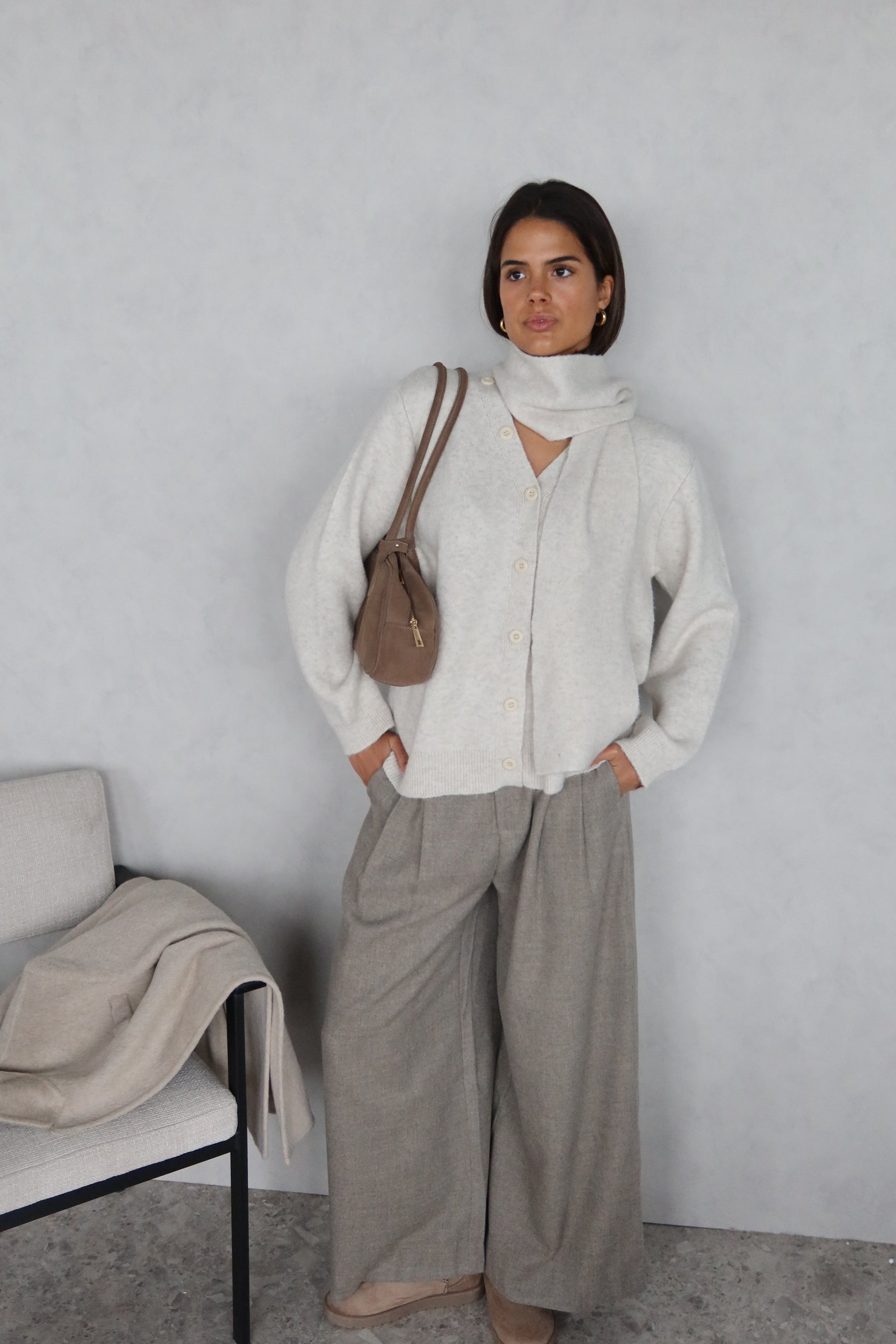 Een zacht crèmekleurig truitje met een bijpassend sjaaltje dat zorgt voor een verfijnde, harmonieuze look. De soepele stof voelt heerlijk aan op de huid en geeft elke outfit een elegante, comfortabele uitstraling.